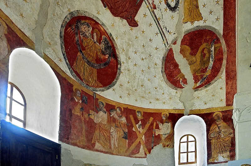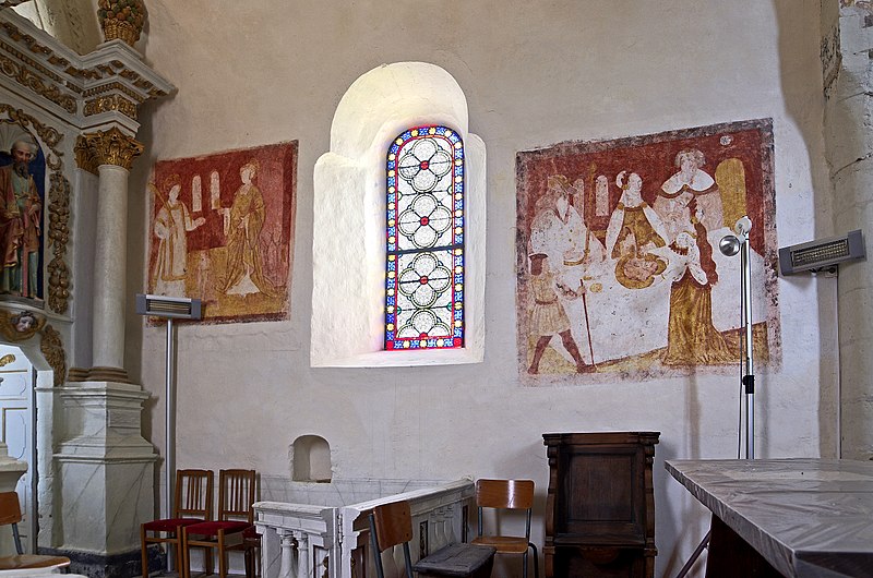 L'église Saint-Jean-Baptiste, située à Bonneveau dans le Loir-et-Cher, se compose d'une nef, d'un chœur de plan carré et d'une abside semi-circulaire. L'arc d'entrée de l'abside retombe sur des pilastres dont les chapiteaux sont sculptés. La partie occidentale de l'édifice a été reprise par l'architecte Marganne en 1844. Le chœur et l'abside, datés du XIIe siècle, ont reçu au début du XVIe siècle une série de peintures murales. Le cul-de-four de l'abside représente, sur un fond étoilé traversé d'un arc-en-ciel, le Père et le Fils accompagnés de la Colombe, trônant devant une tenture brodée d'or et encadrés par deux anges sonnant de la trompette. Au-dessus figurent les quatre évangélistes dans des médaillons. Plus bas, sur une frise au niveau des fenêtres, sont représentés les apôtres. Sur les murs du chœur se distinguent notamment deux scènes de la vie de saint Jean‑Baptiste : la décollation et Salomé présentant la tête du saint à Hérode. L'édifice a été classé au titre des monuments historiques en 1961 pour les parois et les peintures murales de l'abside ainsi que pour les murs du chœur ; le reste de l'église a été inscrit en 2008. Des ressources en ligne et bases patrimoniales, telles que Clochers de France, l'Observatoire du patrimoine religieux et la base Mérimée, proposent des informations complémentaires.