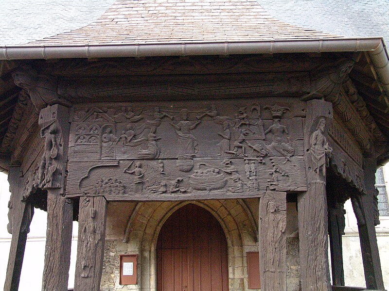 Construction du porche avec des représentations de saints et un fronton figurant le Jugement dernier.