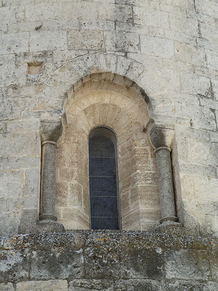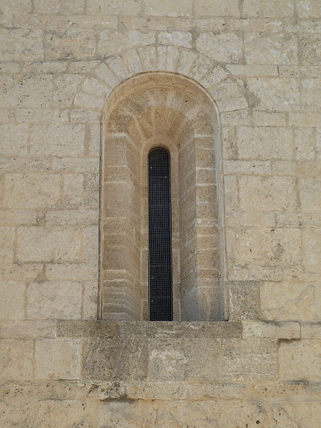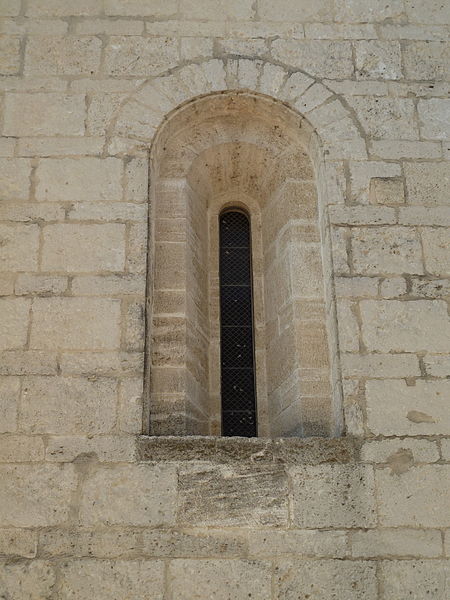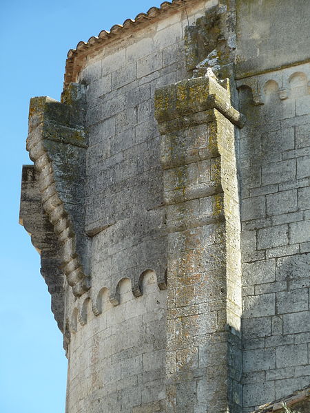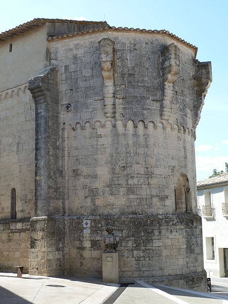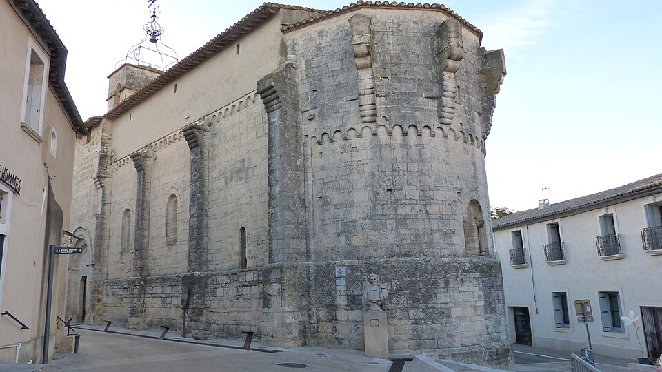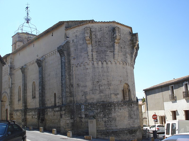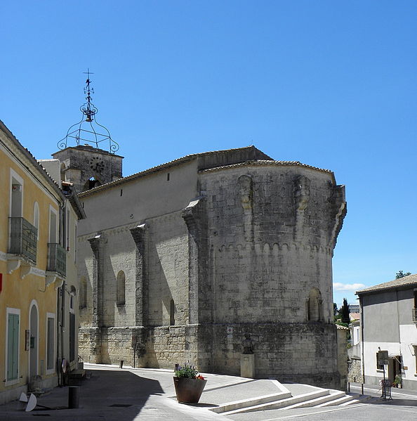 L'édifice, couvert de tuiles, est construit en pierre de taille selon l'appareil alterné dit opus monspeliensis, présent jusque sur le soubassement du chevet et des façades. Le chevet fortifié présente une abside semi-circulaire dont la base se distingue par un double soubassement élevé en raison de la pente du terrain. Au ras du soubassement, une fenêtre axiale en plein cintre à double ébrasement est flanquée de colonnettes couronnées de chapiteaux cubiques, et la partie romane de l'abside se termine par une arcature dont chaque arc est taillé dans un seul bloc. Trois assises au-dessus de ces arcades, la partie supérieure transformée en fortification passe d'un plan semi-circulaire à un plan pentagonal, les maçons du XIVe siècle conservant toutefois l'appareil alterné. La décoration de petites arcatures se prolonge sur les faces latérales sud et nord à la hauteur de la fortification, assurant la transition entre les zones romane et défensive.