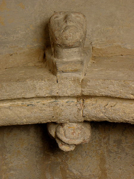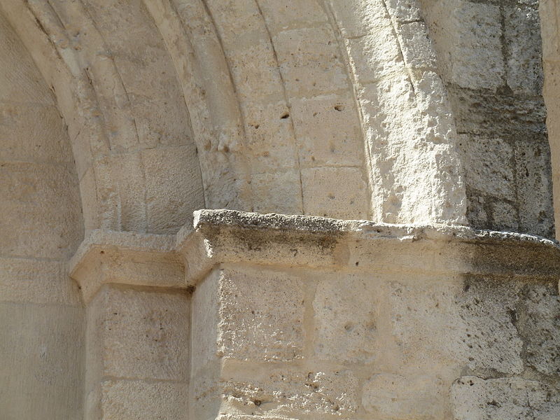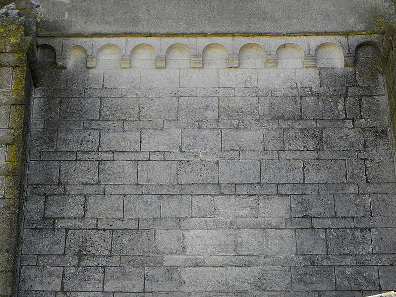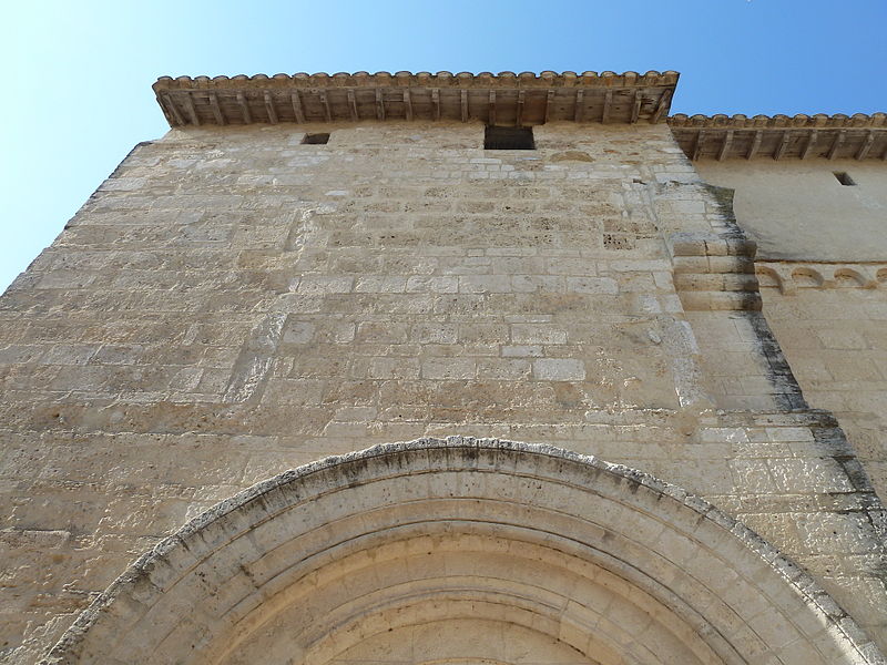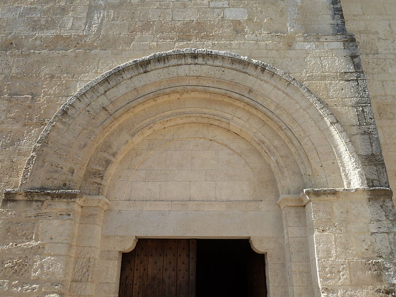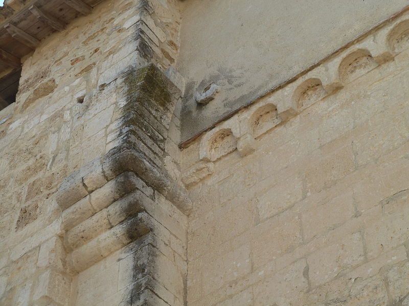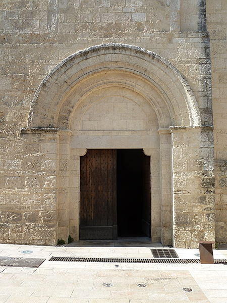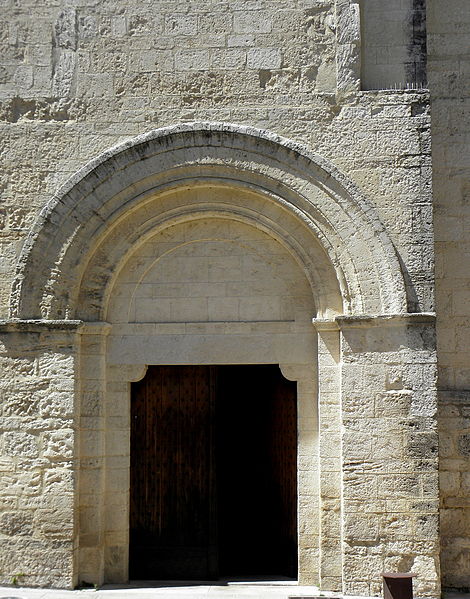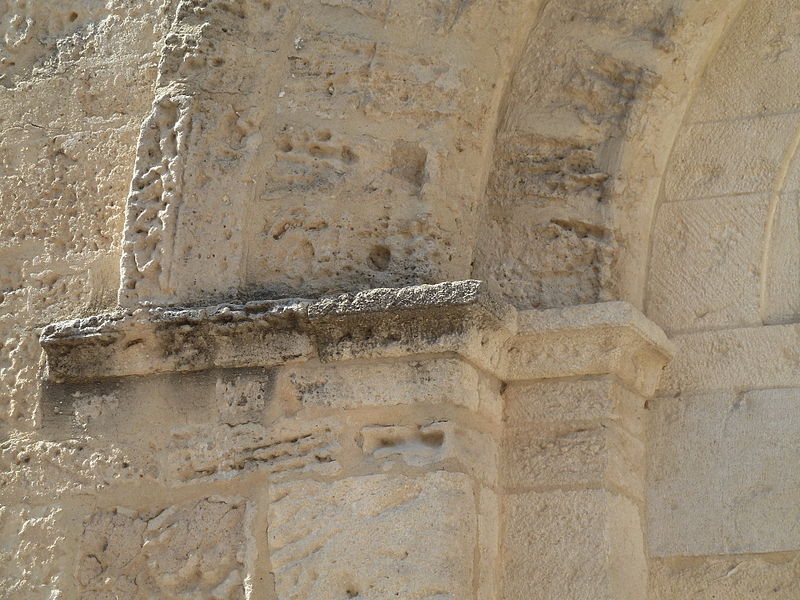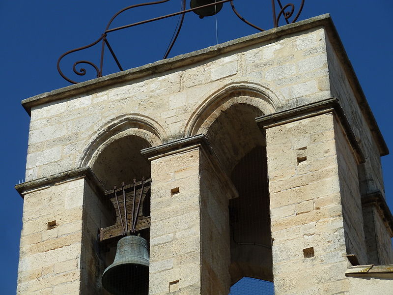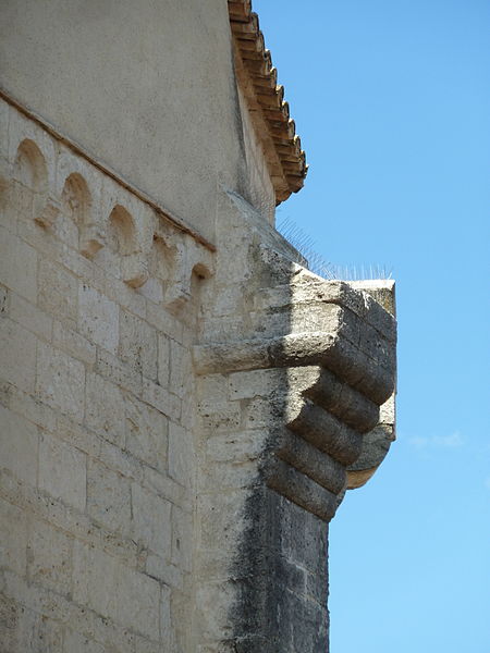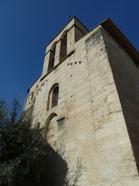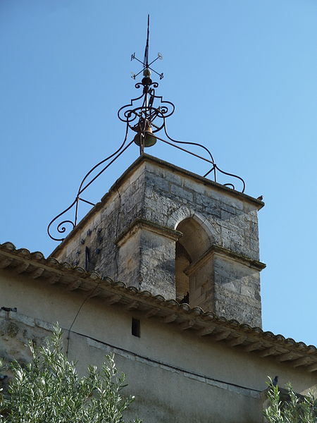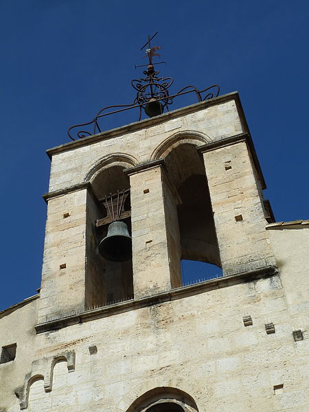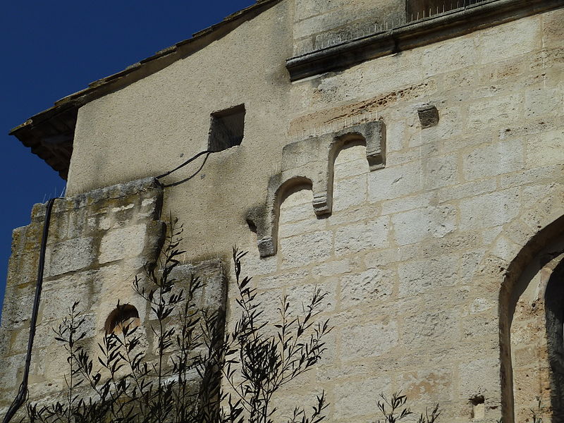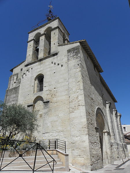 La façade méridionale, organisée en quatre travées dont la travée d'entrée en saillie, est rythmée par de hauts contreforts et percée d'arcades et de fenêtres cintrées à double ébrasement. La travée d'entrée présente un portail en plein cintre à archivolte moulurée ; son puissant linteau soutient un tympan qui reprend le motif de l'opus monspeliensis, présent également sur les piédroits. La façade occidentale montre au rez-de-chaussée une haute arcade aveugle flanquée d'impostes et, dans l'axe, une fenêtre à double ébrasement ; sa partie haute conserve des traces d'arcatures romanes et porte un clocher rectangulaire percé de hautes baies campanaires.