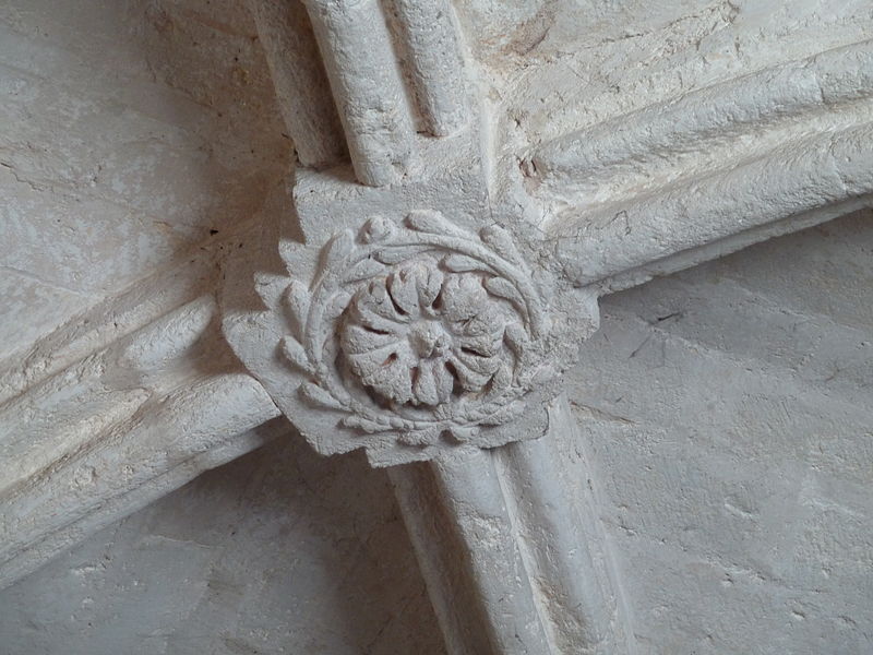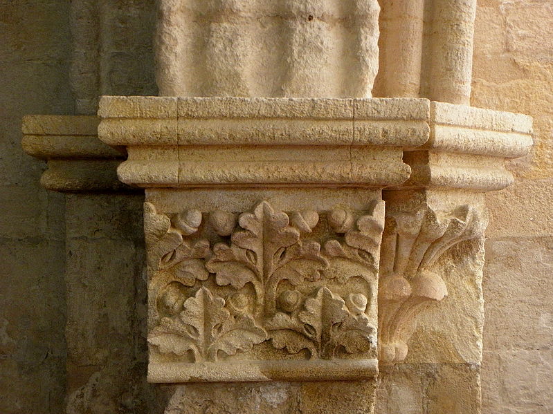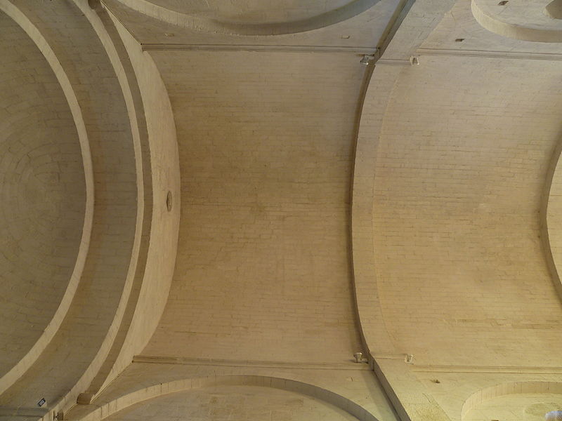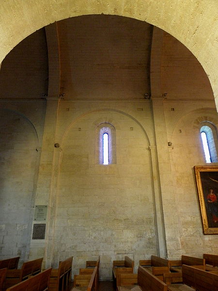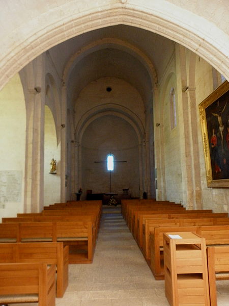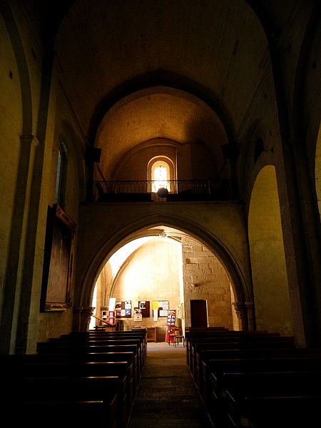 L'intérieur se compose d'une nef unique de quatre travées voûtées en berceau brisé, terminée par une abside en cul-de-four, tandis que les deux chapelles nord sont voûtées d'arêtes. Les murs de la nef, édifiés en opus monspeliensis, sont percés de grands arcs de décharge ; la première travée, au niveau du portail, est partagée en deux niveaux par une tribune dont la datation est incertaine (XIIIe ou probablement XVe siècle selon les sources).
