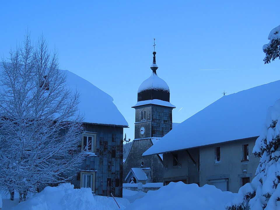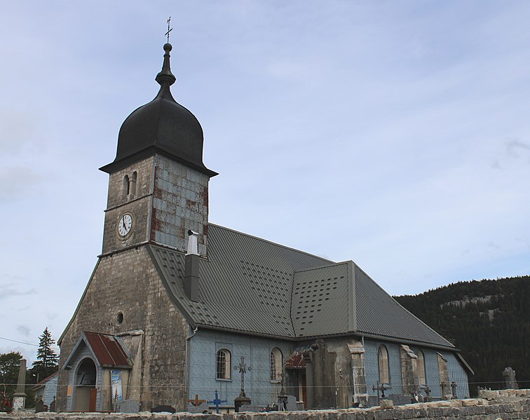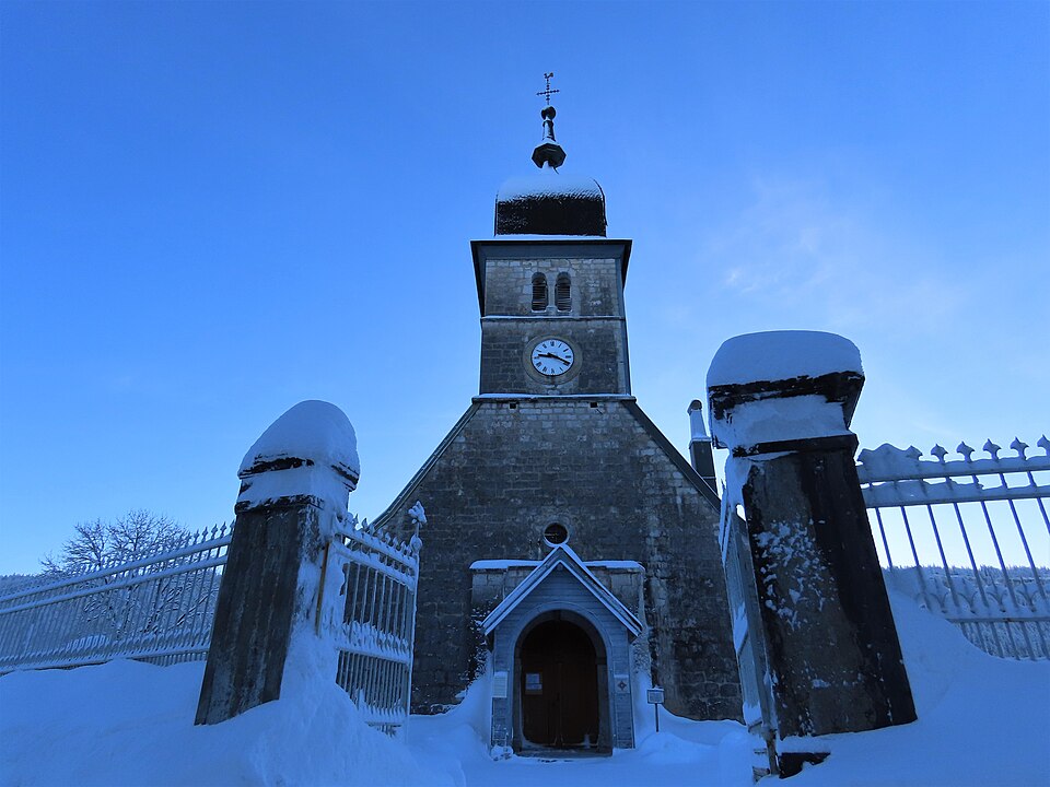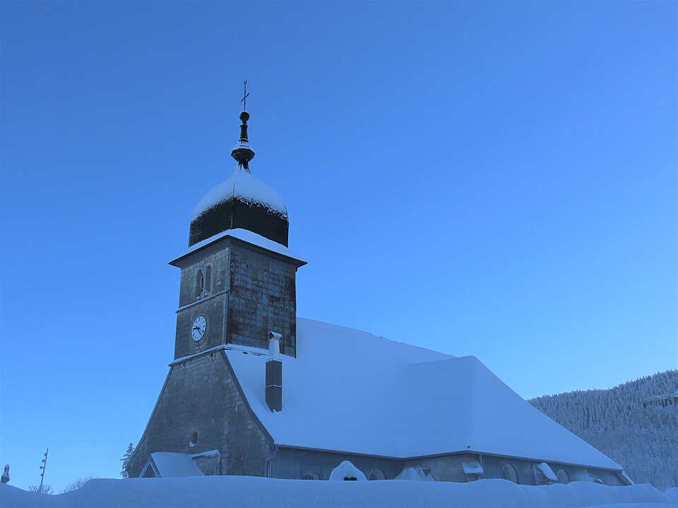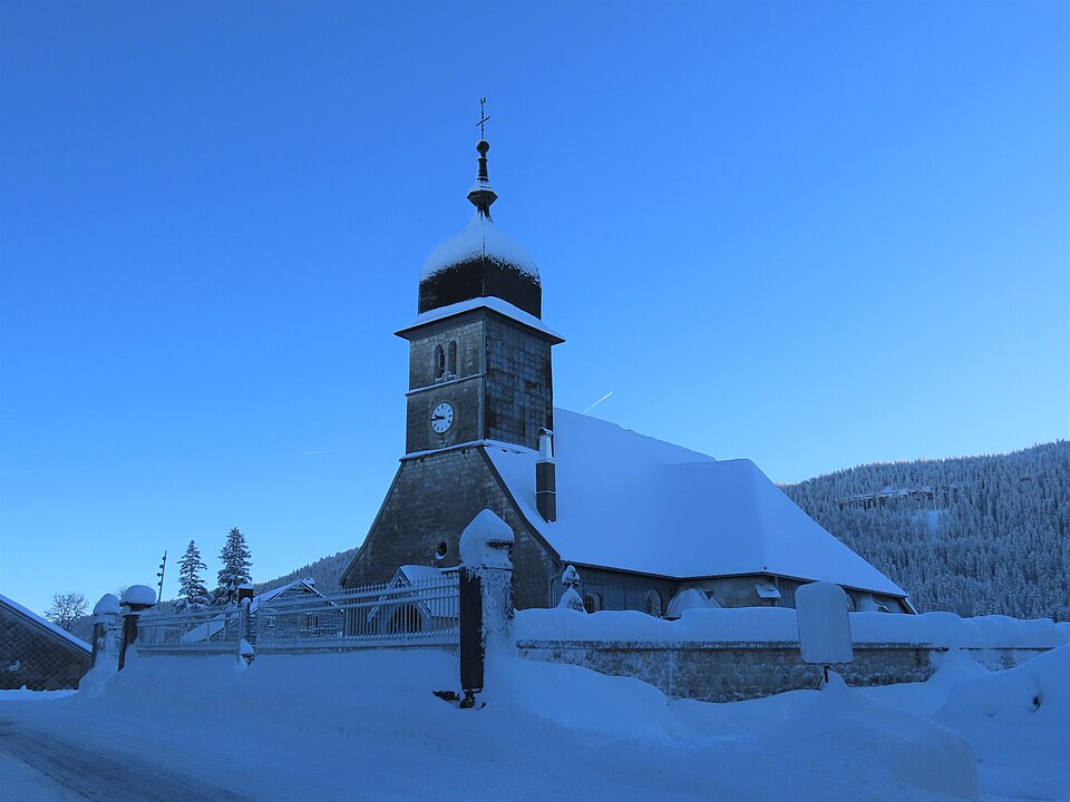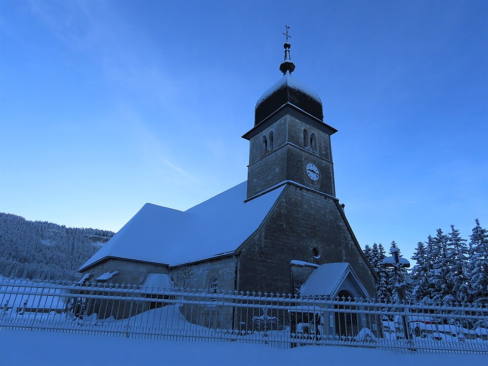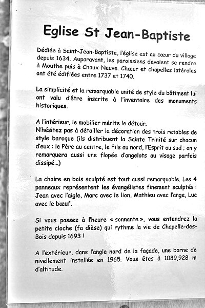 L'église Saint-Jean-Baptiste de Chapelle-des-Bois se situe à Chapelle-des-Bois, dans le département du Doubs. Elle a été construite en 1634, remaniée dans la première moitié du XVIIIe siècle (mentions datées de 1733 et 1738) et dotée d'une sacristie droite au XIXe siècle. L'édifice est inscrit au titre des monuments historiques depuis le 2 mars 1981. Il fait partie de la paroisse de Mouthe, rattachée au diocèse de Besançon. L'église présente un plan allongé avec trois nefs couvertes de voûtes d'ogive. Le clocher est surmonté d'un dôme à l'impériale, caractéristique de la Franche-Comté, et la toiture est un toit à longs pans en métal. Plusieurs éléments du mobilier sont protégés en tant qu'objets aux monuments historiques : l'ensemble du maître-autel, daté de 1743 et richement décoré, est classé depuis le 12 février 1981, de même que les autels latéraux droit et gauche, datés de 1748. Sont inscrits à titre d'objets des lustres en bronze et cristal du XVIIIe siècle (inscrits en 1981), des chandeliers d'autel en cuivre (inscrits en 1981), un Christ en croix du XVIIe siècle (inscrit en 1980), un tableau de la Visitation (inscrit en 1980), la chaire à prêcher (inscrite en 1979) et une statue de Saint Jean-Baptiste (inscrite en 1978).