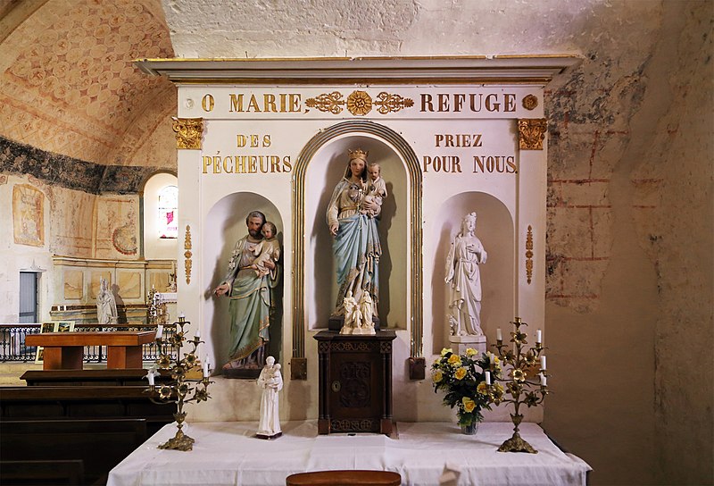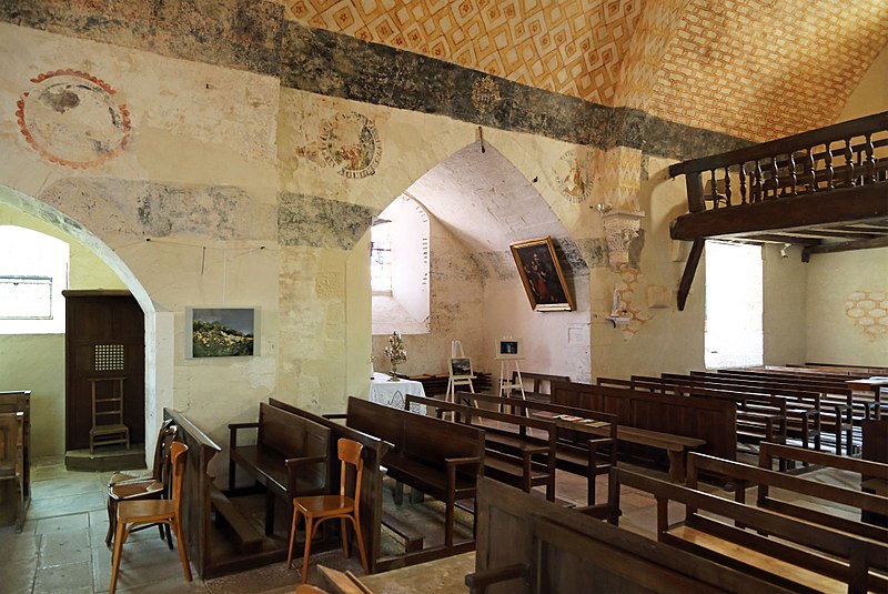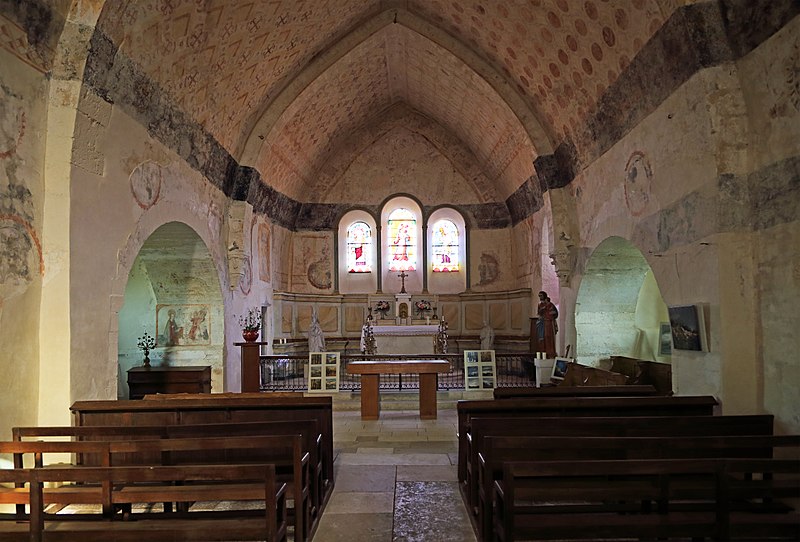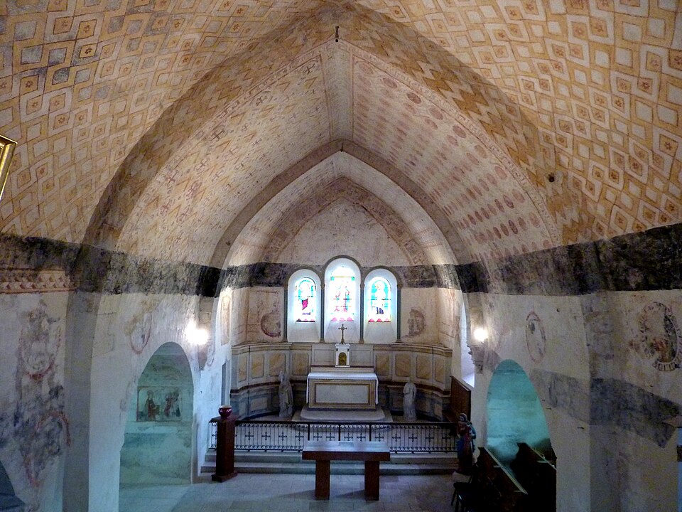 Un décor peint couvrait à l'origine la totalité de l'édifice. Sur l'ensemble des murs, un maillage géométrique hexagonal du XIIe siècle subsiste par endroits, notamment sur le mur du fond, le mur sud et dans le chœur. Les voûtes portent des peintures des XIIe et XIIIe siècles dont la complexité augmente de l'entrée vers le chœur : la première travée présente un motif géométrique entrelacé formant un maillage, la deuxième des lignes brisées formant des losanges dont certains renferment une fleur à six pétales, la troisième comporte au nord des losanges jaunes ornés d'un chevron ou d'une croix pattée rouge et au sud des médaillons avec des fleurs de lys, tandis que le chœur accueille des lions et des aigles héraldiques inscrits dans des médaillons.