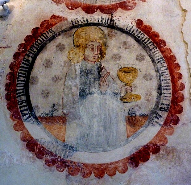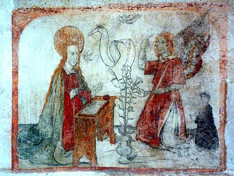 Parmi les peintures figuratives, une composition du XIIIe siècle dans le chœur montre, de part et d'autre des vitraux, huit personnages debout représentant les apôtres en procession qui regardent vers un Christ en majesté situé au centre du mur est, partie presque entièrement effacée. Sur le mur nord du chœur, au-dessus de la porte de la sacristie, une Vierge en majesté du début du XIVe siècle a probablement été peinte pour camoufler le rebouchage d'une fenêtre supprimée lors de la construction de la sacristie. La chapelle nord conserve une Annonciation de la seconde moitié du XVe siècle particulièrement bien préservée. Tout autour de l'église, en haut des murs, des médaillons datés de la fin du XVe ou du début du XVIe siècle représentent les apôtres ; certains sont très effacés, d'autres restent identifiables par leur attribut.
