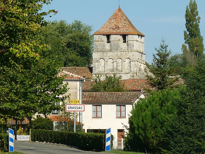 Grassac était le siège d'un archiprêtré, donné en 1097 par l'évêque Adhémar à l'abbaye de Bourgueuil, qui l'unit à son prieuré Notre-Dame de Beaulieu à Angoulême. L'église fut agrandie après les dommages de 1570 par l'adjonction d'un bas-côté nord destiné à être voûté d'ogives. La voûte prévue et divers travaux de restauration furent entrepris au XIXe siècle. Le plan de l'édifice est celui d'un rectangle prolongé par une travée sous clocher et une abside prolongeant la nef initiale. La première nef, soutenue par des contreforts plats et un contrefort saillant daté du XVIIe siècle, est couverte d'un berceau plat en plâtre. La travée sous clocher est voûtée d'une coupole en pierre sur trompes, percée d'un orifice pour la cloche et ornée d'un faux ciel.