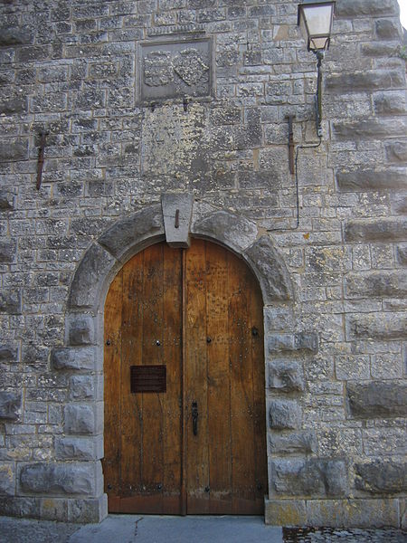 Achèvement de l'église avec l'inscription des noms des fondateurs au-dessus du porche.