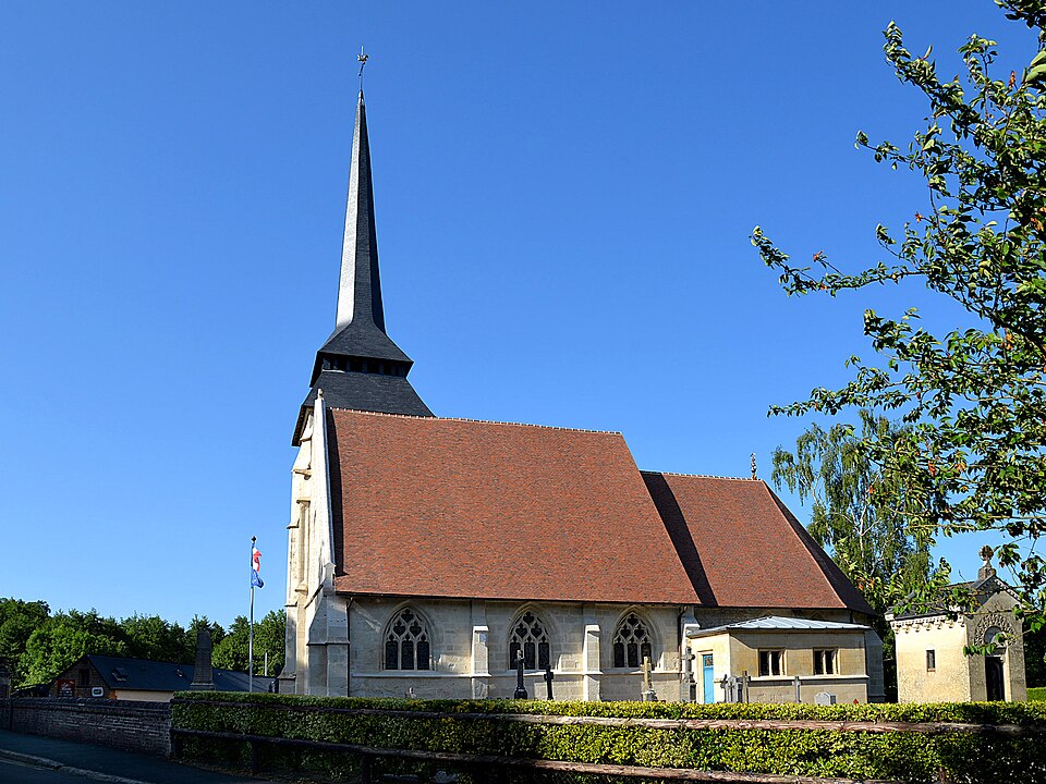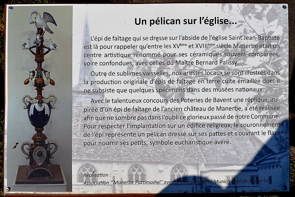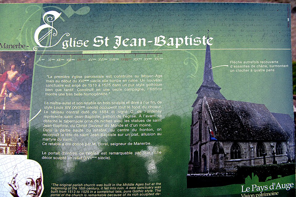 L'église Saint-Jean-Baptiste, située dans le bourg de Manerbe dans le Calvados, est une église catholique entourée du cimetière. Datée du XVe siècle, elle est inscrite au titre des Monuments historiques depuis le 17 juillet 1926. Au Moyen Âge, Manerbe comptait trois églises dédiées à saint Jean-Baptiste, saint Sauveur et Notre-Dame ; l'église Saint-Sauveur est connue avant l'an mil et la paroisse dépendait de l'évêché de Bayeux. L'édifice actuel a été construit en une seule campagne entre 1513 et 1525 pour remplacer un bâtiment antérieur d'origine romane ; parmi les artisans locaux intervenus figurent Guillaume Vitet et Richard et Robert Lévêsque. Le patronage appartenait au seigneur local, qui présentait trois candidats pour la cure, le titulaire étant finalement désigné par l'évêque. Dix vitraux datés de 1920 ont été réalisés par le maître verrier chartrain Charles Lorin en collaboration avec le peintre Lionel Roger et sont répertoriés à l'Inventaire général du patrimoine culturel, tandis qu'Arcisse de Caumont signale la présence de fragments de vitraux de la Renaissance. Une association de valorisation du patrimoine a été fondée en 2010 ; en 2021, l'Association pour la sauvegarde de l'art français a accordé une subvention de 7 000 € pour la restauration du clocher, et à l'initiative de l'Association Manerbe patrimoine la maçonnerie extérieure ainsi que la toiture de la nef et de la flèche ont été restaurées en 2024, avec la pose d'un épi de faîtage en céramique. L'édifice a fait l'objet de travaux de restauration et un panneau d'information a été installé devant l'église. L'ancienne église romane, de forme cruciforme, a vu la reconstruction adopter le style gothique flamboyant sans rétablir les transepts ; la nouvelle composition présente une nef unique de six travées. Une tour de quatre étages prolonge le portail et le pignon comporte un oculus ; la nef est couverte en tuiles, la flèche en ardoises, et le chevet est pentagonal ; la flèche est décrite comme « extrêmement haute et pointue ». Le portail, de style Louis XIV, provient de l'abbaye du Val-Richer ; la nef est renforcée par deux contreforts d'un côté et trois de l'autre, avec des fenêtres ogivales, et un arc triomphal sépare le chœur de la nef ; la sacristie se trouve au côté méridional. L'intérieur conserve un autel principal en bois polychrome daté de 1694-1698 ; le retable abrite un tableau représentant Saint Jean-Baptiste au désert daté de 1684, peint par Claude II de Fontenay, et comporte trois statues (saint Jean-Baptiste, le Sauveur et un saint moine). Le haut du retable porte la représentation de la tête de saint Jean-Baptiste sur un plat et les armoiries du donateur figurent dans un cartouche au‑dessus du tableau ; l'antependium, daté de 1698, présente des motifs floraux attribués à un artiste ayant œuvré à l'abbaye du Val-Richer. L'édifice conservait également sur les autels des candélabres provenant de cette abbaye. Parmi les éléments remarquables figurent le retable central, la poutre de gloire et des graffitis anciens.
