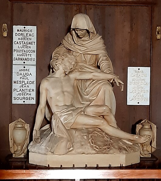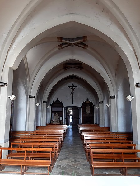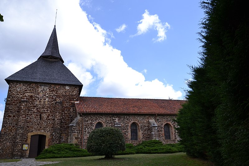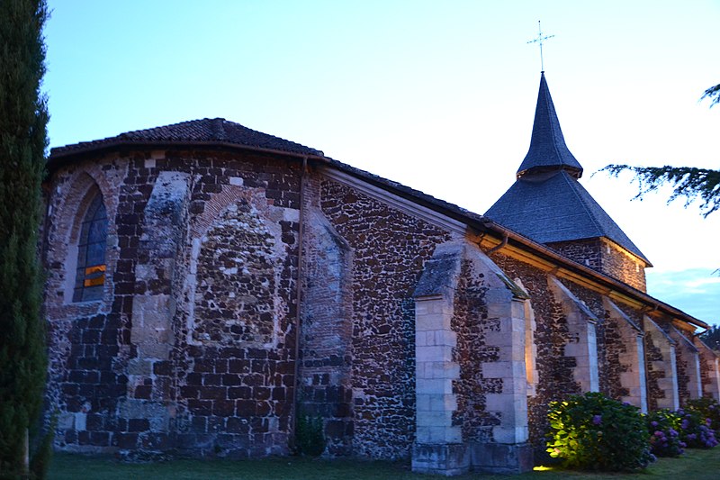 Les Hospitaliers de l'ordre de Saint-Jean de Jérusalem sont à l'origine de l'implantation religieuse sur ce site, fondée sur les bases d'une église romane défensive du XIIe siècle aujourd'hui disparue. L'édifice actuel a été reconstruit au XIVe siècle ; la tour carrée du clocher, la plus ancienne partie conservée, remonte à cette époque. Les dispositions défensives de la tour — murs épais, meurtrières et emplacement probable de mâchicoulis — suggèrent qu'elle servait de refuge pour les habitants en cas d'agression. La voûte en ogive de la nef centrale et du chœur a été réalisée au XVe siècle pour accroître la lumière, accompagnée de fenêtres ornées de vitraux dont la rénovation date d'environ 1890. Une porte latérale, appelée traditionnellement porte des lépreux ou des cagots, a été murée à une date inconnue mais reste visible de l'extérieur.