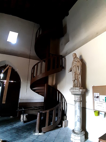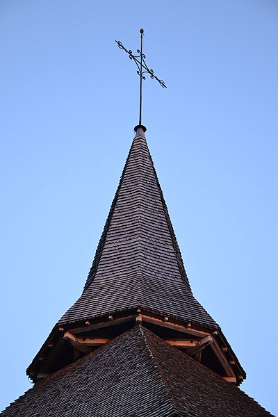 Le clocher a connu plusieurs transformations : les archives signalent une forme octogonale rebâtie en 1697, son remplacement au début du XXe siècle par une chambre de cloches carrée (1909 ou 1911 selon les sources), puis la restitution de sa forme octogonale après 1969 avec une reconstruction effective en 1977 ; il a reçu un revêtement en bardeaux de châtaignier en 2010.
