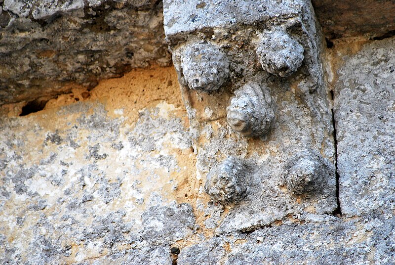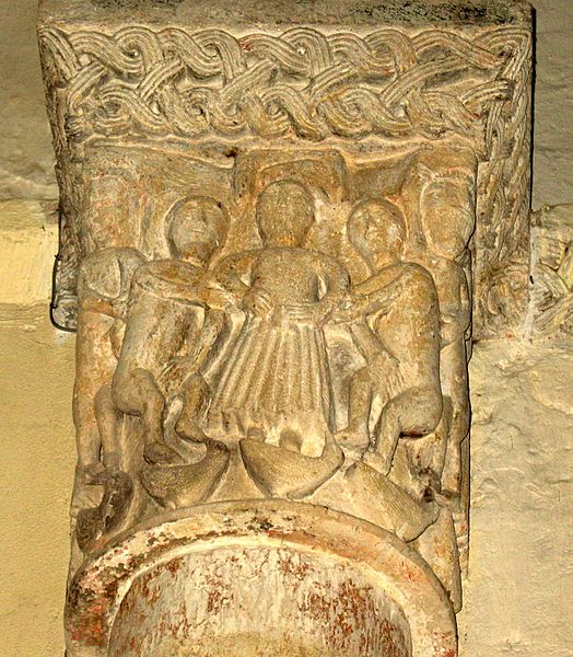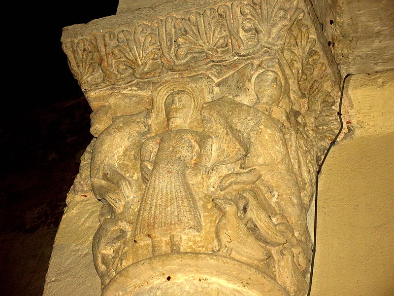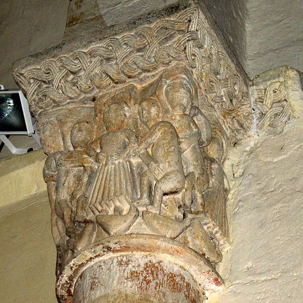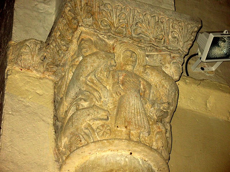 L’arc triomphal s’appuie sur deux chapiteaux dont la lecture détaillée a fait l’objet d’analyses distinctes. L’un présente une scène identifiée comme « Daniel entouré de lions et d’oiseaux » avec un tailloir orné de rinceaux et de palmettes ; l’autre montre, sur sa face antérieure, une figure centrale encadrée par hommes nus et personnages vêtus, posés au‑dessus d’oiseaux. L’analyse approfondie de Bougoux propose une interprétation plus complexe : sur une corbeille apparaissent un danseur barbu au centre, des hommes nus qui l’entourent et des oiseaux agissants qui picorent et saisissent les plis des vêtements, formant une scène de danse associée à des comportement licencieux ; le chapiteau opposé représente une danseuse entourée de chiens et d’oiseaux, eux aussi focalisés sur le mouvement de la femme. Ces deux chapiteaux sont ainsi compris comme une mise en garde contre les excès moraux de la danse profane et les débordements sexuels qu’elle entraîne.