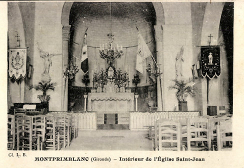 L’église Saint-Jean-Baptiste de Monprimblanc, située dans la partie ouest du bourg de la commune de Monprimblanc en Gironde, est mentionnée pour la première fois en 1326. La partie romane pourrait remonter à la fin du XIe siècle ou au XIIe siècle ; la nef et le chœur sont attribués à cette période et l’arc triomphal retombe sur deux chapiteaux historiés. Le chevet conserve sa corniche portée par des modillons et un étage de défense ajouté aux XVe ou XVIe siècles, percé de fentes de tir. À l’origine, l’édifice se composait d’une nef terminée par une abside semi-circulaire voûtée en cul-de-four ; une partie d’un clocher-mur subsiste au niveau de l’arc triomphal. La chapelle méridionale a été ajoutée au XVIIe siècle, la sacristie septentrionale au XVIIIe siècle et le mur sud de la nef a été reconstruit en 1785. La chapelle nord, qui forme un faux transept avec la chapelle sud, a été édifiée dans les années 1830 et des peintures en trompe-l’œil néo-gothiques y ont été réalisées à ce moment. L’architecte bordelais Edmond-Jean Hosteing a transformé la partie ouest par l’édification d’un clocher-porche en 1887-1888 ; la sacristie sud a été construite entre 1887 et 1909. Une croix de cimetière, datée de la fin du XVe siècle, se dresse dans l’enclos qui entoure l’église. L’abside romane est inscrite au titre des monuments historiques par arrêté du 29 décembre 1981.