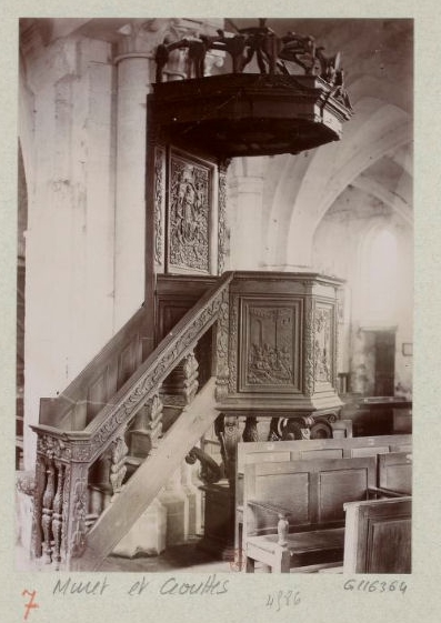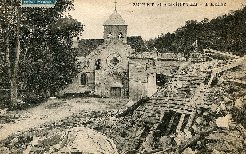 L'église Saint-Jean-Baptiste de Muret-et-Crouttes, dans l'Aisne, est élevée sur un tertre près de l'entrée du château. Elle appartient à diverses époques : on reconnaît le XIIe siècle pour deux travées de la nef, le XIIIe siècle pour le portail et le XVIe siècle pour le reste. Le plan est rectangulaire avec une abside en saillie ; la nef principale mesure 30 mètres de longueur et 8 mètres de hauteur. Les cinq travées de la nef, dont deux datent du XIIe siècle, sont séparées par des piliers carrés et reposent sur des bans à griffes, couronnés de chapiteaux ornés de palmes et de crochets. Antoine de Roye, mort à la bataille de Marignan, y fut inhumé. Le principal ornement de l'édifice est une chaire sculptée et dorée provenant de l'abbaye Saint-Jean-des-Vignes de Soissons. Des vues anciennes montrent l'église au pied du château vers 1910, près des ruines du château en 1920, ainsi que la chaire elle-même. L'édifice est inscrit au titre des monuments historiques en 1927.