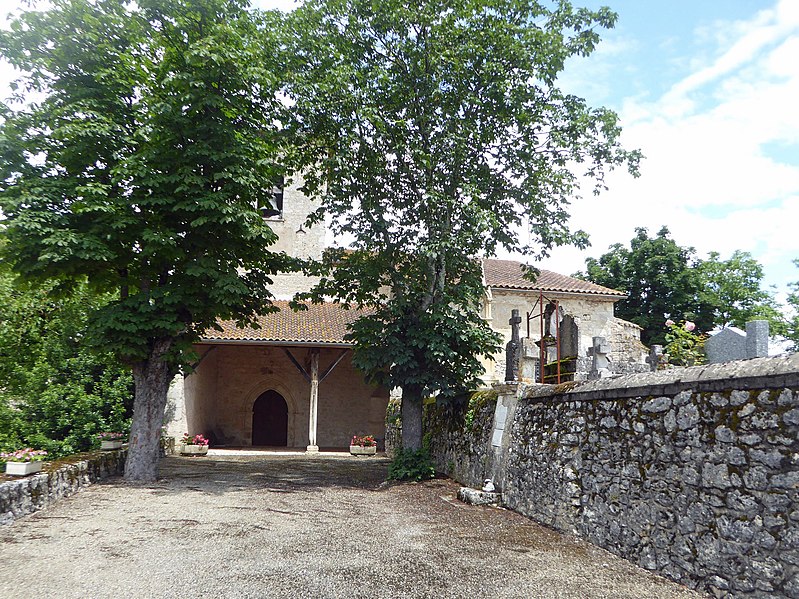L'église est mentionnée en 1278. En 1520, elle était annexe de l'église de Beauville et faisait partie de l'archiprêtré d'Opere et de Pujols ; la paroisse dépendait directement de la seigneurie de Roquecor. C'est un petit édifice de deux travées voûtées d'ogives, pourvu de liernes et de tiercerons. L'abside et le portail datent du XIIIe siècle. La nef et les chapelles latérales ont été reconstruites à la fin du XVe siècle ; les voûtes de la deuxième travée de la nef et celles des chapelles ont été refaites, semble-t-il, au XVIIIe siècle. Les absides et les chapelles ont été peintes par Gaillard Lala en 1923.