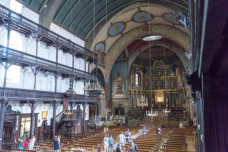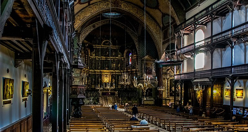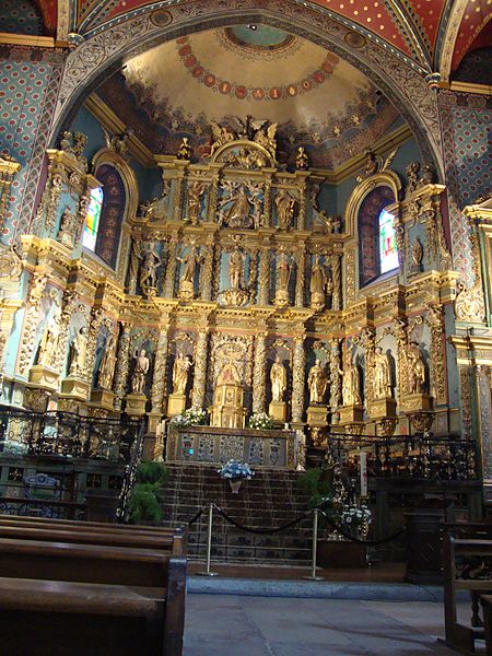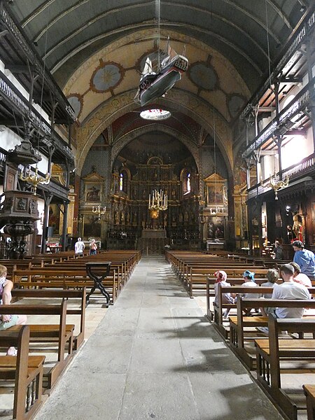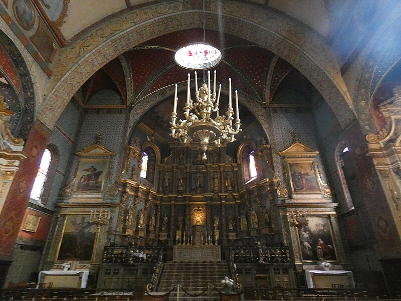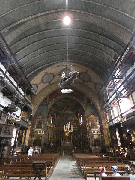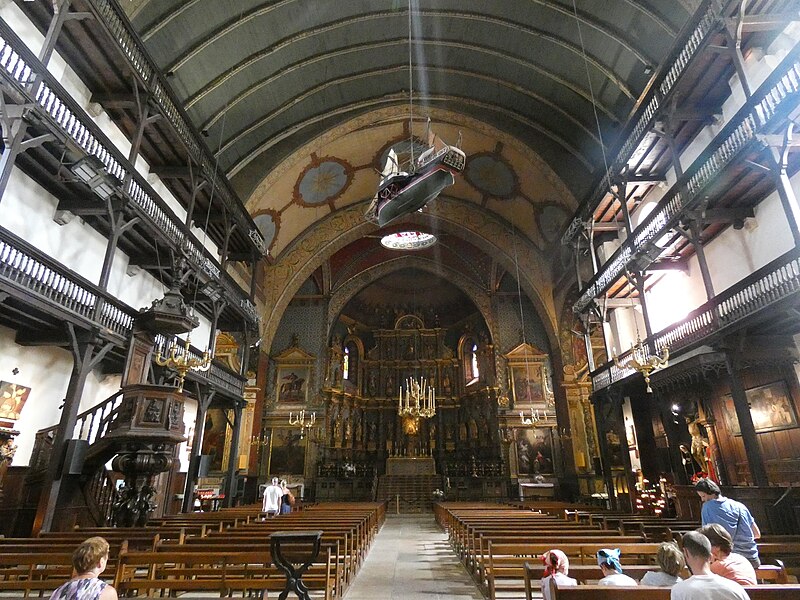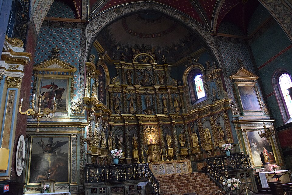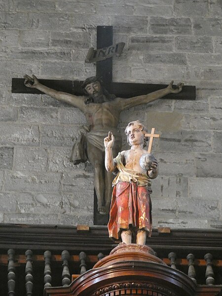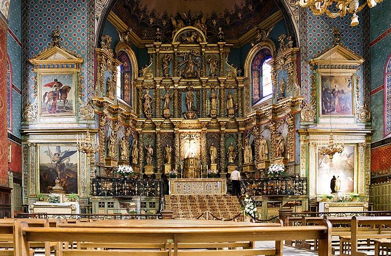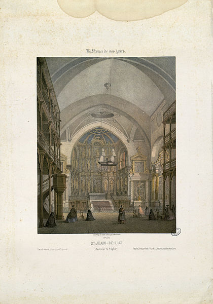 L'église Saint-Jean-Baptiste de Saint-Jean-de-Luz (Pyrénées-Atlantiques) est célèbre pour le mariage de Louis XIV et de l'infante Marie-Thérèse d'Espagne, célébré le 9 juin 1660, et pour son retable monumental en bois doré du XVIIe siècle. Le site comporte une longue histoire : une église romane existait déjà au XIIe siècle, et des vestiges de l'édifice gothique du XVe siècle restent visibles, notamment un pilier, des nervures et des fenêtres murées aux murs ouest et sud. L'édifice actuel conserve aussi trois fenêtres ouvragées du tournant XVIe–XVIIe siècle, munies à l'intérieur de coussièges, petits bancs de pierre en vis‑à‑vis. Les murs de la nef, entourés de galeries et surmontés d'une tribune adossée au mur occidental, illustrent un type d'église caractéristique du Pays basque français. Ces galeries à trois niveaux furent élevées à la suite des procès de sorcellerie de 1576 ; la répression ramena une affluence qui nécessita d'augmenter la capacité des édifices sans les démolir, en construisant tribunes et galeries ; la nef devint alors l'espace réservé aux femmes et les galeries à celui des hommes. En 1630, les autorités locales décidèrent d'agrandir l'église, alors insuffisante pour une population en croissance ; les travaux, interrompus à plusieurs reprises, s'étendirent sur un demi-siècle. Seuls furent conservés de l'ancienne église le mur sud et la tour-clocher ; le mur sud fut allongé jusqu'au nouveau chœur et la porte ouverte en 1650 fut celle qui servit au mariage royal. Au nord, un nouveau mur parallèle fut édifié en récupérant des pierres de l'ancien, et une porte y fut ouverte en 1663 ; la dernière ouverture aux angles fut comblée en 1672, mettant fin aux infiltrations. Un escalier intégré à l'angle conduisit à la première galerie en 1675 ; au sud, l'escalier de bois fut remplacé par un escalier de pierre en 1750, dont la balustrade en fer forgé date de 1755. La tour-clocher reçut un étage supplémentaire en 1685 ; sa flèche fut frappée par la foudre le 27 novembre 1706 et la flèche incendiée fut remplacée par un toit plat de tuiles, resté depuis. Le grand portail fut ouvert entre 1663 et 1671, et la porte dite « du mariage de Louis XIV » fut murée autour de 1669. Dans les années 1760–1761, les grandes baies du mur sud et celle du mur nord furent percées sur les conseils du peintre Joseph Vernet. Pendant la Révolution et les guerres de l'Empire, l'église fut utilisée comme magasin à fourrage puis comme hôpital militaire, subissant des dégradations notables. Les décors intérieurs furent transformés au XIXe siècle : en 1884, les murs du chœur et la voûte, jusque-là blanchis à la chaux, furent recouverts de motifs peints d'inspiration néogothique. L'édifice, d'une hauteur sous voûtes de 20 m et d'une longueur de 48,60 m, présente des largeurs variables selon les travées, et son clocher atteint 35 m ; l'ensemble a été classé aux Monuments historiques le 7 mars 1931. Le retable en bois doré qui occupe tout le mur de fond de l'abside est orné de dix‑huit statues de saints, de deux allégories, de la colombe de l'Esprit‑Saint, d'une figure de Dieu le Père et d'un pélican symbolique entourant le tabernacle, ainsi que de colonnades torses sculptées de pampres, fleurs, oiseaux et putti. Réalisé et mis en place en 1669 par l'entrepreneur-menuisier Martin de Bidache, ce retable de grandes dimensions respecte les canons classiques et les motifs antiques en vogue à l'époque ; Joannis de Haraneder-Monségur est souvent cité comme maître d'ouvrage probable. Le retable a été classé au titre des Monuments historiques le 5 décembre 1908. Parmi les éléments remarquables de l'intérieur, l'antependium brodé de perles de verre coloré aurait été offert par Louis XIV lors du mariage ; l'autel est surélevé de douze marches, avec la sacristie placée en dessous. Les galeries entourent la nef sur trois côtés, caractéristique des églises du Labourd et encouragée dès 1556 par l'évêque de Bayonne pour accroître la capacité ; elles furent reconstruites à l'identique en 1857 grâce en partie à un don de Napoléon III et de l'impératrice Eugénie. Jusqu'aux années 1970, les hommes occupaient les galeries tandis que la nef était réservée aux femmes, chacune plaçant sa chaise sur la tombe familiale, le jarleku. Trois lustres du chœur et deux lutrins en forme d'aigle datent du XVIIe siècle ; le buffet de l'orgue, jumeau de celui de la cathédrale Sainte‑Marie d'Oloron, est classé comme objet aux Monuments historiques le 5 décembre 1908. L'orgue instrumentale, construit en 1659 par Gérard Brunel pour le mariage royal, fut restaurée en 1874 par Georges Wenner et entièrement refaite en 1980 par Robert Chauvin ; il fut inauguré en septembre 1980 par l'organiste Lionel Rogg. Les fonts baptismaux, avec niche et couvercle pyramidal sculptés, datent du XVIIIe siècle et ont été classés le 10 septembre 2003. Le bateau votif, un aviso à voiles et à vapeur rapporté de Terre‑Neuve, fut donné en 1865 par la famille Soudre ; le banc d'œuvre date de 1876 et la chaire de 1878, ornée d'une représentation de saint Michel terrassant le démon. Deux bénitiers remarquables se signalent : l'un sur colonne en marbre de Caunes, l'autre constitué d'une coquille de tridacne géant. À l'extérieur, une Pietà très abîmée sur le palier de l'escalier sud daterait du XVe siècle ; à l'intérieur se trouvent des œuvres datées du XVIIe au XVIIIe siècle, dont un Saint Ambroise en bois doré, un Jugement du Christ retouché en 1879, la Décollation de sainte Quitterie et l'Adoration des mages de Jean Restout (1727). D'autres tableaux du transept et de l'avant‑chœur sont des copies, certaines réalisées en 1824 et 1828 par le chevalier Michel Etcheverry. Les vitraux représentant saint Jacques le Majeur et sainte Jeanne de France datent de 1931 et so