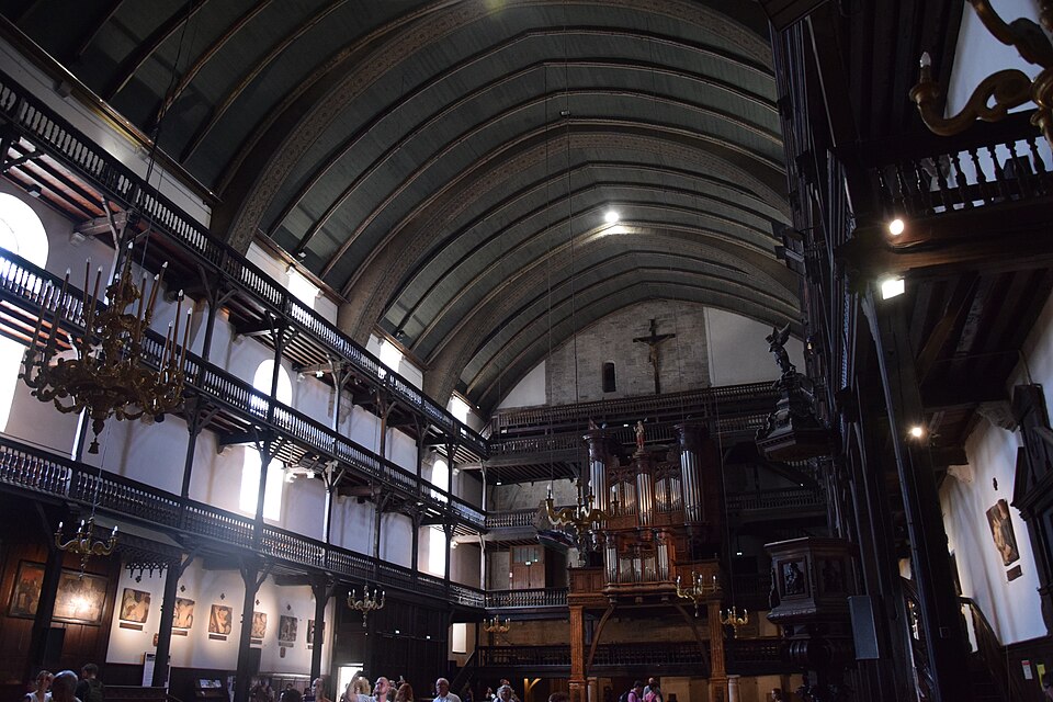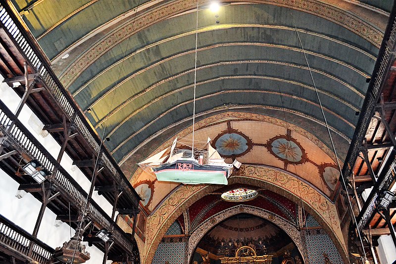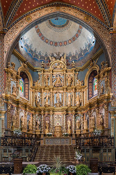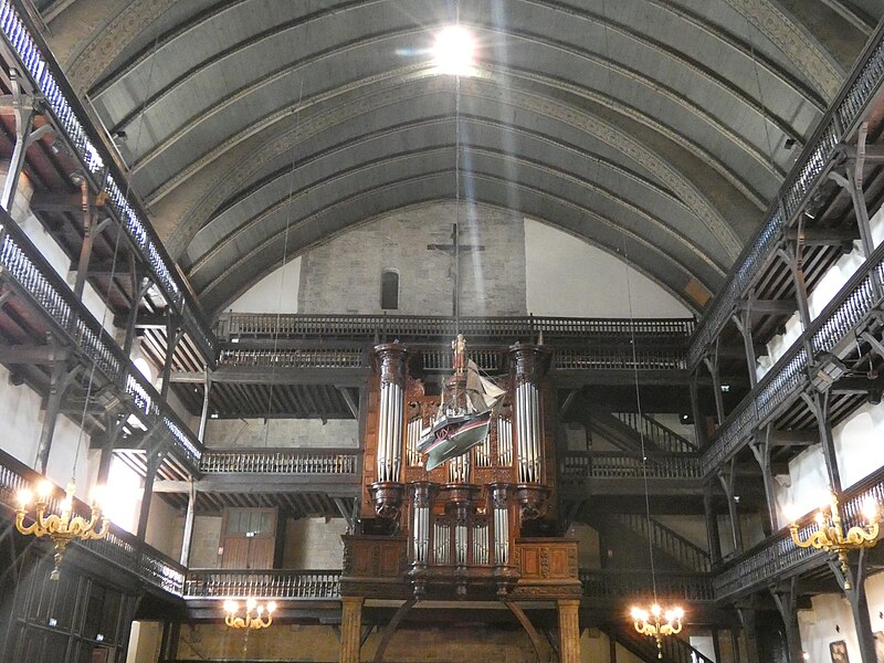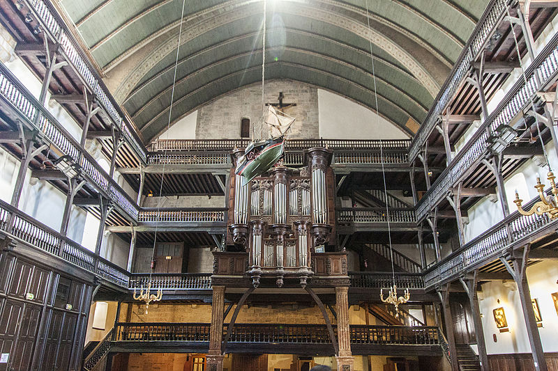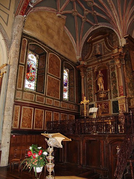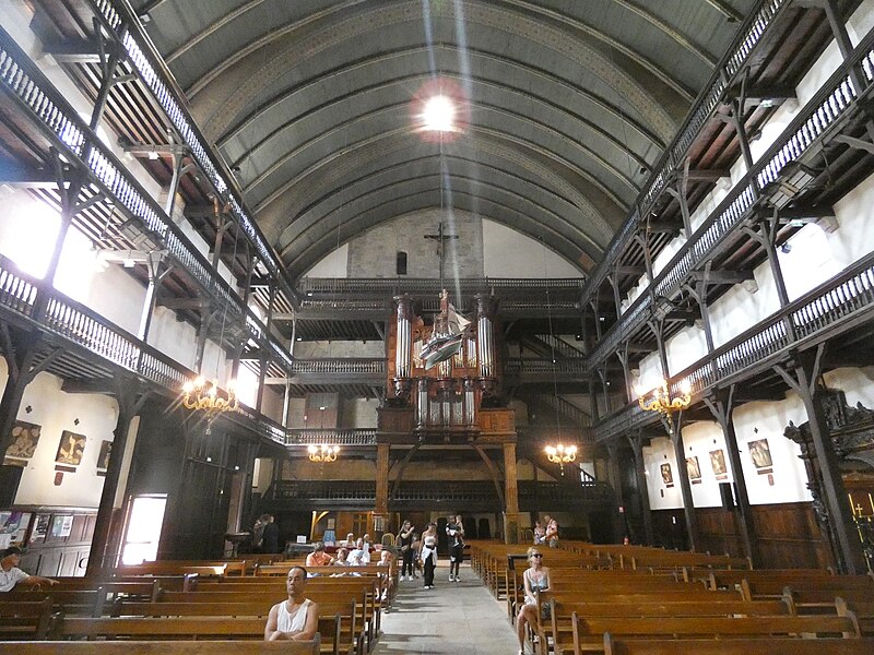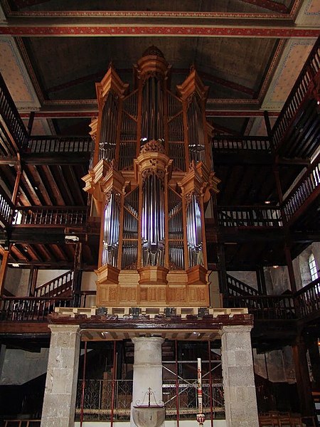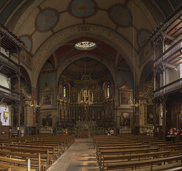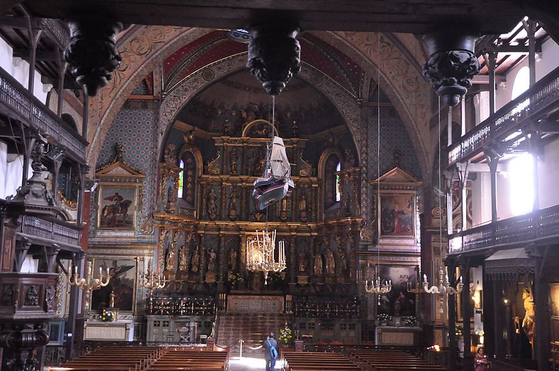 L'église Saint-Jean-Baptiste de Saint-Jean-de-Luz (Pyrénées-Atlantiques) est célèbre pour le mariage de Louis XIV et de l'infante Marie-Thérèse d'Espagne, célébré le 9 juin 1660, et pour son retable monumental en bois doré du XVIIe siècle. Le site comporte une longue histoire : une église romane existait déjà au XIIe siècle, et des vestiges de l'édifice gothique du XVe siècle restent visibles, notamment un pilier, des nervures et des fenêtres murées aux murs ouest et sud. L'édifice actuel conserve aussi trois fenêtres ouvragées du tournant XVIe–XVIIe siècle, munies à l'intérieur de coussièges, petits bancs de pierre en vis‑à‑vis. Les murs de la nef, entourés de galeries et surmontés d'une tribune adossée au mur occidental, illustrent un type d'église caractéristique du Pays basque français. Ces galeries à trois niveaux furent élevées à la suite des procès de sorcellerie de 1576 ; la répression ramena une affluence qui nécessita d'augmenter la capacité des édifices sans les démolir, en construisant tribunes et galeries ; la nef devint alors l'espace réservé aux femmes et les galeries à celui des hommes. En 1630, les autorités locales décidèrent d'agrandir l'église, alors insuffisante pour une population en croissance ; les travaux, interrompus à plusieurs reprises, s'étendirent sur un demi-siècle. Seuls furent conservés de l'ancienne église le mur sud et la tour-clocher ; le mur sud fut allongé jusqu'au nouveau chœur et la porte ouverte en 1650 fut celle qui servit au mariage royal. Au nord, un nouveau mur parallèle fut édifié en récupérant des pierres de l'ancien, et une porte y fut ouverte en 1663 ; la dernière ouverture aux angles fut comblée en 1672, mettant fin aux infiltrations. Un escalier intégré à l'angle conduisit à la première galerie en 1675 ; au sud, l'escalier de bois fut remplacé par un escalier de pierre en 1750, dont la balustrade en fer forgé date de 1755. La tour-clocher reçut un étage supplémentaire en 1685 ; sa flèche fut frappée par la foudre le 27 novembre 1706 et la flèche incendiée fut remplacée par un toit plat de tuiles, resté depuis. Le grand portail fut ouvert entre 1663 et 1671, et la porte dite « du mariage de Louis XIV » fut murée autour de 1669. Dans les années 1760–1761, les grandes baies du mur sud et celle du mur nord furent percées sur les conseils du peintre Joseph Vernet. Pendant la Révolution et les guerres de l'Empire, l'église fut utilisée comme magasin à fourrage puis comme hôpital militaire, subissant des dégradations notables. Les décors intérieurs furent transformés au XIXe siècle : en 1884, les murs du chœur et la voûte, jusque-là blanchis à la chaux, furent recouverts de motifs peints d'inspiration néogothique. L'édifice, d'une hauteur sous voûtes de 20 m et d'une longueur de 48,60 m, présente des largeurs variables selon les travées, et son clocher atteint 35 m ; l'ensemble a été classé aux Monuments historiques le 7 mars 1931. Le retable en bois doré qui occupe tout le mur de fond de l'abside est orné de dix‑huit statues de saints, de deux allégories, de la colombe de l'Esprit‑Saint, d'une figure de Dieu le Père et d'un pélican symbolique entourant le tabernacle, ainsi que de colonnades torses sculptées de pampres, fleurs, oiseaux et putti. Réalisé et mis en place en 1669 par l'entrepreneur-menuisier Martin de Bidache, ce retable de grandes dimensions respecte les canons classiques et les motifs antiques en vogue à l'époque ; Joannis de Haraneder-Monségur est souvent cité comme maître d'ouvrage probable. Le retable a été classé au titre des Monuments historiques le 5 décembre 1908. Parmi les éléments remarquables de l'intérieur, l'antependium brodé de perles de verre coloré aurait été offert par Louis XIV lors du mariage ; l'autel est surélevé de douze marches, avec la sacristie placée en dessous. Les galeries entourent la nef sur trois côtés, caractéristique des églises du Labourd et encouragée dès 1556 par l'évêque de Bayonne pour accroître la capacité ; elles furent reconstruites à l'identique en 1857 grâce en partie à un don de Napoléon III et de l'impératrice Eugénie. Jusqu'aux années 1970, les hommes occupaient les galeries tandis que la nef était réservée aux femmes, chacune plaçant sa chaise sur la tombe familiale, le jarleku. Trois lustres du chœur et deux lutrins en forme d'aigle datent du XVIIe siècle ; le buffet de l'orgue, jumeau de celui de la cathédrale Sainte‑Marie d'Oloron, est classé comme objet aux Monuments historiques le 5 décembre 1908. L'orgue instrumentale, construit en 1659 par Gérard Brunel pour le mariage royal, fut restaurée en 1874 par Georges Wenner et entièrement refaite en 1980 par Robert Chauvin ; il fut inauguré en septembre 1980 par l'organiste Lionel Rogg. Les fonts baptismaux, avec niche et couvercle pyramidal sculptés, datent du XVIIIe siècle et ont été classés le 10 septembre 2003. Le bateau votif, un aviso à voiles et à vapeur rapporté de Terre‑Neuve, fut donné en 1865 par la famille Soudre ; le banc d'œuvre date de 1876 et la chaire de 1878, ornée d'une représentation de saint Michel terrassant le démon. Deux bénitiers remarquables se signalent : l'un sur colonne en marbre de Caunes, l'autre constitué d'une coquille de tridacne géant. À l'extérieur, une Pietà très abîmée sur le palier de l'escalier sud daterait du XVe siècle ; à l'intérieur se trouvent des œuvres datées du XVIIe au XVIIIe siècle, dont un Saint Ambroise en bois doré, un Jugement du Christ retouché en 1879, la Décollation de sainte Quitterie et l'Adoration des mages de Jean Restout (1727). D'autres tableaux du transept et de l'avant‑chœur sont des copies, certaines réalisées en 1824 et 1828 par le chevalier Michel Etcheverry. Les vitraux représentant saint Jacques le Majeur et sainte Jeanne de France datent de 1931 et so