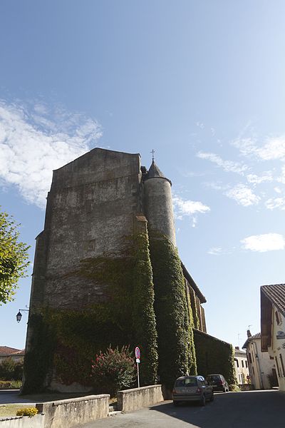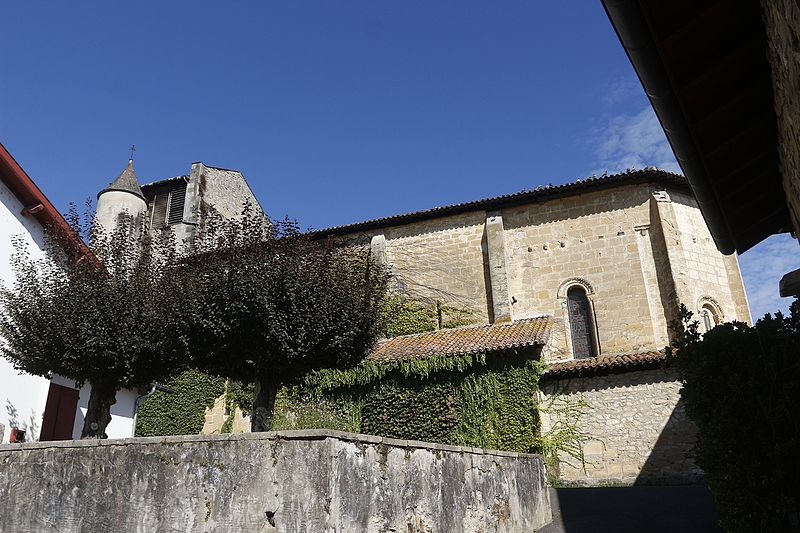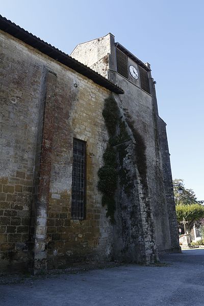 À l'extérieur, une tourelle d'escalier en vis coiffée d'un toit en poivrière dessert les différents niveaux de la tour carrée qui sert de clocher ; deux cloches y ont été installées en 1840, la plus grande ayant pour parrains M. François Saintorens et Mme Marie Desquerre, l'autre M. Jean-Baptiste Lavielle et Mme Catherine Hourton. La tour a servi de refuge lors des invasions et, lors de la restauration de l'église entre 1973 et 1977, plusieurs meurtrières ont été dégagées dans le mur de la tourelle. La nef est consolée par des piliers extérieurs étayés par des contreforts, dont un en arcade attribué à la guerre de Cent Ans. Les fenêtres de style roman, étroites et hautes en plein cintre, présentent une bordure décorée et sont encadrées par deux colonnettes surmontées d'un tore. Le chœur est ogival et scandé par des contreforts.