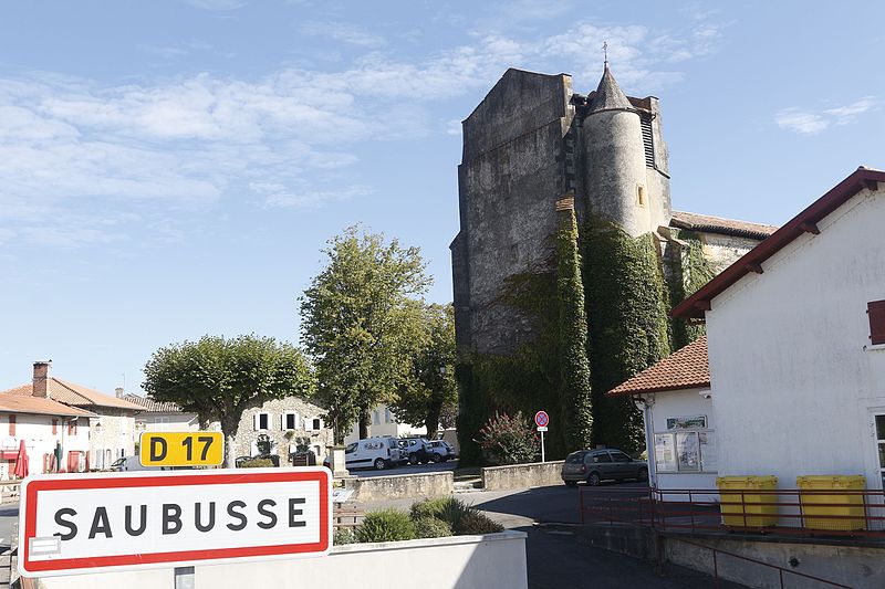 L'église Saint-Jean-Baptiste, située à Saubusse dans les Landes, est inscrite au titre des monuments historiques depuis 1966. D'origine romane, elle présente un chœur à trois pans et des éléments caractéristiques d'une architecture de transition entre le roman et le gothique. Le porche comporte une partie centrale trilobée ornée de six archivoltes et voussures alternant quatre gorges rondes et trois creuses, soutenues par six colonnettes aux chapiteaux décorés de feuilles de chêne. À droite et à gauche, le dispositif se termine par de fausses niches avec deux colonnettes supportant un arc trilobé et l'amorce d'une autre arcature qui s'enfonce dans le mur de la tour, ce qui témoigne de l'antériorité de la façade par rapport à la tour. Selon la tradition, l'édifice aurait été lié aux Templiers. La première campagne de construction remonterait au milieu du XIIIe siècle : le chevet et son voûtement, la première travée de la nef et les murs gouttereaux traduisent ce stade de transition, comme l'indiquent des baies cintrées hautes et étroites et l'archaïsme du système d'ogives. La façade occidentale, édifiée à la fin du XIIIe siècle ou au début du XIVe, comporte un portail à arcades dont le tympan porte, assez récemment, la date 1240 et dont le style évoque certaines réalisations navarraises. Sans doute à la charnière des XIVe et XVe siècles, une puissante tour-clocher a été plaquée sur cette façade, dissimulant une partie des arcades du portail. Le voûtement de la nef a été refait au XVe siècle selon la plupart des auteurs, mais plus probablement dans les premières décennies du XVIe siècle si l'on en juge par le décor antiquisant de certaines clés ; les retombées des ogives ne correspondent pas aux supports prévus initialement. Deux chapelles latérales ont été ajoutées aux XVIe ou XVIIe siècles : celle du nord dédiée à la Vierge et celle du sud, chapelle funéraire des seigneurs de Bellepeyre, dédiée à saint Michel.