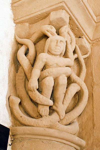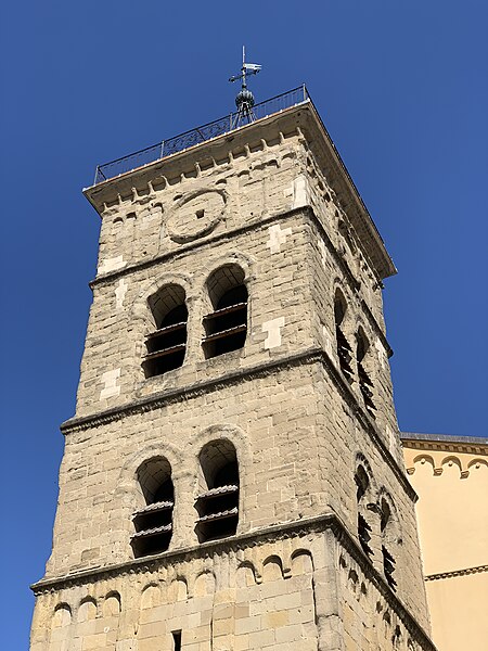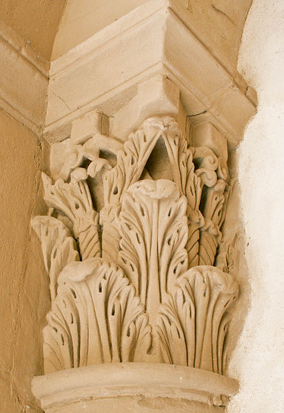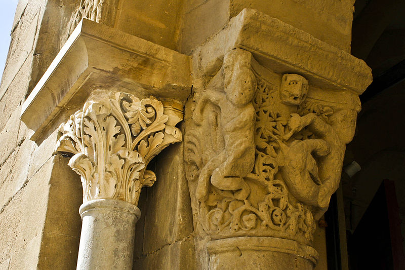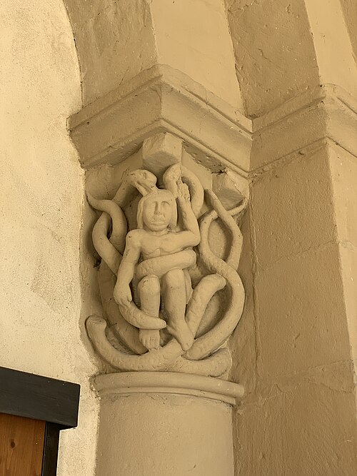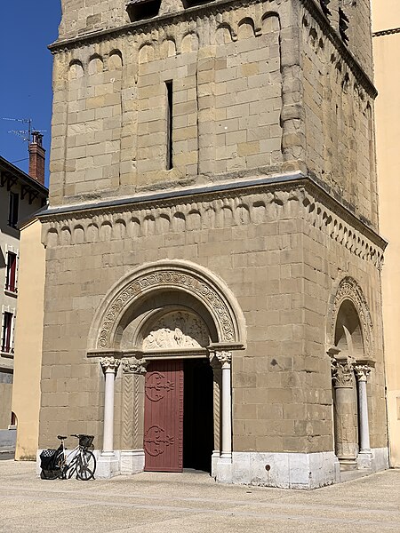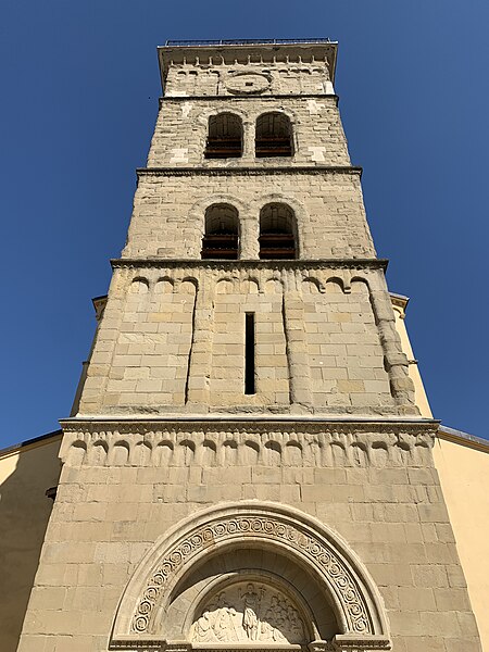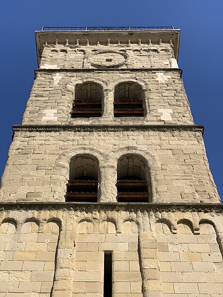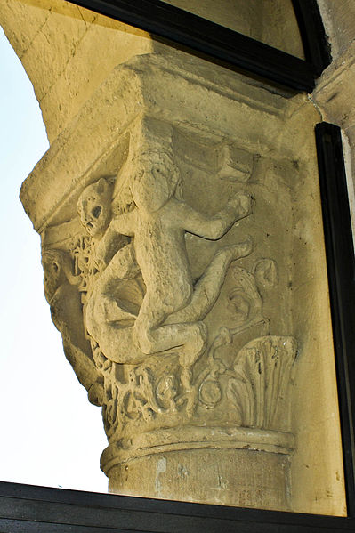 À l'entrée du clocher subsistent huit chapiteaux romans : quatre à décor feuillagé parfois agrémenté de poissons ou de têtes, deux présentant des masques crachant du feuillage et deux historiés placés aux angles nord-est et sud-ouest. Le chapiteau dit « Femme aux serpents » montre un personnage nu entouré d'animaux hybrides mi-oiseaux mi-serpents, image relevant d'une iconographie médiévale de la luxure. Le chapiteau représentant Tobie capturant le poisson montre Tobie hissé sur le poisson et tenant un instrument tranchant, tandis qu'un autre personnage, peut-être l'archange Raphaël ou le père aveugle, figure sur l'arête ; un décor aquatique ponctué de petits trous et une tête sculptée au centre complètent la composition. Le traitement des chapiteaux présente des similitudes avec ceux de la cathédrale Saint-Apollinaire.