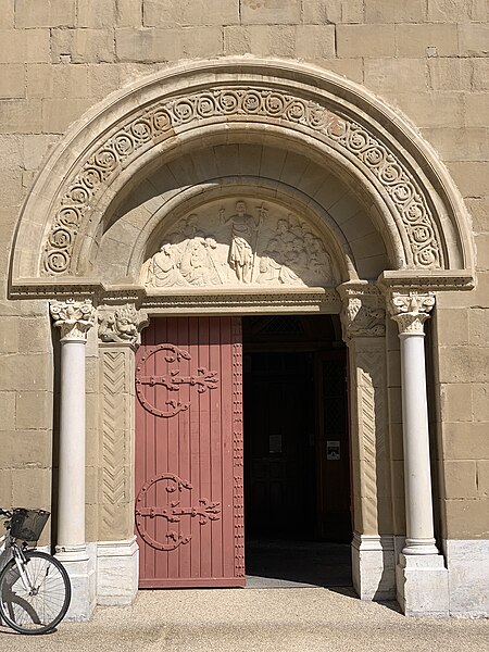 L'architecture intérieure présente des rappels à Saint-Apollinaire, avec arcatures en plein cintre, ouvertures en colonnettes et chapiteaux, frises d'arcatures aveugles sous le toit et cordons de denticules. Le clocher-porche, rénové en 1861 après la restauration de 1849, avait à l'origine des arcs brisés le rattachant aux XVe-XVIe siècles ; l'architecte Auguste Chauffeur chercha à conserver le caractère primitif tout en réparant les façades et fit sculpter un bas-relief de Saint-Jean-Baptiste dans le tympan. Pour cette intervention, il réemploya des éléments du premier âge roman : ouvertures en plein cintre, baies géminées à archivolte saillante ornée de billettes et bandes lombardes liées par des arcatures aveugles. L'aspect médiéval est renforcé par l'usure et la patine de la molasse de Châteauneuf-sur-Isère, matériau présent dans d'autres édifices valentinois comme la maison des Têtes.