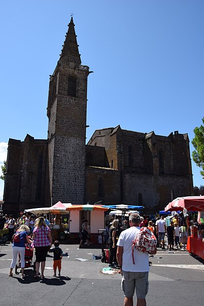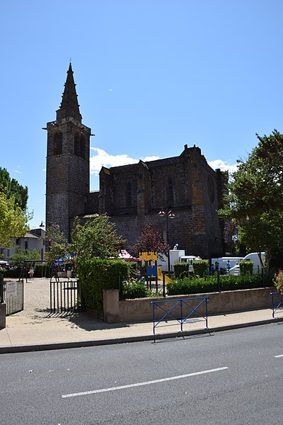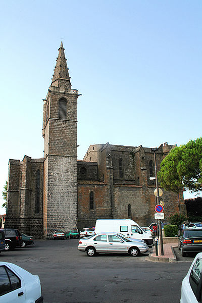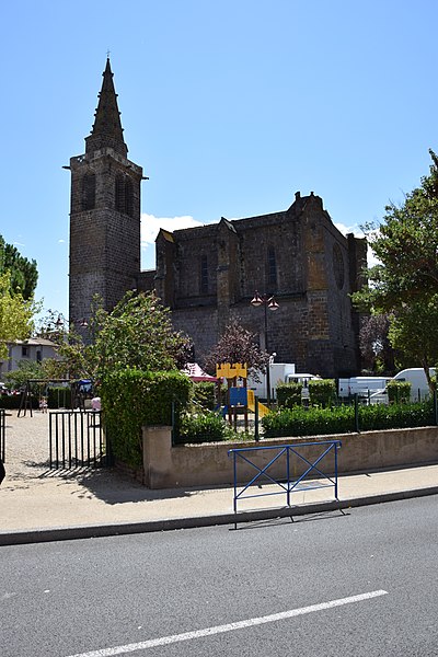 L'architecture combine des caractères méridionaux — murs épais, contreforts et nef unique large — et un plan qui rappelle le type gothique languedocien tout en marquant la volonté d'indiquer un transept. L'édifice est bâti essentiellement en lave noire issue du volcan proche de Roque-Haute ; seule la mouluration de la rosace est en calcaire. La nef unique, large, comporte deux travées voûtées sur croisées d'ogives ; le chœur comprend une travée droite et une abside à sept pans, tous épaulés par des contreforts. Des chapelles plus récentes, peu profondes, bordent la nef et sont couvertes de voûtes en berceau brisé, tandis que des chapelles voûtées d'ogives flanquent la travée droite du chœur.
