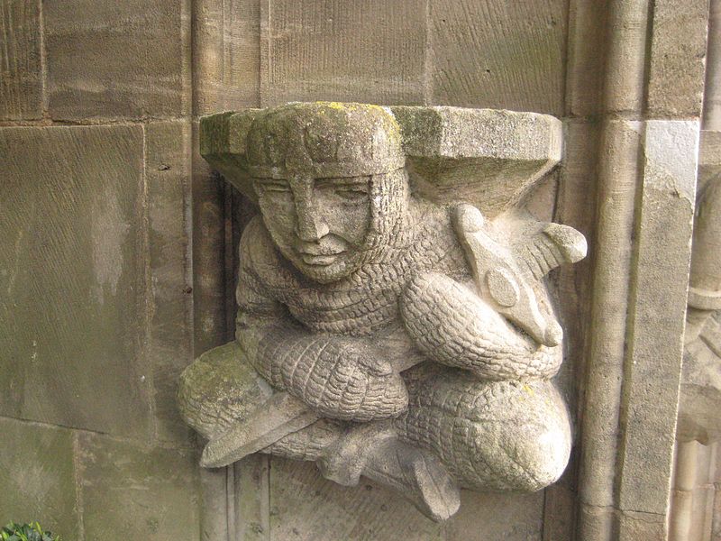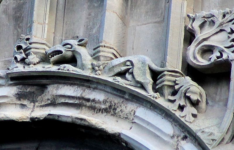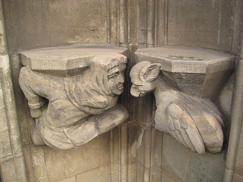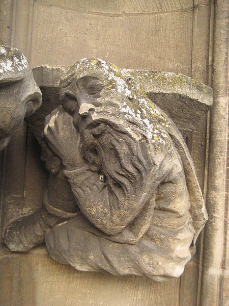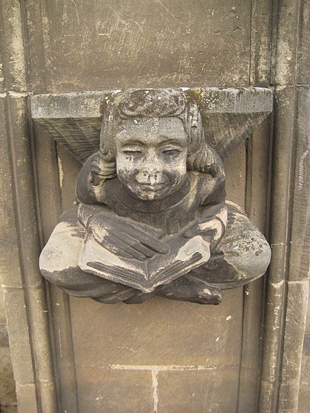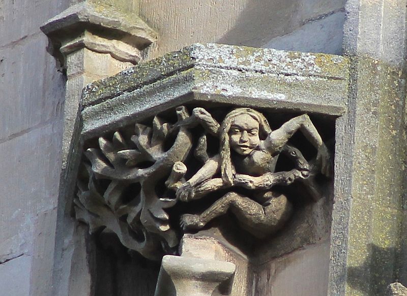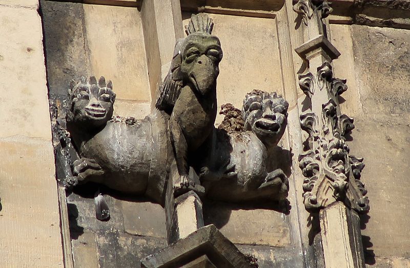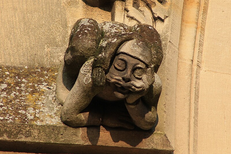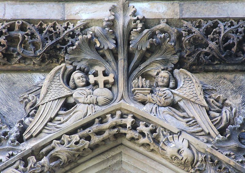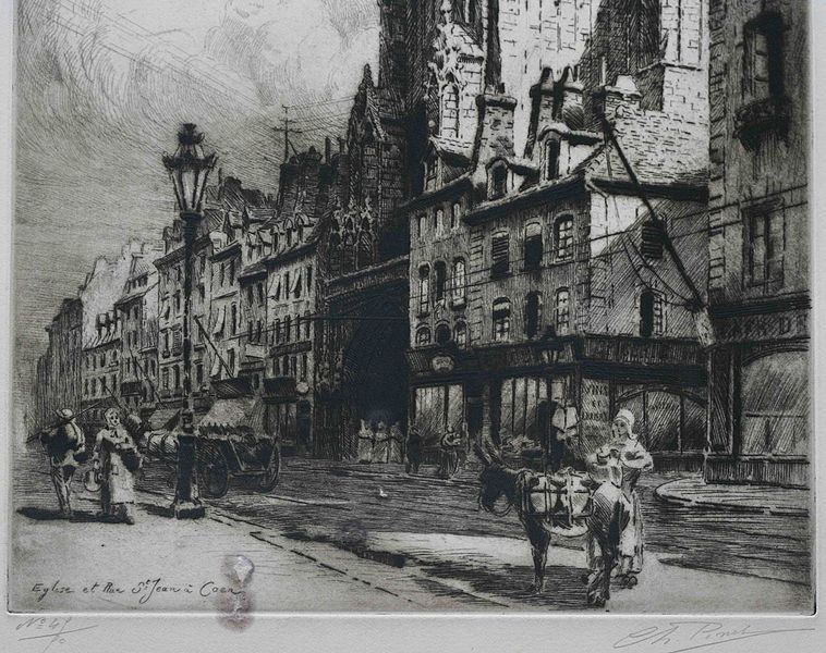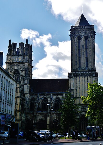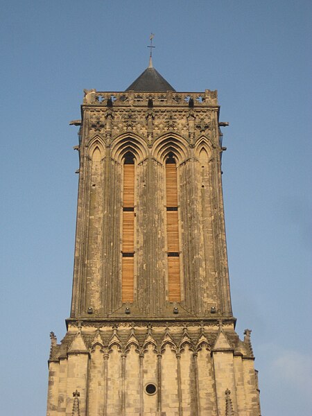 La tour-porche, surnommée la tour de Pise de Caen, présente une inclinaison vers le nord-ouest attestée à 2,28 m en 1700, conséquence de l'implantation de l'église sur le sol marécageux de l'île Saint-Jean, et reste inachevée pour cette raison. D'importants travaux de fondation ont été réalisés après la Seconde Guerre mondiale avec des pieux en béton de 15 à 18 mètres, puis, confrontée à l'apparition de fissures, la commune a ordonné la fermeture en 2012 et fait réaliser 52 pieux de 21 mètres de profondeur pour stabiliser l'ouvrage, permettant la réouverture le 7 juin 2013. Haute de 46 mètres, la tour-porche présente une base XIVe siècle faite de murs aveugles scandés par des arcatures en tiers-point ; l'accès se fait par un petit porche en saillie sur la façade surmonté d'une grande baie en ogive. La partie supérieure, édifiée au XVe siècle, comporte sur chaque face deux arcades en ogive flanquées d'arcatures sur mur aveugle et de niches abritant des statues des Douze Apôtres, tandis qu'un toit en ardoise peu élevé et une balustrade de pierre coiffent la tour, la construction d'une flèche ayant été abandonnée du fait de l'instabilité du terrain. Une tour-lanterne, élevée au XVIe siècle au-dessus du transept, est restée inachevée : partie d'une base carrée destinée à une tour octogonale, elle s'arrête au niveau inférieur couvert d'un simple toit en ardoise et chaque angle porte un pinacle de style Renaissance.