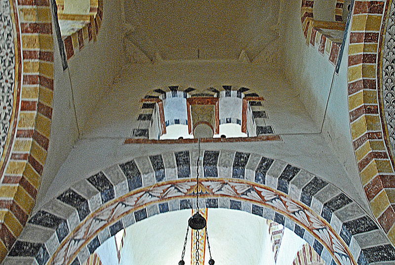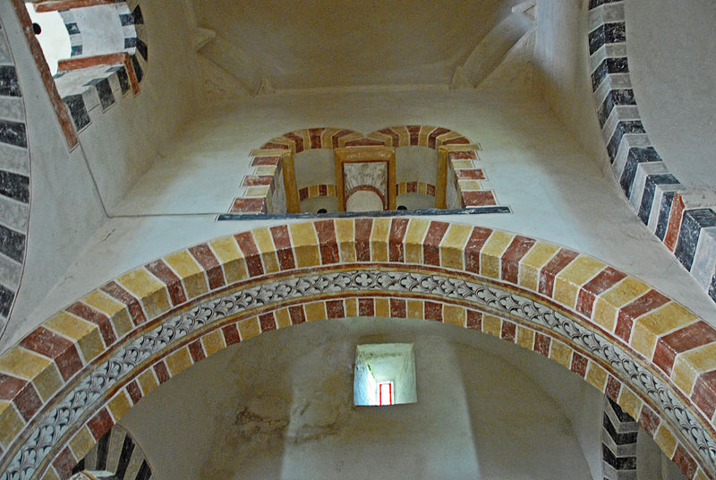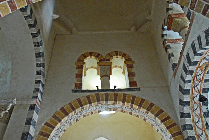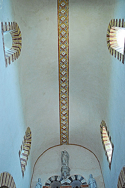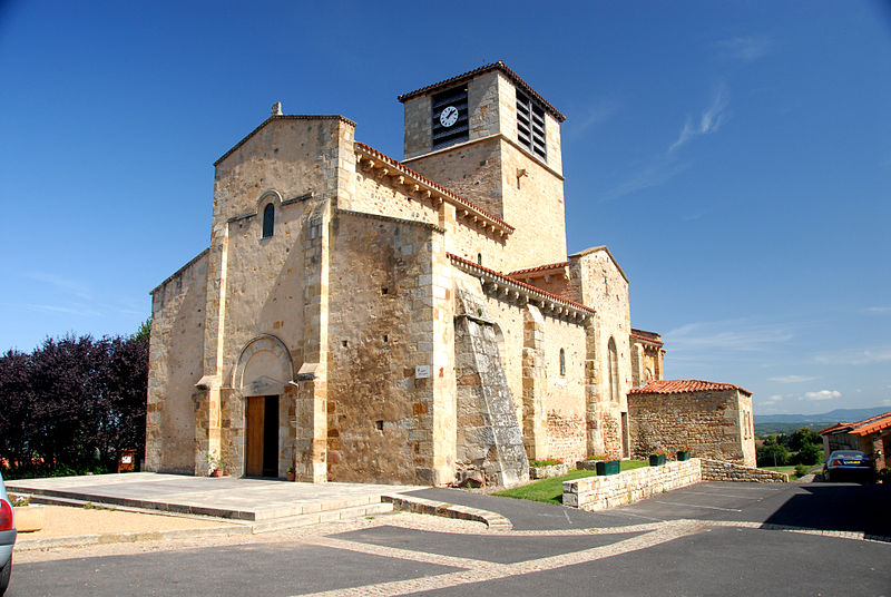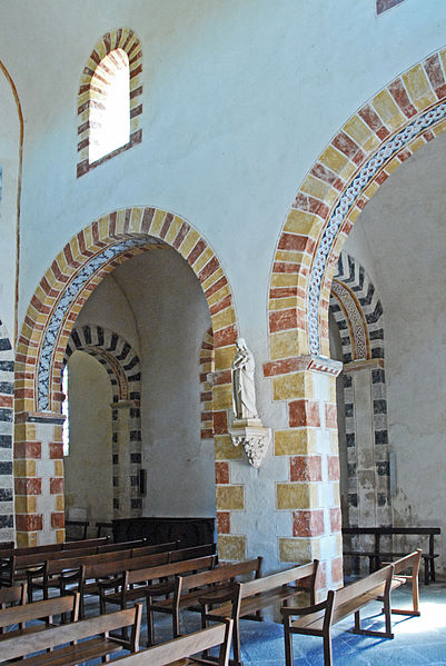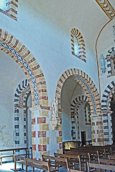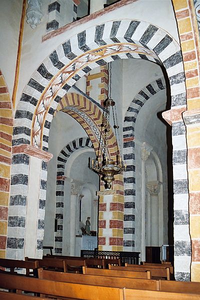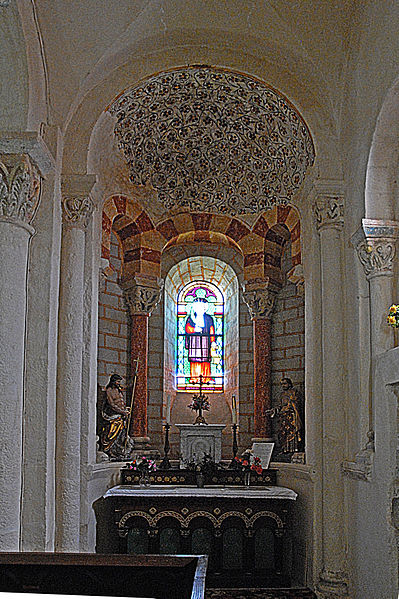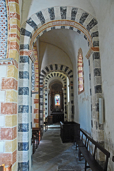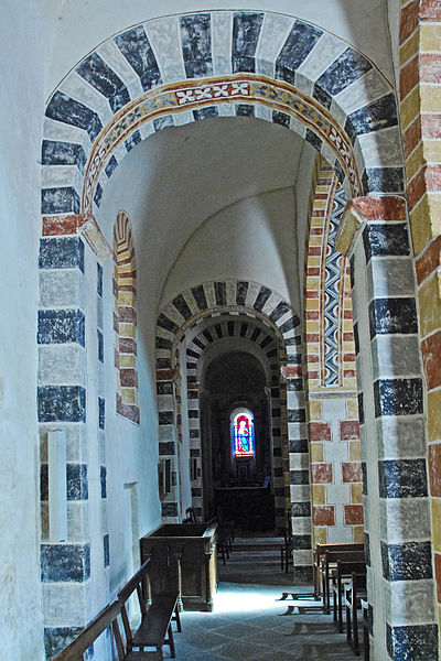 À l'intérieur, la nef est voûtée en berceau et flanquée de bas‑côtés voûtés en demi‑berceau, séparée des collatéraux par des piliers cruciformes. La travée du clocher est couverte par une coupole et ses murs percés, sur trois faces, d'une double arcature à colonne centrale ouvrant sur les travées voisines, selon une mode auvergnate. Le chœur se prolonge par une abside en cul‑de‑four et les voûtes sont principalement en berceau. Une polychromie remarquable, restituée d'après des vestiges, orne piliers, arcs et fenêtres, alternant des tonalités noir et blanc ou rouge et orange.