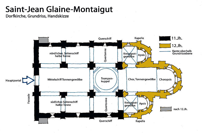 L'église Saint-Jean, de style roman auvergnat, se situe à Glaine-Montaigut, dans le Puy-de-Dôme. Son histoire mêle les fonctions de prieuré, dépendant de Saint-Michel de la Cluse et de Manglieu, et de paroisse, mais les archives restent peu abondantes sur son organisation ecclésiastique. Le chantier initial remonte au XIe siècle et a donné une nef à deux travées avec bas-côtés ; une seconde campagne, au milieu du XIIe siècle, a entraîné la démolition du chevet primitif et la construction du chevet actuel en pierre de taille. Le clocher primitif a été détruit pendant la Révolution ; sa partie haute est désormais moderne suite à des reconstructions et restaurations successives. L'édifice a connu plusieurs interventions notables aux XIXe et XXe siècles, parmi lesquelles la construction d'un porche-tribune en 1888 d'après un projet de l'architecte Pierre Athayne, des travaux de couverture et de corniches au début du XXe siècle, puis la démolition du porche et la restauration du pignon roman occidental en 1991. Des bâtiments conventuels, peut‑être datés des XVe ou XVIe siècles, se trouvaient au sud‑ouest et ont été réaménagés à diverses époques ; l'un des deux anciens angles-tour subsiste à l'angle nord‑ouest. L'église est classée au titre des monuments historiques depuis 1903.