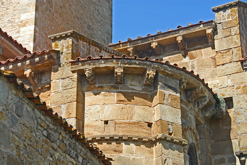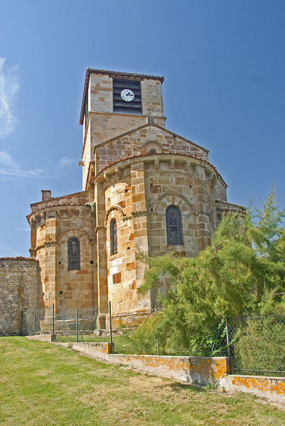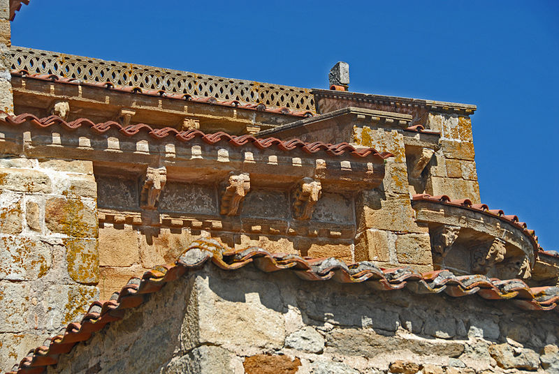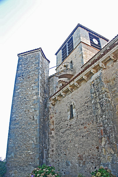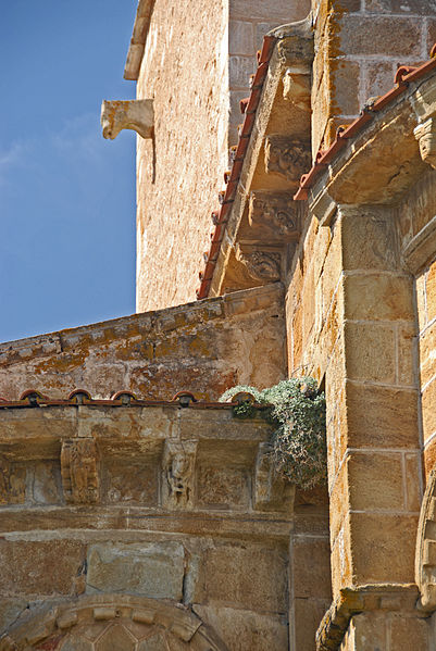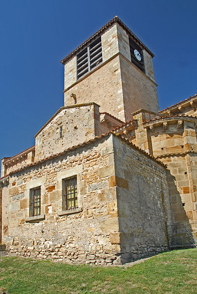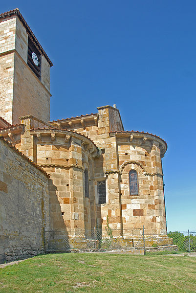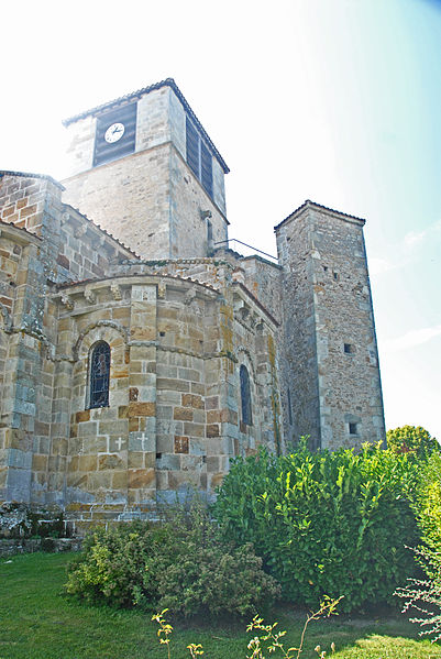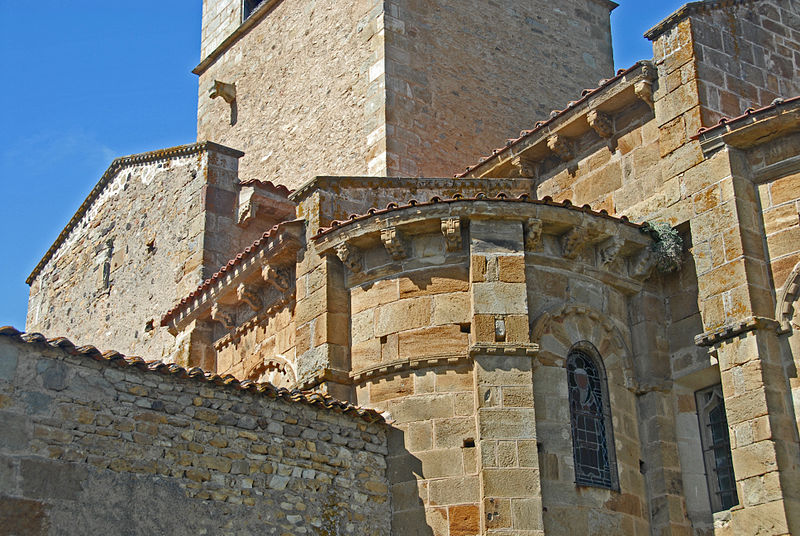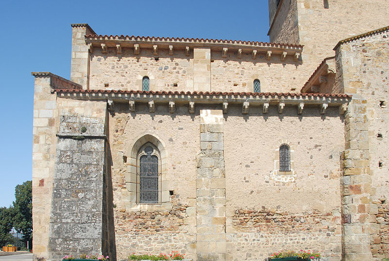 Extérieurement, l'édifice est couvert de tuiles et présente un chevet en grand appareil composé d'une abside et de deux absidioles semi‑circulaires, ornées de pilastres saillants et surmontées de corniches largement débordantes soutenues par des modillons à copeaux ; les fenêtres sont reliées entre elles par un cordon de billettes. La nef et la travée de chœur affichent les mêmes corniches à modillons.