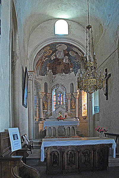 Une fresque du XIIe siècle d'inspiration byzantine, découverte sous des décors plus récents et restaurée par Yves Morvan, représente le Jugement dernier selon saint Jean avec une figure trinitaire du Christ ; des restes de sinopia noire sont encore visibles.
