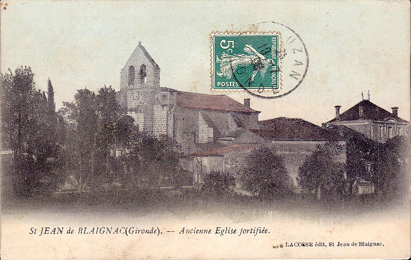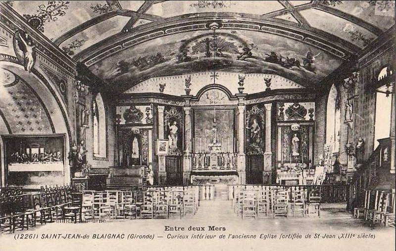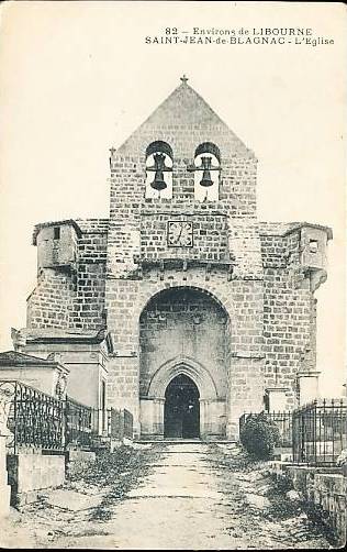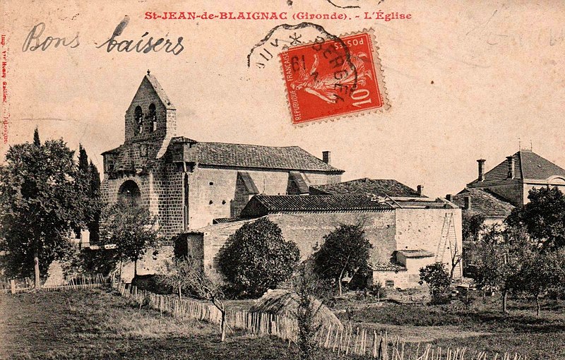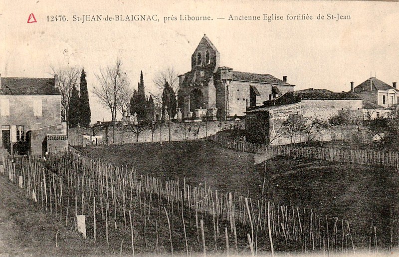 L'église Saint-Jean, église catholique située à Saint-Jean-de-Blaignac en Gironde, est un édifice roman implanté sur un site antique réoccupé par une nécropole mérovingienne. Ancienne priorale du XIe siècle, elle dépendait de l'Abbaye de La Sauve-Majeure depuis 1114. Selon Léo Drouyn, les matériaux des monuments gallo-romains du plateau ont été réutilisés pour élever les murs de l'église primitive. La façade et les murs gouttereaux de la nef ont été remaniés au XIIIe siècle, la façade étant achevée par un mur-pignon. La façade avait déjà été fortifiée au XIVe siècle pendant la Guerre de Cent Ans, avec quatre échauguettes et un assommoir. Au début du XVIe siècle, le chevet a été reconstruit et percé de baies flamboyantes ; les aménagements gothiques, dont le décor ouvragé du chevet et un décor peint de la fin du XVe siècle, restent visibles derrière le grand retable. L'église fut également fortifiée durant les guerres de Religion. La sacristie date de 1653. La croix de cimetière, datée du XIXe siècle, a été classée au titre des monuments historiques le 25 avril 2001, et l'édifice a été classé en 2002. Parmi les éléments remarquables figurent le portail, le clocher, une tourelle latérale droite, une porte latérale et la croix de cimetière.