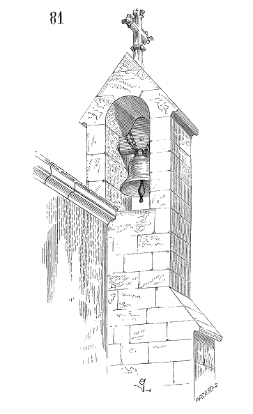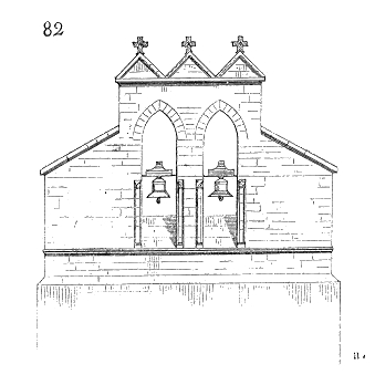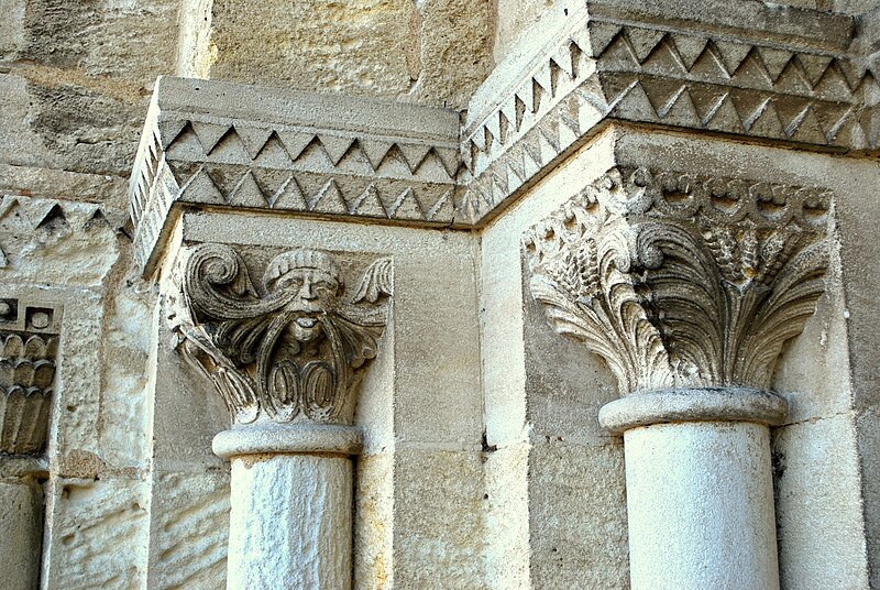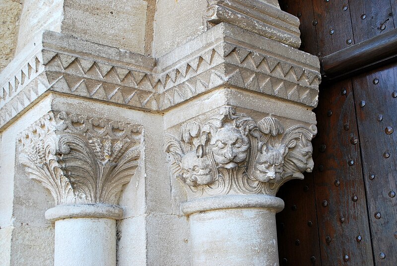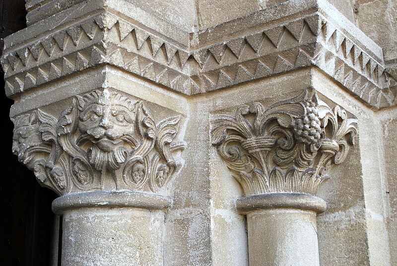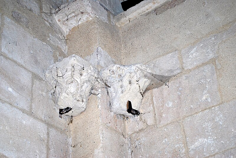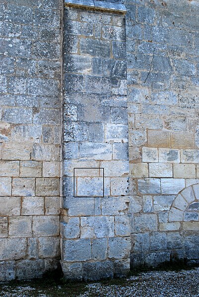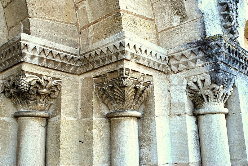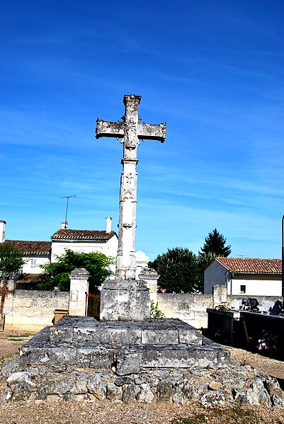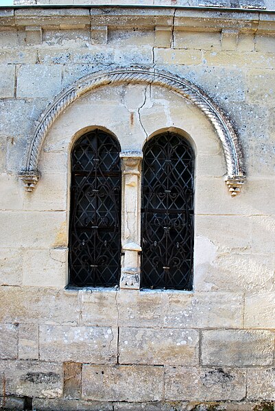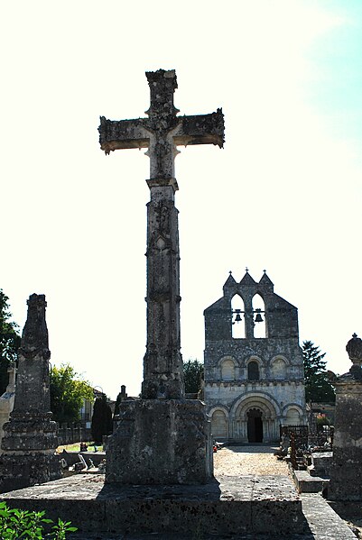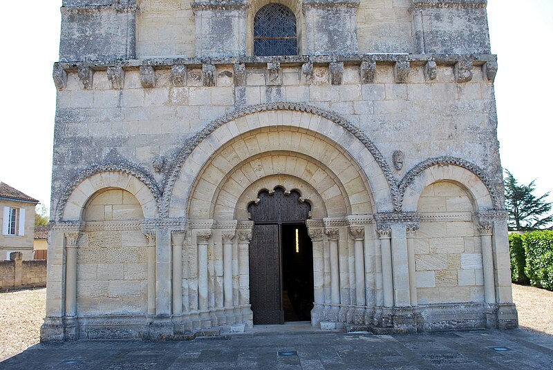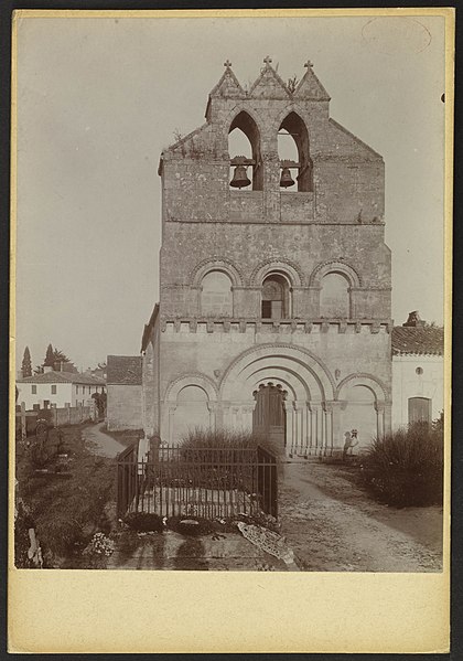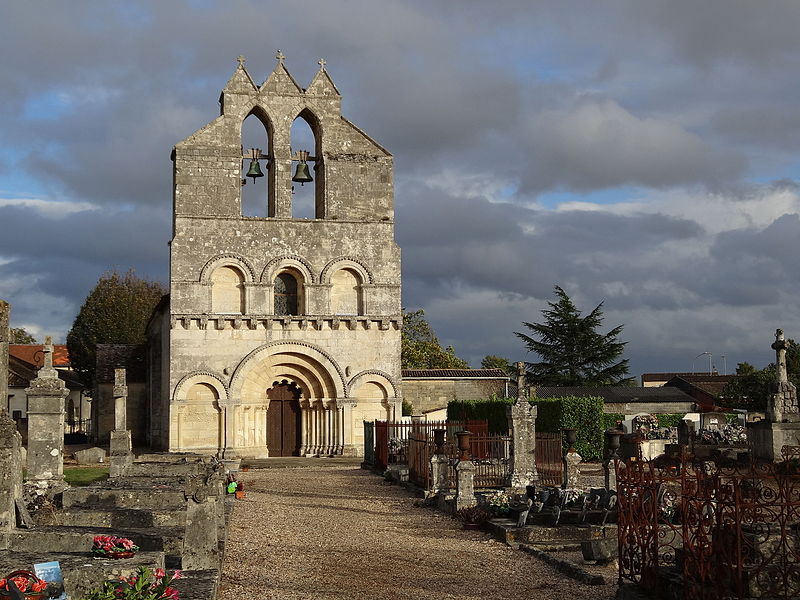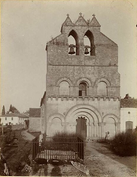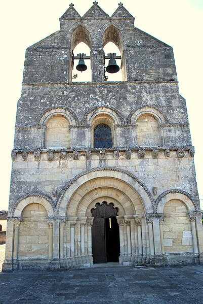 La façade occidentale s'organise en trois niveaux : au bas, un portail roman dont la voussure interne est polylobée, accompagné de deux fausses portes ; au-dessus, une fenêtre agrandie au XIXe siècle et deux baies feintes, toutes trois appuyées sur une tablette saillante portée par des corbeaux ; enfin, en partie haute, un clocher-mur à deux baies, coiffé de trois petites pyramides portant chacune une croix. La partie supérieure de la façade, plus élevée que la nef, est couronnée de trois gâbles sommés de croix en pierre ; les deux baies ogivales qui abritent les cloches sont épaulées de demi-gables formant le sommet du mur. Séparé de cet étage par un bandeau étroit, un niveau intermédiaire présente trois baies en plein cintre dont la centrale, vitrée, éclaire la nef tandis que les deux autres sont aveugles ; ces baies sont flanquées de colonnettes d'angle. Le portail est encadré de colonnettes monolithes aux chapiteaux sculptés.