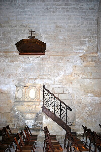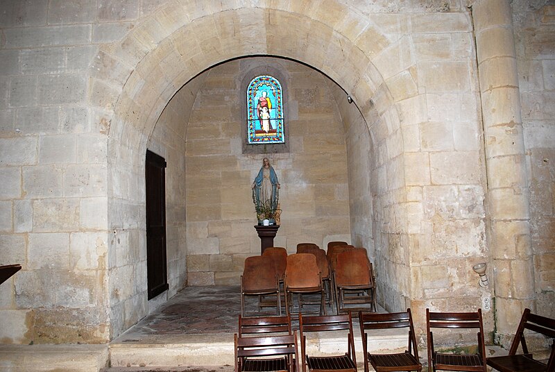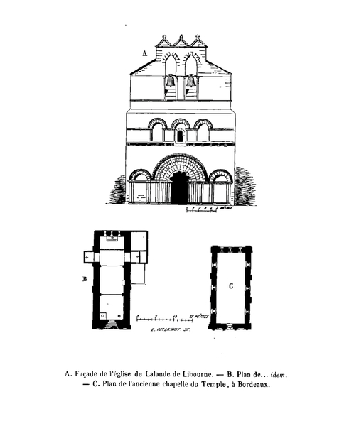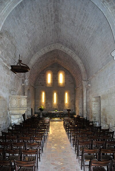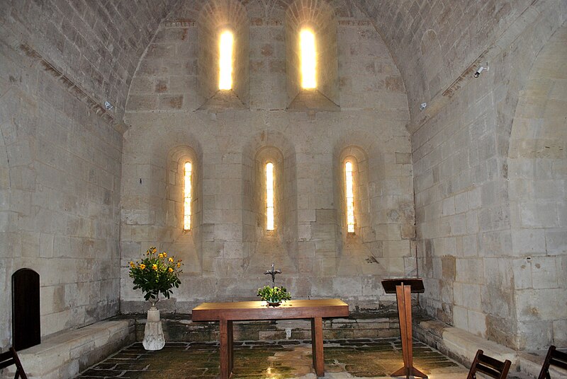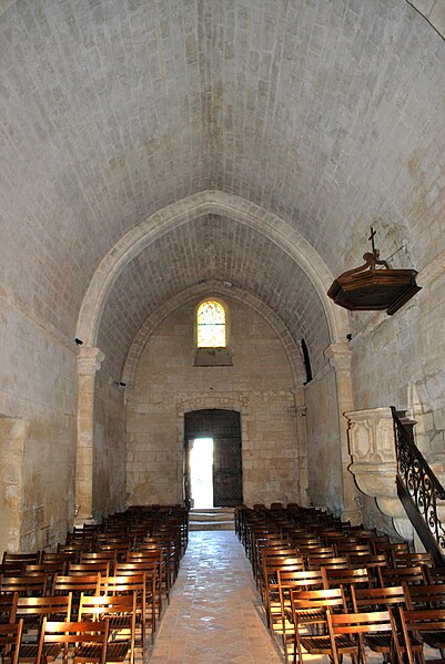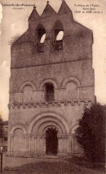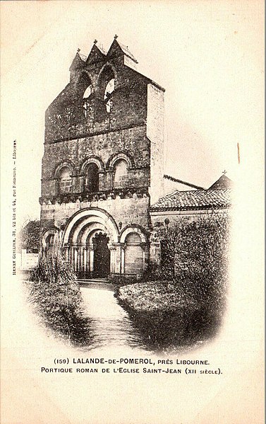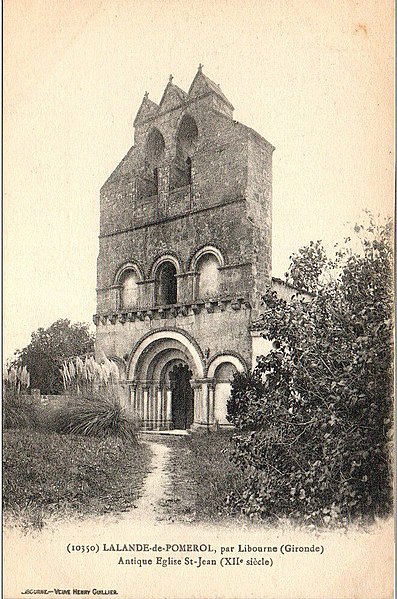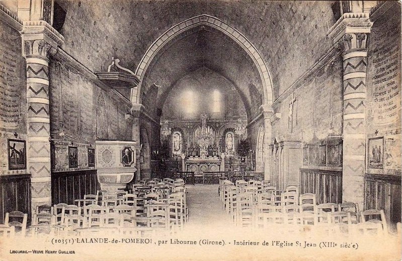 L'église Saint-Jean, située au centre bourg de Lalande-de-Pomerol en Gironde, est un édifice roman du XIIe siècle. Elle se compose d'une unique nef couverte d'une voûte en berceau brisé, renforcée intérieurement par des arcs doubleaux retombant sur des colonnes engagées dont les chapiteaux sont sculptés de personnages. L'édifice, à l'origine un volume rectangulaire aux murs épais, conserve des murs consolidés par des contreforts et des colonnes engagées supportant les arcs, un plan qui rappelle d'autres constructions hospitalières de la région. La nef mesure 26 m de longueur sur 8,70 m de largeur et les murs ont 1,35 m d'épaisseur. Le chevet, plat et terminé en pignon, est percé de cinq fenêtres simples — deux hautes et trois plus étroites en partie basse — pour l'éclairage de l'abside. Les murs de flanc, dans leur partie est, sont couronnés d'une corniche portée par des modillons.