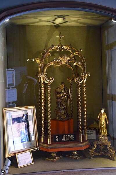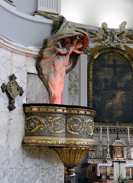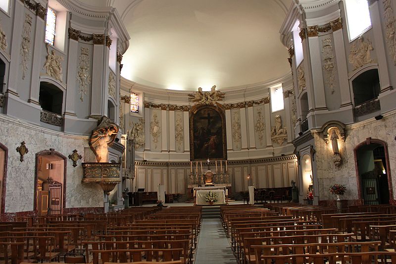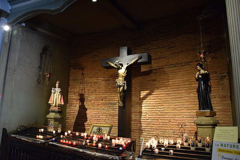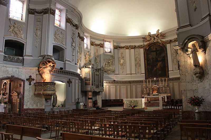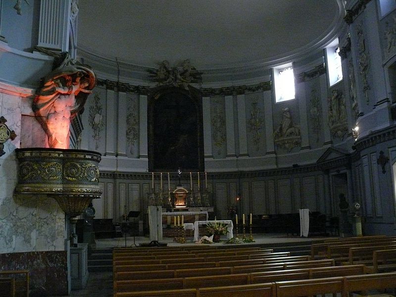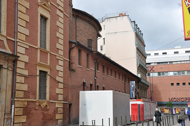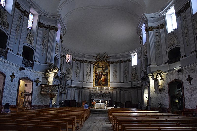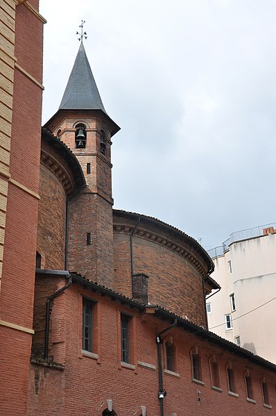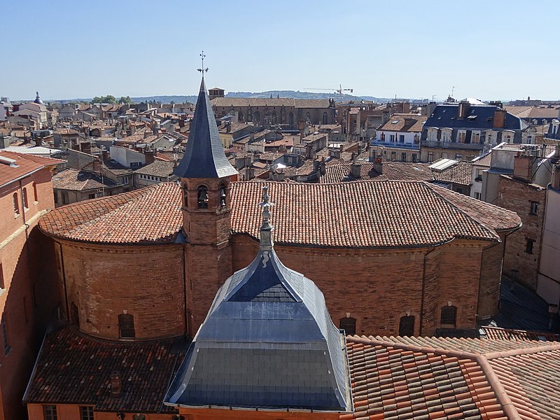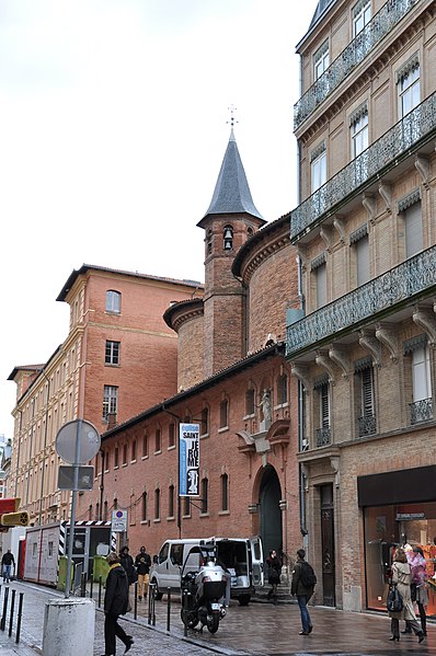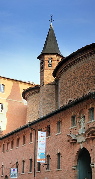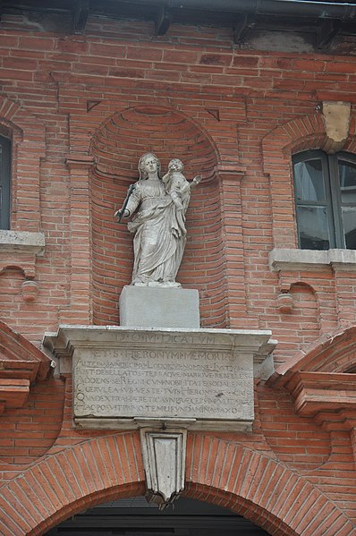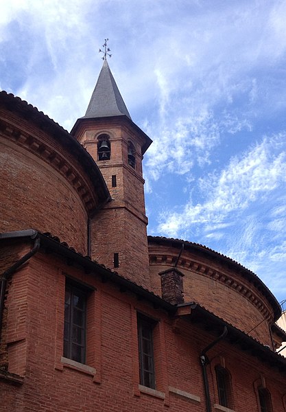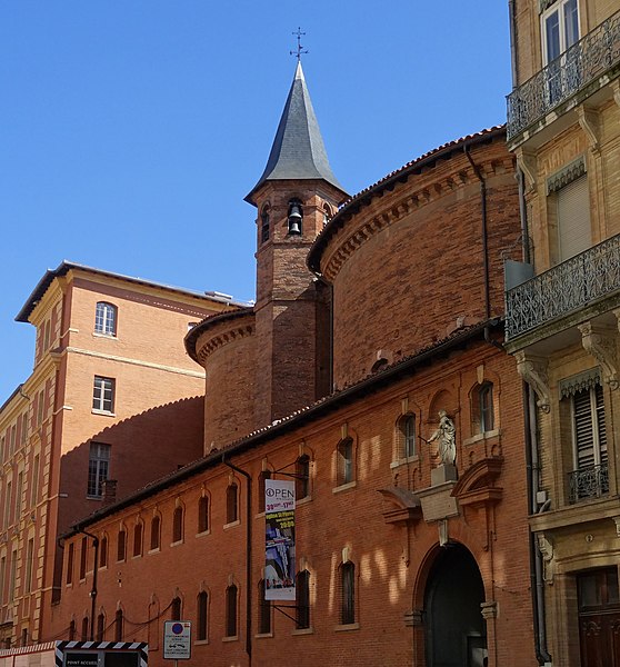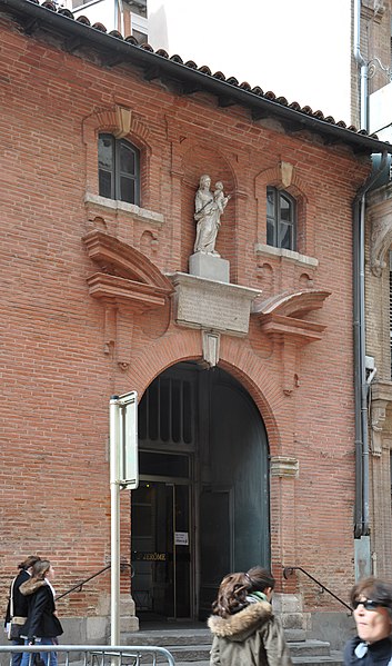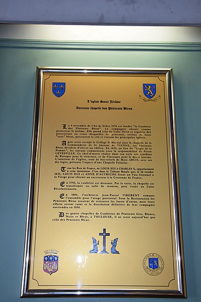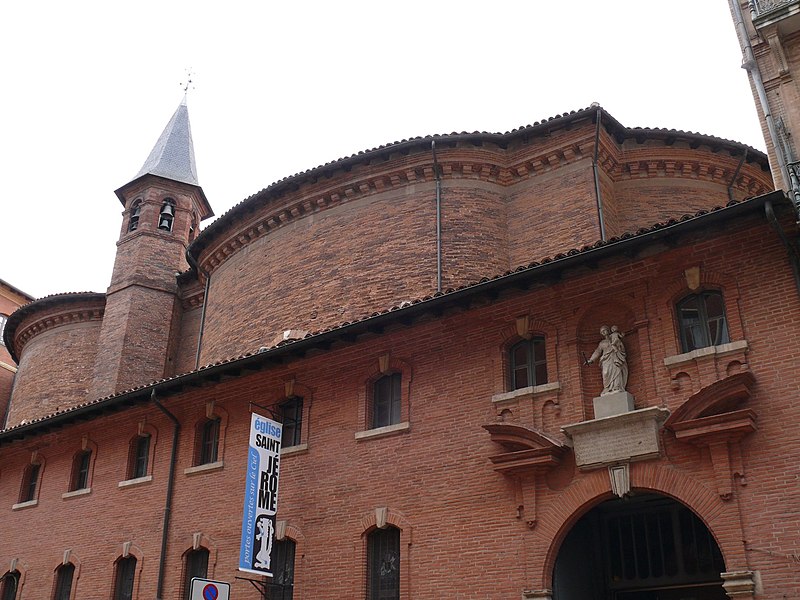 La chapelle des Pénitents bleus, aujourd’hui église Saint-Jérôme, a été édifiée à partir de 1622 par l’architecte Pierre Levesville sur l’emplacement du « logis de la Pomme » acquis par la confrérie. Son plan associe un ovale recoupé par un rectangle, avec deux absides opposées, et deux rotondes qui furent couvertes de coupoles en plâtre. La première pierre fut posée au nom du roi et l’édifice achevé et béni au cours des années qui suivirent ; la confrérie s’y installa en 1627. La nef, couverte d’une voûte en bois, reçut une ornementation dès l’origine : Pierre Fournier fit la dorure des nervures et Jean de Salinge peignit les compartiments. Hector Estienne réalisa une fresque au-dessus de la tribune, et Gervais Drouet intervint pour ouvrir des fenêtres dans la tribune afin d’éclairer et d’entendre les offices. Au XVIIIe siècle, Marc Arcis composa dix bas-reliefs représentant les vertus théologales qu’il accompagna d’un décor d’anges musiciens et de trophées (1734-1735), et Mathieu Lanes réalisa les loges aux balcons demandées par la confrérie. À la Révolution la chapelle fut fermée, vidée de son mobilier et transformée en temple décadaire ; elle redevint église paroissiale en 1802. Pour adapter le lieu à sa nouvelle fonction, Jacques-Pascal Virebent transforma l’intérieur en 1805-1806 en allongeant le chœur en utilisant la salle de réunion des Pénitents, en faisant disparaître le mur circulaire de la tribune et en remplaçant la voûte à caissons par une fausse voûte en planches ; un clocher de style toulousain fut construit au début du XIXe siècle. Au milieu du XIXe siècle des travaux de réparation et de décoration se poursuivirent : six bas-reliefs furent ajoutés au chœur en 1858, le peintre Céroni réalisa un décor dans les années 1860, et G. Pibou exécuta le « Triomphe de Saint-Jérôme » sur la voûte en 1875 ; d’autres peintures et vitraux complétèrent l’ensemble au XIXe siècle. Des projets d’agrandissement et des restaurations se sont succédé, et une intervention en 1975 a modifié certains aménagements intérieurs, comme la suppression de l’emmarchement séparant la nef et le chœur et le cloisonnement de certaines arcades nord pour y installer des bureaux. Classée au titre des monuments historiques en 1980, l’église conserve plusieurs chapelles latérales, une sacristie et deux orgues (tribune et chœur). Elle présente une double entrée, rue du Lieutenant‑Colonel‑Pélissier et rue de la Pomme, reliées par le Passage Saint-Jérôme où sont exposés des objets d’art sacré, dont un ostensoir-reliquaire en vermeil et des enluminures. L’édifice témoigne ainsi des évolutions architecturales et décoratives qui ont accompagné son passage de chapelle confraternelle à église paroissiale.