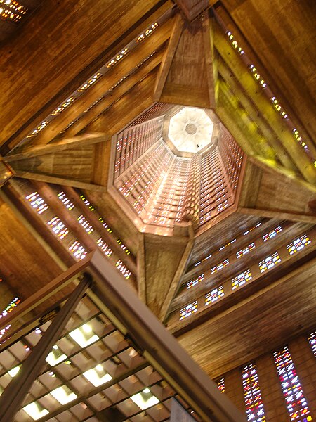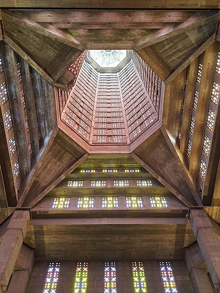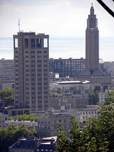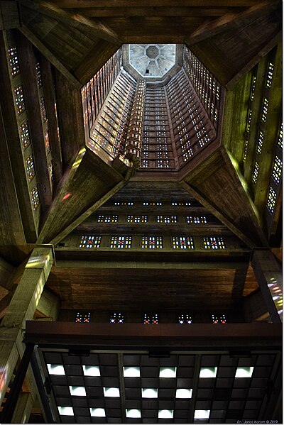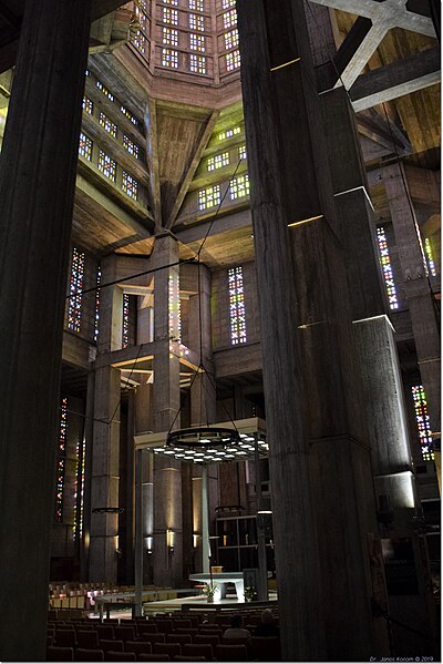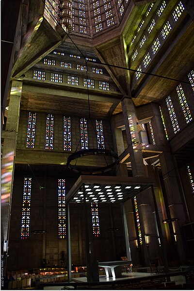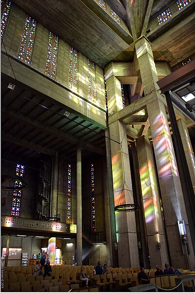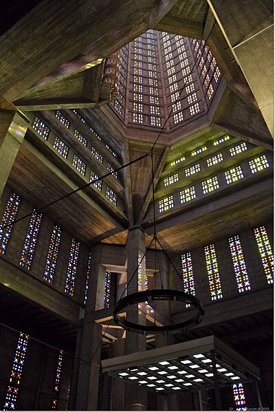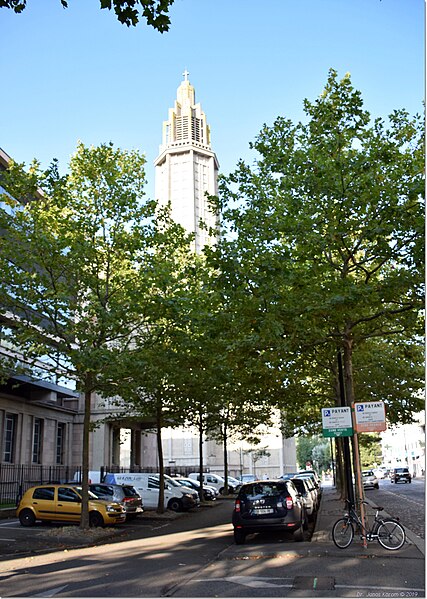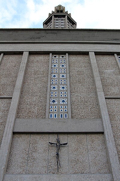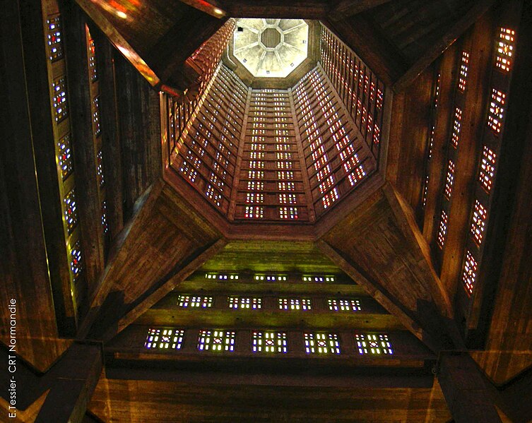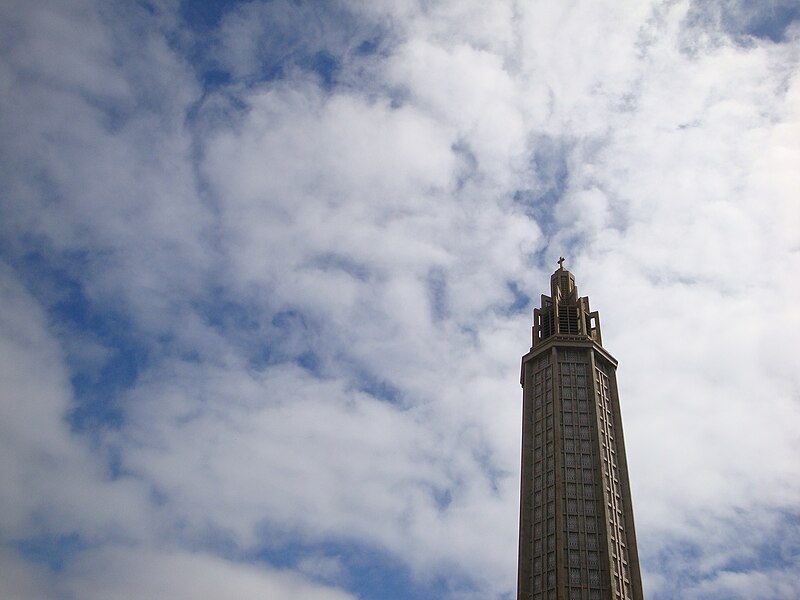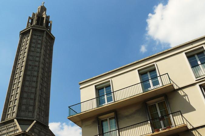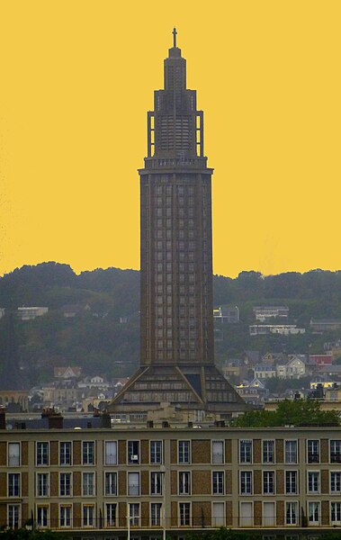 L'église Saint-Joseph, paroissiale et emblématique du centre-ville reconstruit du Havre en Seine-Maritime (Normandie), symbolise la renaissance de la cité après les destructions de 1944. L'édifice fait suite à une première église, édifiée en 1873 et détruite lors des bombardements du 5 septembre 1944 ; il se veut à la fois lieu de culte et mémorial des victimes de ces attaques. Le projet de reconstruction a été mené par Auguste Perret, architecte en chef de la reconstruction du Havre, en collaboration avec l'architecte havrais Raymond Audigier. Construit en béton armé selon un plan fondé sur des modules carrés, le bâtiment s'élève autour d'un maître-autel central et se distingue par une tour-lanterne de 107 mètres qui domine la ville. Cette tour, conçue comme un phare visible en mer et une stèle commémorative, repose sur une structure complexe de piliers et de tirants et confère à l'ensemble une forte verticalité. Les verrières aux couleurs symboliques, dessinées par la maîtresse verrière Marguerite Huré et posées par la maison Freret et Garel du Havre, participent grandement à l'atmosphère spirituelle du lieu. Les sculptures de l'édifice sont attribuées à Guy Verdoya. Les travaux ont commencé en 1951, le gros-œuvre a été achevé en 1957, trois ans après la mort d'Auguste Perret, et l'église a été consacrée en 1964. Par son plan carré et la disposition centrale de l'autel, l'édifice anticipe par ailleurs certaines évolutions liturgiques associées au concile Vatican II. Inscrite au titre des monuments historiques en 1965 puis classée en 2018, l'église Saint-Joseph est également reconnue comme l'un des éléments remarquables du centre-ville reconstruit par Perret, inscrit au patrimoine mondial de l'UNESCO en 2005. Des campagnes de mise en lumière et de restauration ont souligné sa valeur patrimoniale et contribué à redéfinir son image auprès des habitants. L'église demeure un lieu de culte actif, rattaché à la paroisse Saint-Martin du Littoral, et conserve sa double vocation de monument commémoratif et d'édifice religieux ouvert à la communauté.