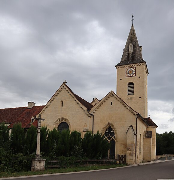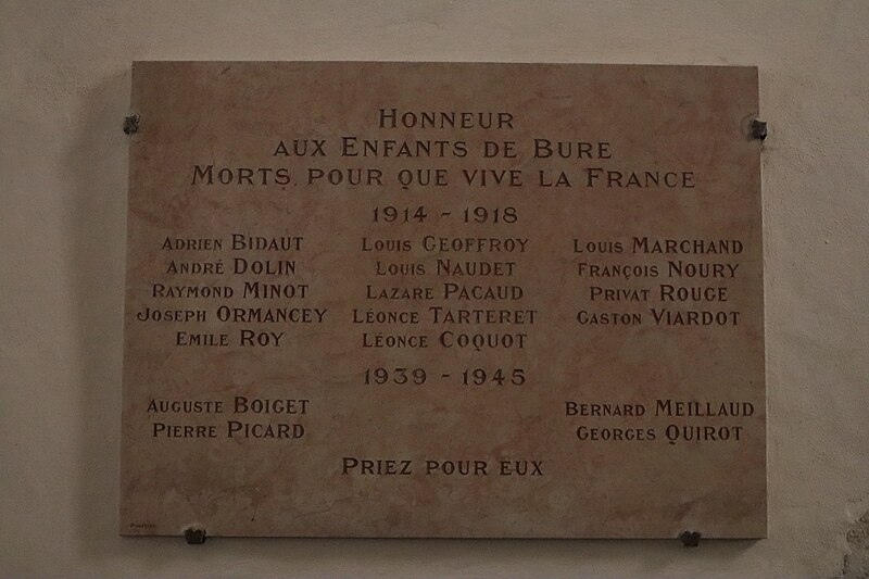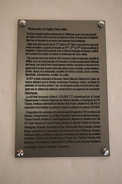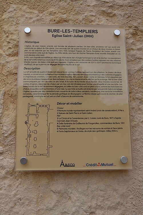 L'église Saint-Julien de Bure-les-Templiers, située au centre de la commune de Bure-les-Templiers dans le département de la Côte-d'Or (Bourgogne-Franche-Comté), trouve son origine dans la plus ancienne chapelle templière du Châtillonnais. Elle illustre la succession architecturale des ordres du Temple et de l'Hôpital. Au XIIe siècle, la nef rectangulaire unique, son bas-côté, le chœur et le clocher latéral formant porche étaient romans et templiers ; de cette période subsistent le chœur et la première travée de la nef principale. Aux XIIIe et XIVe siècles, une seconde nef a été construite le long du mur sud et mise en communication avec la première par des arcades percées dans le mur ; cette nef est gothique et hospitalière, comme les deux travées de la première nef reconstruites alors et accolées au chœur. Entre 1769 et 1775, le plafond de la nef a été refait en voûtes d'arêtes et la toiture modifiée en un unique pan couvrant partiellement le vaisseau central et le collatéral sur la moitié ouest de l'édifice, l'accès se faisant côté sud. La flèche actuelle a été édifiée entre 1851 et 1852 au milieu de la nef la plus récente. L'édifice présente une double nef et une tourelle ; le chœur de la nef principale, à chevet plat, est largement éclairé par trois fenêtres romanes et un grand oculus, tandis que le chevet de la nef sud, plus récent et gothique, est à fond plat et percé d'une fenêtre flamboyante. La moitié ouest de l'église réunit les deux nefs sous une toiture modifiée au XVIIIe siècle et un clocher carré, excentré, occupe la nef la plus récente depuis le XIXe siècle. L'intérieur abrite la pierre tombale d'un chevalier commandeur des Hospitaliers, classée au titre des monuments historiques en 1902, et plusieurs dalles funéraires appartenant aux deux ordres, ce qui souligne l'intérêt historique du lieu. Le mobilier liturgique fait l'objet d'une inscription à l'Inventaire général du patrimoine culturel et comprend de nombreux bâtons de procession, une peinture monumentale du XVIe siècle représentant saint André, un tableau du XIXe siècle représentant le Christ et la Cananéenne d'après Germain Jean Drouais, ainsi que des statues de saint Pierre, saint Julien et un Christ en croix. L'église Saint-Julien est inscrite à l'inventaire des monuments historiques par arrêté du 21 juin 1927.