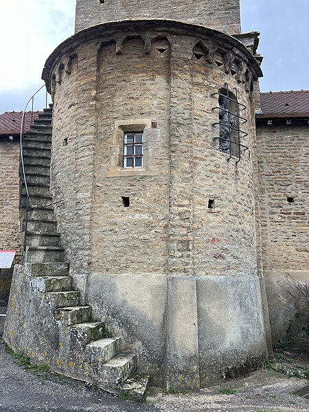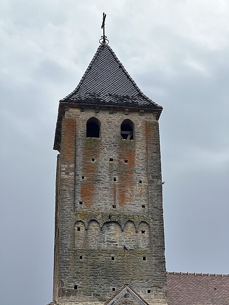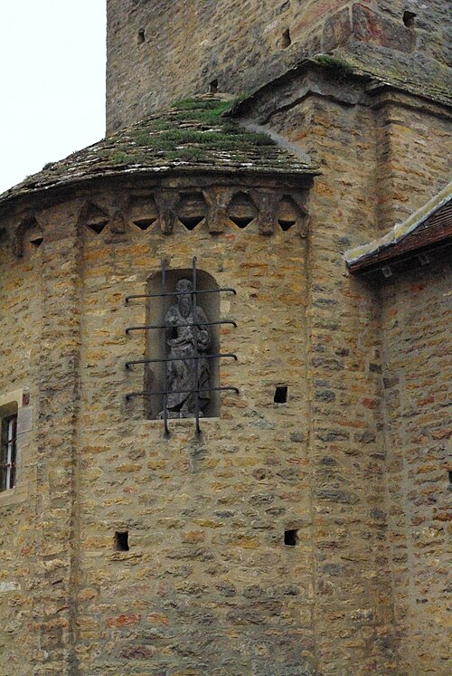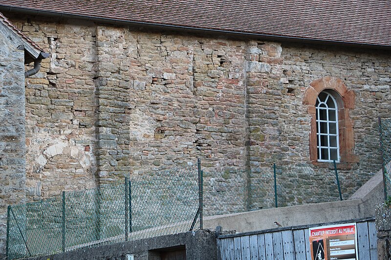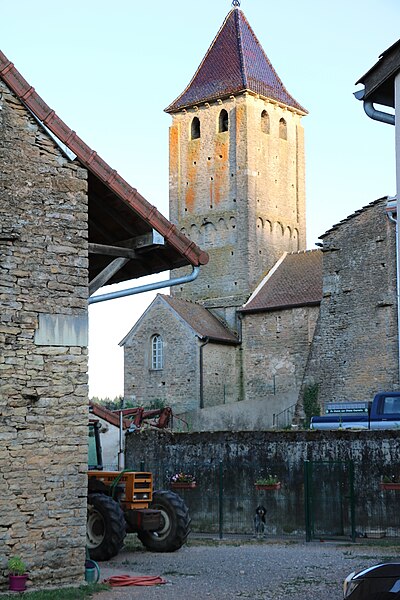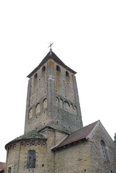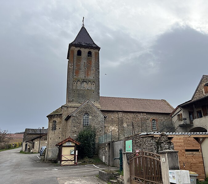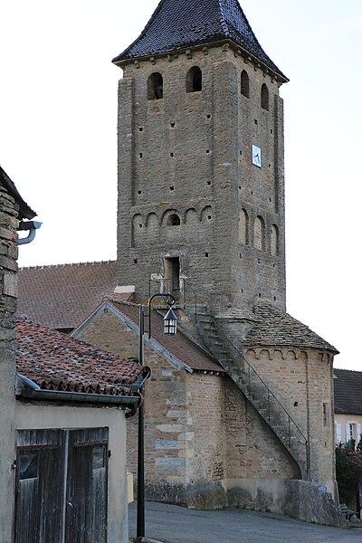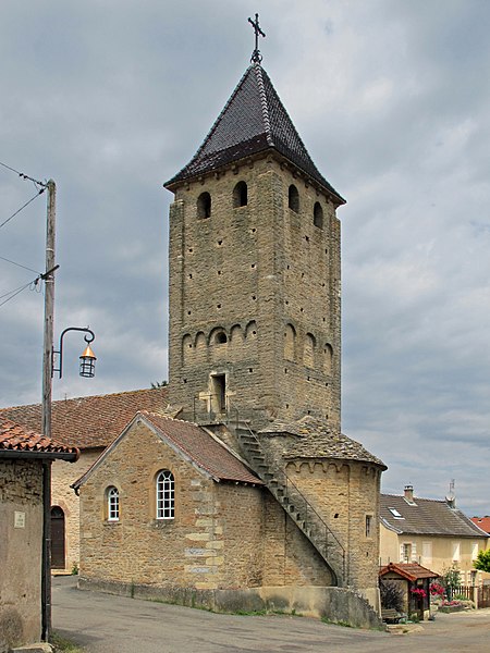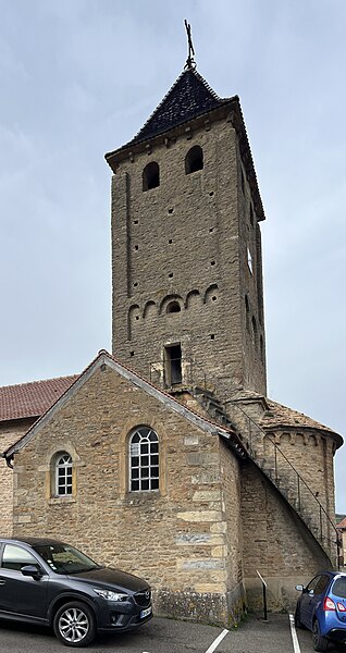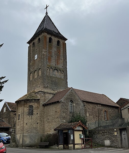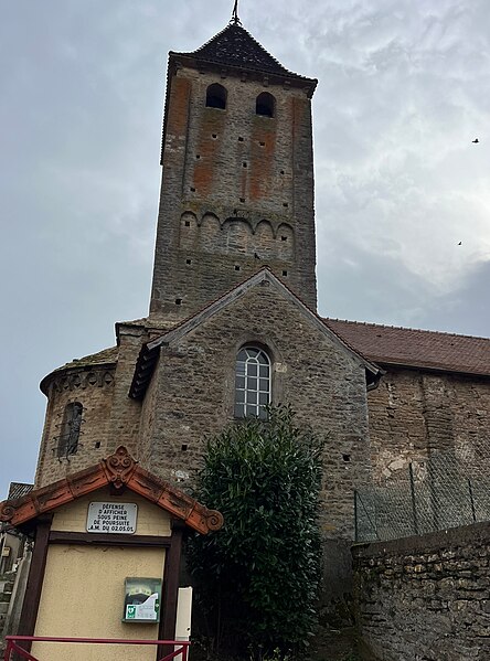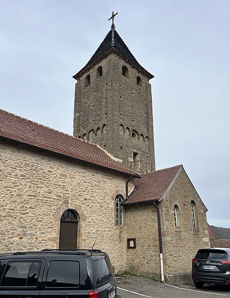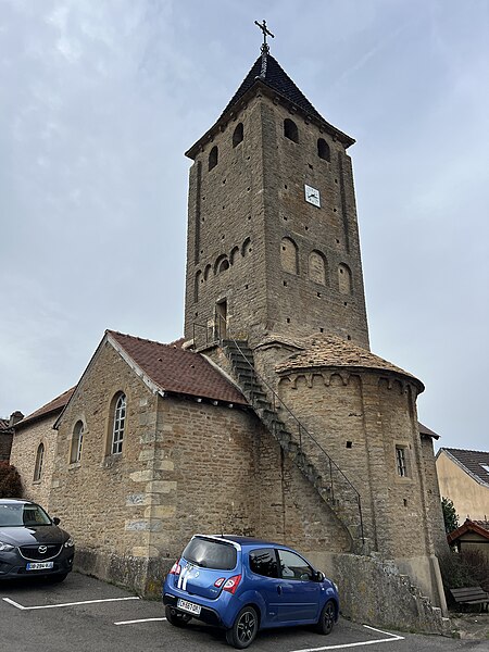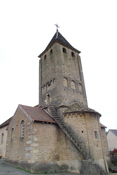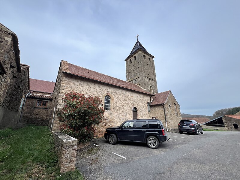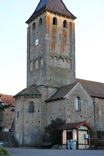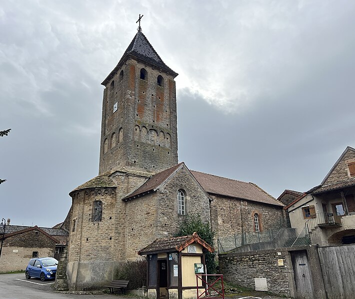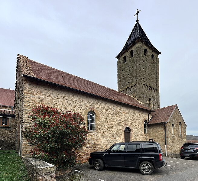 Le chevet roman comprend une abside semi-circulaire ornée de lésènes et d'une frise d'arceaux partielle, et est couverte de laves. La croisée du transept est surmontée d'un clocher carré à deux étages, percé, comme l'abside, de nombreux trous de boulin. Le premier étage présente des arcatures aveugles sur toutes ses faces, avec des différences d'une face à l'autre, à la manière de Chapaize. Le second étage, partiellement refait à une époque indéterminée, comporte de larges faces lisses cantonnées de pilastres interrompus avant la corniche et percées de baies cintrées hautes pour la diffusion du son des cloches. Le clocher se termine par une flèche couverte de tuiles vernissées et abrite une cloche d'environ 390 kg, fondue en 1856. La nef, primitivement minuscule, a été élargie du côté sud et fortement allongée à l'ouest à l'époque moderne, tandis que le transept est également de création récente, lié à l'expansion démographique du XIXe siècle. Au Moyen Âge, le sanctuaire n'était qu'une chapelle exiguë ; hormis l'abside, toutes les autres parties ont été agrandies à l'époque moderne.
