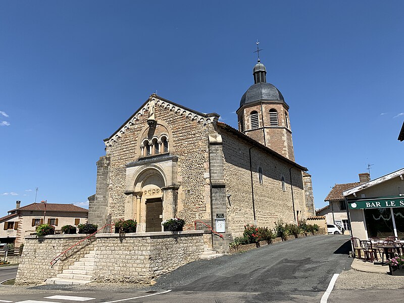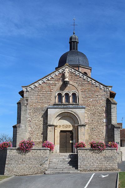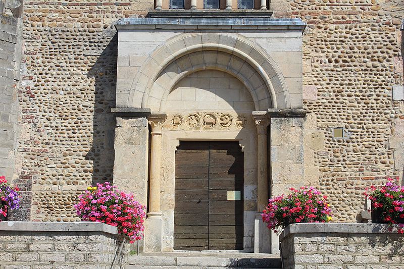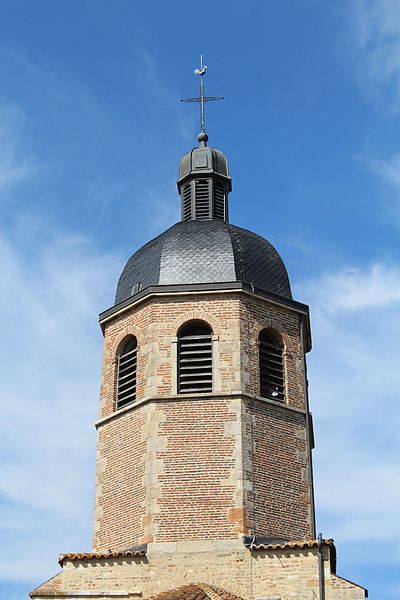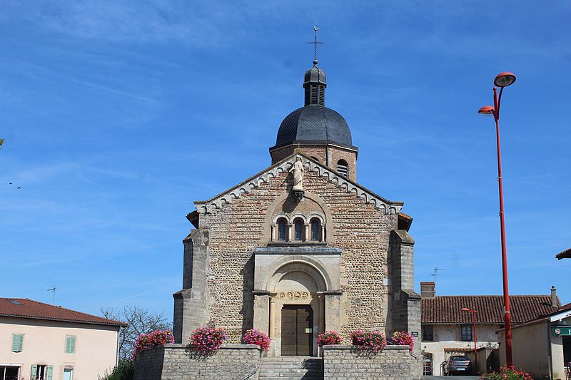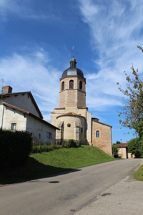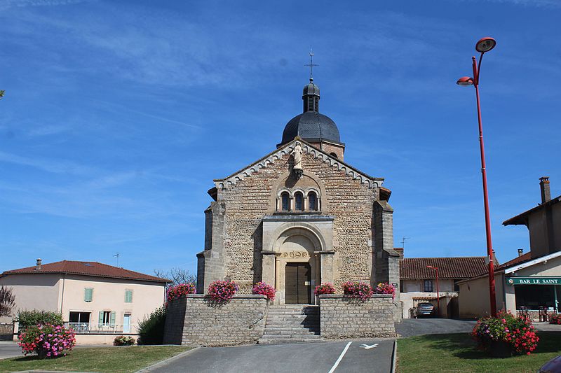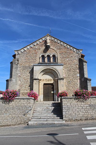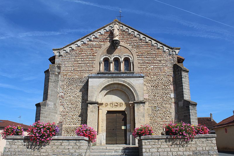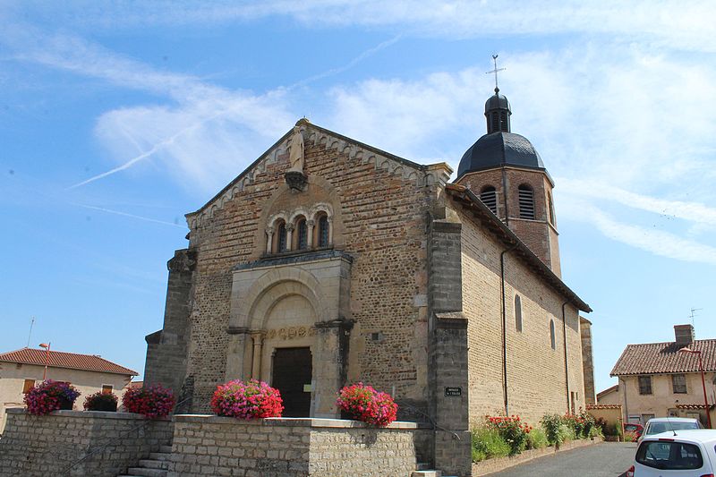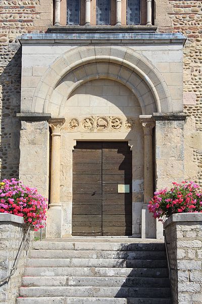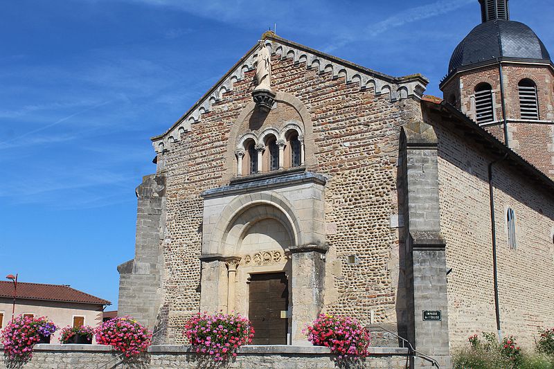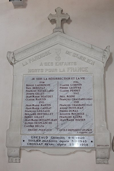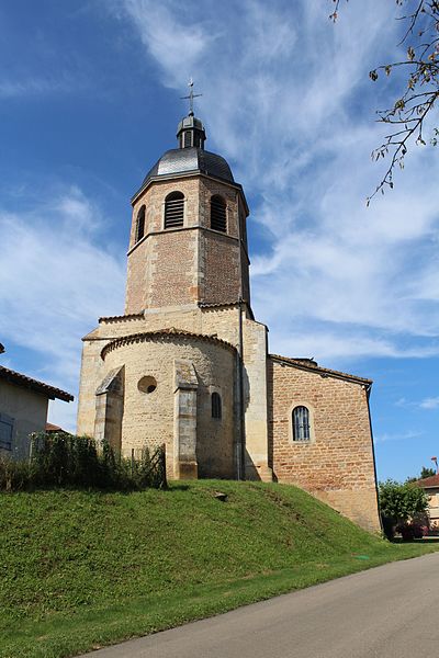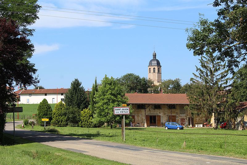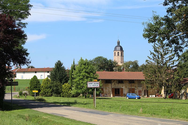 L'église Saint-Julien, située à Saint-Julien-sur-Veyle dans l'Ain (Auvergne‑Rhône‑Alpes), est un édifice roman du XIIe siècle qui dépendait de la collation de l'archevêque de Lyon et est classé au titre des monuments historiques depuis le 8 juin 1945 ; le portail et le chœur sont protégés. En 1701, une portion du mur ouest de la nef s'écroule et des réparations sont effectuées : réfection de la toiture en tuiles creuses, remise en carreaux du sol, lambrissement de la nef et reconstruction du banc en briques entourant la nef. En 1712, le beffroi et le dôme en pavillon du clocher sont remis en état. Au XIXe siècle, d'importantes transformations interviennent avec la démolition puis la reconstruction du clocher en 1838 sur les plans de l'architecte Desplace de Bourg par François Marvier, et en 1880 le toit du dôme est recouvert en ardoise par l'architecte Anselme Rochet et l'entrepreneur François Barbet. La façade principale comprend un portail dont le linteau porte cinq médaillons représentant les quatre évangélistes — de gauche à droite le lion pour saint Marc, l'homme pour saint Matthieu, l'aigle pour saint Jean et le bœuf pour saint Luc — entourant l'agneau pascal ; ce portail est encadré par deux pilastres ouvragés soutenant l'arc brisé du chœur et surmonté d'une statue de la Vierge ajoutée ultérieurement. Le chœur roman présente une travée élargie latéralement par des arcs brisés et couverte par une coupole sur trompes ; l'abside est ornée d'une arcature surbaissée de trois arcs, au‑dessus de laquelle se trouve une galonnière de pierre et, en cul‑de‑four, un ciel bleu étoilé du XIXe siècle avec un médaillon central. Deux pilastres se distinguent dans le chœur : le gauche porte un entrelacs sophistiqué et le droit présente cinq cannelures droites sur une face et cinq brisées sur l'autre ; tous deux sont coiffés de chapiteaux polychromes, celui de gauche représentant probablement le prophète Daniel dans la fosse aux lions, l'identification du droit restant incertaine. La charpente de la nef est en bois et comporte des corbeaux qui soutiennent les poutres maîtresses.