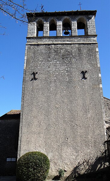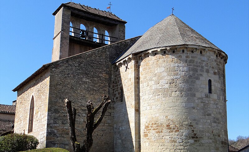 L'église Saint-Laurent d'Anglars-Juillac, située dans le département du Lot, est un édifice catholique implanté au cœur du village. Le site d'Anglars figure probablement parmi les domaines mentionnés dans le testament de saint Didier, évêque de Cahors, destiné au monastère de Saint-Amans. Des fouilles archéologiques menées en 1986 ont mis en évidence une occupation du site depuis l'Antiquité. L'abside et la plus grande partie de la nef semblent appartenir à la fin du XIIe ou au début du XIIIe siècle, tandis que les chapelles nord et sud sont d'époque plus récente. La chapelle sud, dite « chapelle des Seigneurs d'Anglars », remonte probablement à la fin du XVe ou au début du XVIe siècle et a servi de sépulture aux seigneurs locaux ; la chapelle nord, dédiée à saint Joseph, porte la date de 1863 et paraît donc plus moderne. Le clocher-mur, peut-être d'origine tardive médiévale, présente quatre ouvertures ogivales dans sa partie supérieure ; ces baies et leurs arcs non extradossés laissent supposer un remaniement ou une restauration, vraisemblablement lié à la mise en place d'ancrages pour prévenir le basculement de la maçonnerie. Le portail latéral nord, œuvre de la seconde moitié du XVIe siècle, est une belle composition malheureusement mutilée ; sa voussure sculptée représente la Crucifixion avec le Christ au centre flanqué des deux larrons, la Vierge et Marie-Madeleine aux pieds, et une clé ornée de deux anges agenouillés portant des encensoirs. Classée au titre des monuments historiques le 13 mars 1930, l'église présente une nef unique, initialement charpentée puis lambrissée, accessible par ce portail latéral. L'abside romane, en pierre de taille, s'ouvre par une travée droite voûtée en berceau et se termine par un chevet semi-circulaire voûté en cul-de-four ; à l'extérieur, une corniche reposant sur des modillons au décor sobre souligne son profil. De part et d'autre de la nef se trouvent deux chapelles couvertes de voûtes en croisées d'ogives à nervures ; la chapelle sud conserve sa porte propre surmontée d'un écu lisse qui devait autrefois porter les armes des seigneurs d'Anglars.