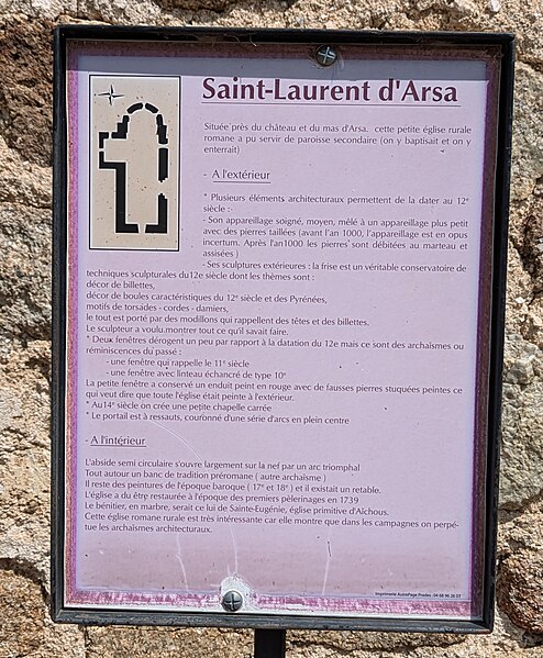 L'église Saint-Laurent d'Arsa, de style roman, se situe au hameau d'Arsa sur la commune de Sournia, dans les Pyrénées-Orientales. Elle présente une nef unique bordée au nord d'une chapelle latérale et prolongée à l'est par un chœur et une abside demi-circulaire voûtée en cul-de-four. Le portail méridional, ouvert sans ressaut, comporte trois rouleaux successifs en plein cintre formés de claveaux inégaux. La nef est couverte en berceau sans doubleau et possède une tribune de fond. Le chœur et l'abside ont été surélevés tardivement au‑dessus de leurs anciennes corniches, qui ont été conservées. Les modillons sont surtout ornés de damiers ou de billettes, quelques-uns présentant des demi-boules. Deux fenêtres éclairent l'abside ; chacune comporte une archivolte extérieure à claveaux plats, selon le type dit « lombard ». Du côté nord, la chapelle latérale abrite un petit autel ancien constitué d'une dalle rectangulaire biseautée reposant sur un pied maçonné. Le mur ouest, rehaussé postérieurement, est surmonté au centre d'un petit clocheton-arcade.