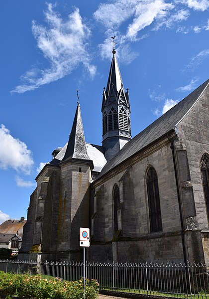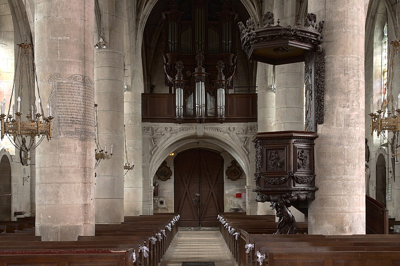 L'église se compose d'une nef à trois vaisseaux d'égale hauteur en trois travées, d'un transept débordant et d'un chœur à chevet polygonal ; les vaisseaux sont séparés par des piliers circulaires et couverts de voûtes d'ogives reposant sur des piles pénétrantes. Les clefs de voûte sont historiées : les armoiries de René II de Lorraine figuraient à l'origine sur les trois clefs du transept, mais elles ont été enlevées en 1641 sur ordre de Richelieu ; la clé du bras sud représente aujourd'hui saint Laurent et celle du bras nord Jean-Baptiste. Le chevet, percé de cinq baies ogivales, s'ouvre sur la croisée du transept par deux piliers ornés d'inscriptions funéraires. La sacristie est située au sud du chœur, dans le décrochement des contreforts avec le transept. Le clocher, posé sur le transept, présente une haute flèche octogonale et des abat-sons ajourés et est accessible par un escalier à vis hors-œuvre. Le porche occidental est voûté d'ogives sur deux travées et porte une clef de voûte armoriée aux armes des Comitin ; l'édifice est entièrement couvert en ardoise.