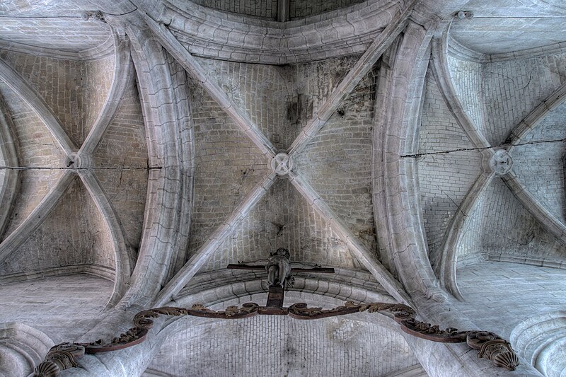 La poutre de gloire, datée du XVIIIe siècle et classée depuis le 15 septembre 1965, se trouve dans l'arc triomphal ; le Christ en Croix, du XVIIe siècle, surmontait autrefois l'ancienne clôture de chœur et présente les pieds cloués côte à côte. Le retable et le maître-autel, également classés au titre d'objet depuis le 15 septembre 1965, datent du XVIIIe siècle : le maître-autel est un autel-tombeau en marbres polychromes, le retable comporte deux colonnes composites en marbre veiné noir à chapiteaux dorés encadrant un tableau représentant le martyre de saint Laurent daté de 1639, et l'entablement porte l'inscription « AUTEL PRIVILEGIE » en lettres dorées ; le retable est surmonté d'un dais en bois sculpté, peint et doré, orné de statuettes dorées d'anges tenant des encensoirs. À la suite de la réforme liturgique du concile Vatican II, un nouveau maître-autel a été installé en 1990 ; sa façade, représentant la Cène, a été réalisée par Claude Michel.
