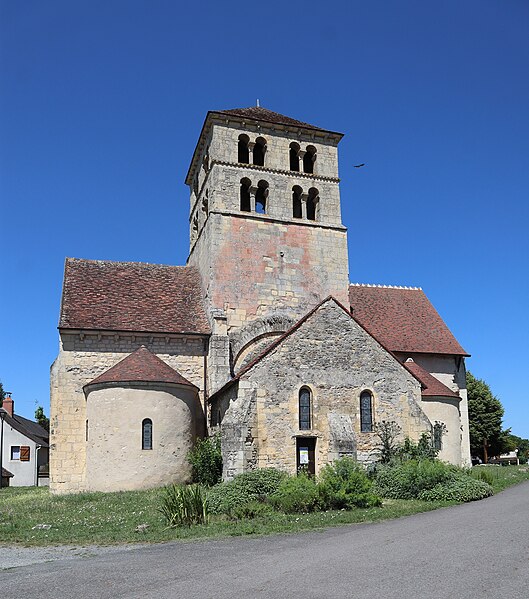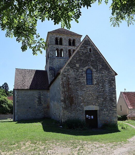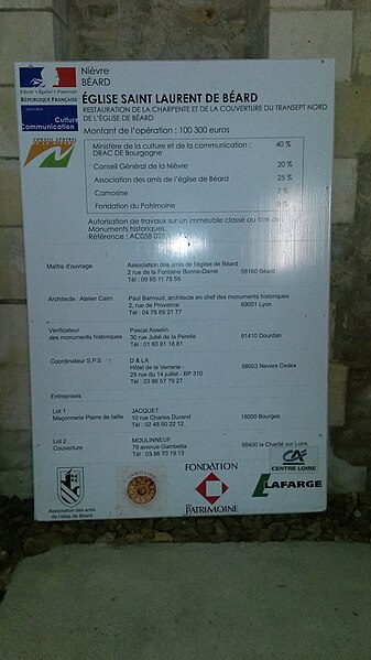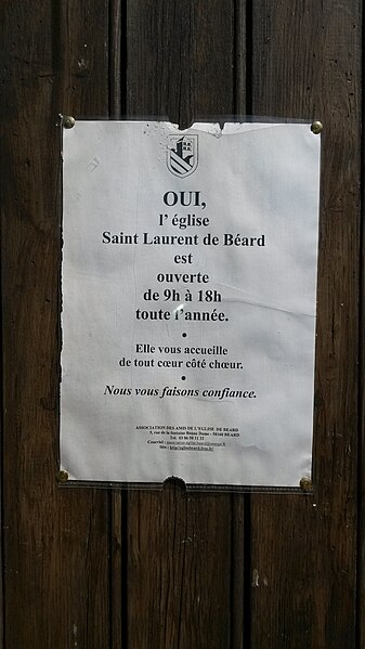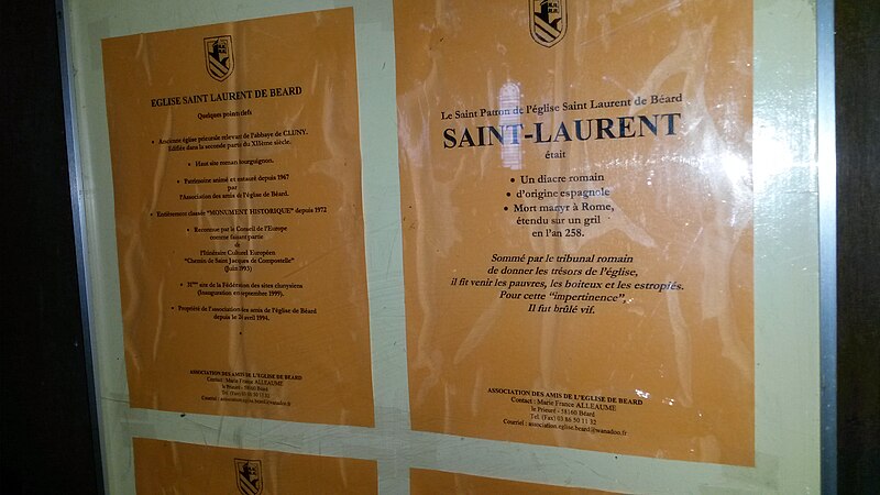 L'église Saint-Laurent, de culte catholique, se trouve à Béard dans la Nièvre, en Bourgogne-Franche-Comté, au n°2 de la rue de la Fontaine-Bonne-Dame, sur un promontoire dominant la Loire rive droite ; elle est ouverte de 9 h à 18 h toute l'année et est éclairée en été et pour les principales fêtes religieuses. Elle est mentionnée comme cure dans les comptes de l'évêché de Nevers en 1287 et, dans le pouillé de 1478, son titulaire était nommé par le prieur de Lurcy-le-Bourg ; Beardum devait alors la somme de 10 sols au titre de l'impôt ecclésiastique et l'édifice était facilement repérable pour les pèlerins venant de Vézelay vers Saint-Jacques-de-Compostelle. Pillée pendant la Révolution par une colonne envoyée dans la Nièvre, elle perdit ses cloches, statues et objets du culte, fut vendue comme bien national puis transformée en grange, ce qui la sauva de la destruction ; elle a subi de nombreuses restaurations, notamment après un incendie qui l'a ravagée. De style roman bourguignon, elle présente un plan basilical à une seule nef, un transept saillant et deux chapelles orientées en hémicycle ; la croisée du transept est surmontée d'une coupole sur trompes et d'une tour-clocher. L'édifice est orienté avec un décalage de 18°, conformément à la fête de Saint-Laurent le 10 août. Les éléments conservés permettent de situer la construction au XIe siècle : plan, joints épais en bandeau, claveaux réguliers et contreforts peu épais témoignent de cette datation, et la mise en œuvre révèle un savoir-faire des décennies 1190-1110 ; l'édifice a été réalisé selon le nombre d'or en pierre de Montenoison à grain très fin. L'église primitive comportait une nef unique, plus large que l'actuelle, séparée par un arc diaphragme encadré de passages hauts et étroits donnant sur un transept très large, avec une croisée de plan carré surmontée d'une coupole sur trompes et des bras voûtés en berceau ; le chevet à abside était peut-être précédé d'une travée droite et de deux absidioles ouvrant sur les bras du transept, et des traces de peintures sont encore visibles à la croisée. À l'extérieur subsistent quelques décors sculptés, notamment des bandeaux et des modillons. Lors d'une reconstruction, l'architecte a découpé l'espace en carrés égaux — trois pour la nef et trois pour le transept, de même longueur, soit 30 mètres — et l'abside principale a pris une forme carrée. L'édifice a été classé au titre des monuments historiques en 1972. La tour-clocher, carrée et à deux étages, présente sur chaque face deux baies géminées à double ouverture ; située à la croisée du transept, elle porte encore des traces de l'incendie de 1359, souvenir de la guerre de Cent Ans, et les absidioles ont été refaites, l'une ayant été entièrement détruite auparavant.