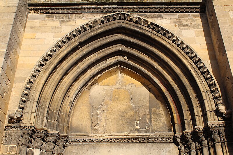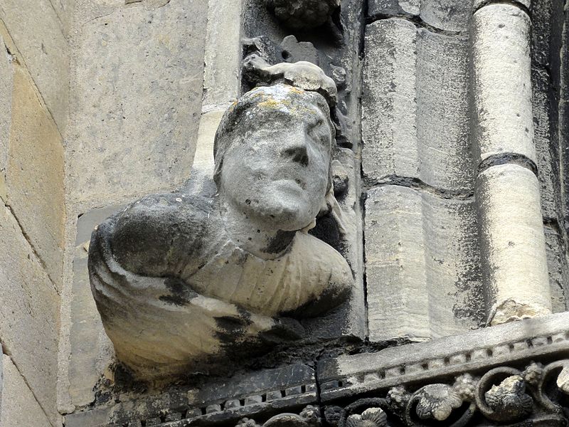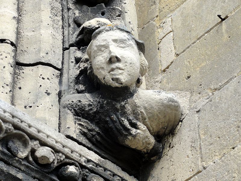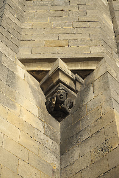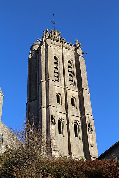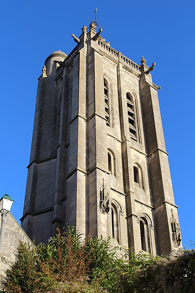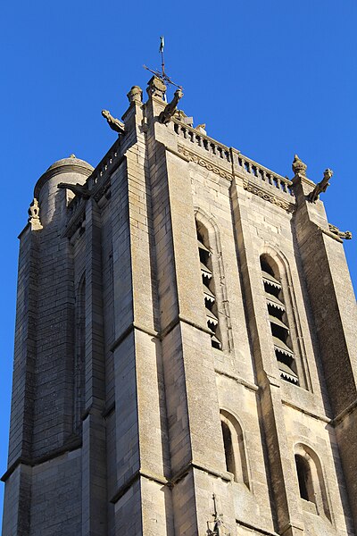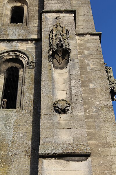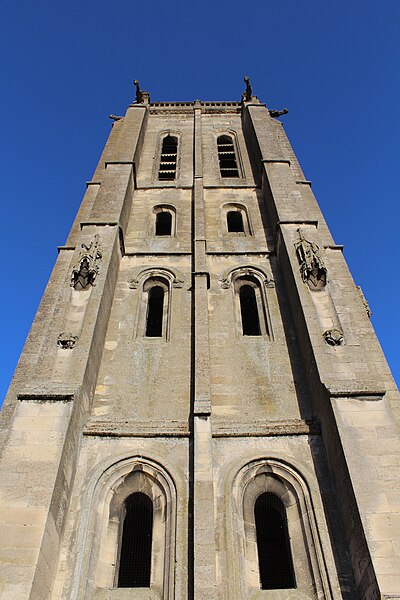La façade occidentale, sobre, se compose d’un portail en tiers-point inscrit dans une quadruple archivolte retombant sur colonnettes aux chapiteaux à crochets, et d’un triplet de baies en arc brisé ; la reconstruction du pignon a altéré une partie de son caractère authentique. Le clocher carré de style Renaissance présente quatre niveaux, des contreforts verticaux à chaque angle, des baies plein cintre ajourées et des ornements variés : niches à dais flamboyants, mascarons, rinceaux, urnes sculptées, dôme en pierre surmonté d’un lanternon flanqué de dauphins et de chimères. La présence conjointe d’éléments gothiques et Renaissance fait penser qu’il a été élevé au cours du second tiers du XVIe siècle. Le premier étage abrite une grosse cloche installée en 1820.