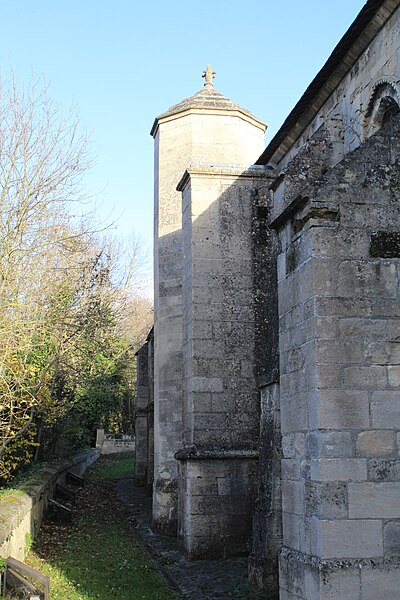 Le chœur, plus bas que la nef et bien proportionné, comporte deux travées rectangulaires couvertes par une voûte sexpartite et une travée carrée à l’est sous une voûte différente ; les colonnes et leurs chapiteaux, aux larges feuilles plates préfigurant les crochets gothiques, sont d’un grand intérêt artistique. La troisième travée forme une abside carrée sans bas-côtés ; les restaurations de 1879 et les interventions de 1897 ont toutefois modifié son authentique configuration, en remplaçant le triplet du chevet par une grande baie unique et en appliquant des arcatures décoratives sur les murs latéraux. Dans l’ensemble, le chœur évoque, par sa voûte sexpartite et sa sculpture sobre, l’église Saint-Julien-le-Pauvre de Paris, et certains spécialistes le situent autour des années 1150–1160.