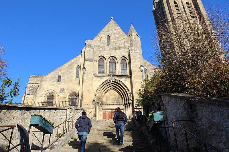 Le plan de l’église, influencé par Notre-Dame de Paris, comprend une nef de six travées sans transept, accompagnée de bas-côtés doubles, et un chœur de trois travées à chevet plat également bordé de bas-côtés doubles, la troisième travée restant libre. Les bas-côtés sont homogènes, sauf aux cinquième et sixième travées du second bas-côté nord, où des piliers massifs matérialisent la base de l’ancien clocher. Le clocher actuel s’élève à droite de la façade, près des premières travées du second bas-côté sud, et une sacristie a été ajoutée devant les septième et huitième travées de ce collatéral. L’accès se fait par le portail occidental ou par un petit portail latéral à droite ; la toiture de la nef est à deux pans et les bas-côtés sont couverts d’appentis adossés.