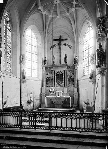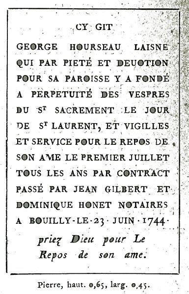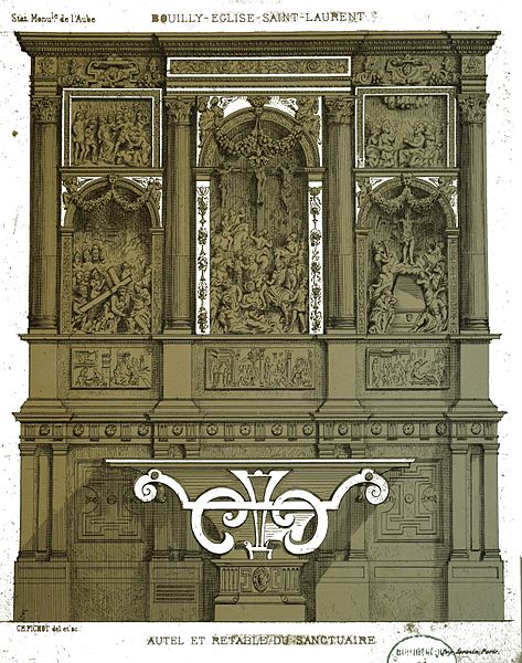 L'église Saint-Laurent se situe à Bouilly, dans le département de l'Aube, en France. Sa construction a commencé en 1515. L'édifice, classé au titre des monuments historiques le 14 avril 1909, abrite de nombreux objets remarquables. Parmi eux, un retable en panneaux sculptés du XVIe siècle, inséré dans un montage du XIXe siècle au-dessus d'un autel réalisé par le sculpteur troyen François Joseph Valtat. On y conserve également plusieurs sculptures en calcaire polychrome — dont une Vierge à l'Enfant du XVIe siècle dorée, un saint Hubert, un Christ de pitié, un saint Sébastien, une Vierge de pitié et une Sainte Marguerite terrassant le dragon — ainsi qu'une Vierge à l'Enfant du XIIIe siècle. Une Éducation de Marie en chêne datée du XVIe siècle complète cet ensemble d'œuvres. Elle est la plus grande église de l'arrondissement de Troyes. Très endommagée par un incendie en 1702, elle n'a été réparée que près d'un siècle après. L'édifice présente un plan en croix latine, une voûte sur l'ensemble de la nef à l'exception du porche, et une abside à cinq pans. On sait qu'il possédait encore son jubé au milieu du XVIIIe siècle. Depuis le milieu du XXe siècle, plusieurs opérations de consolidation et de remise en état ont été menées. La commune de Bouilly fait partie de la paroisse « de Bouilly Moussey », l'une des six paroisses de l'espace pastoral « Forêts d’Othe et d’Armance » au sein du diocèse de Troyes, et l'église Saint-Laurent en est le lieu de culte paroissial. Elle dépendait auparavant du Grand-doyenné de Troyes et avait Souligny comme dépendance ; la cure était à la collation de l'évêque. Des photographies et documents présentent notamment Saint Marcoul, Sainte Marguerite, la plaque commémorative de fondation de Georges Hourseau Laisne, une baie, l'Éducation de Marie et les travaux de consolidation.