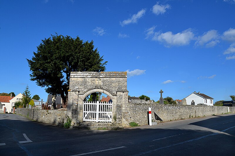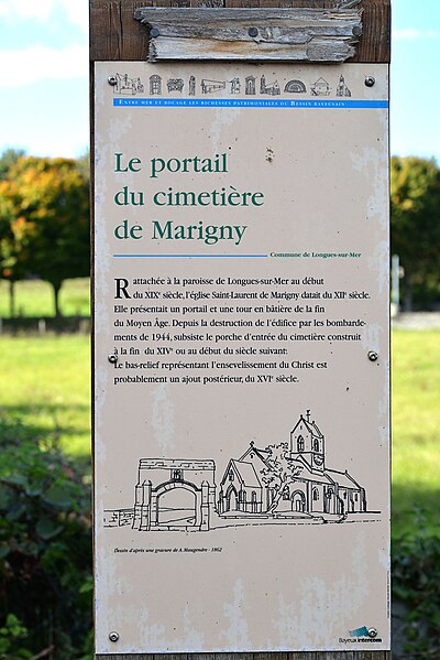 Le cimetière de Marigny est associé à l'église Saint-Laurent, une église catholique en ruines située à Longues-sur-Mer, dans le département du Calvados. L'édifice remonte au XVe siècle. La porte du cimetière est inscrite au titre des monuments historiques depuis le 22 octobre 1926. Le petit bourg de Marigny, où se situe le site, a été absorbé en 1861 par la commune de Longues-sur-Mer. Une notice figurant dans la Statistique monumentale du Calvados d'Arcisse de Caumont (t. 3, p. 607-610) signale ce monument.