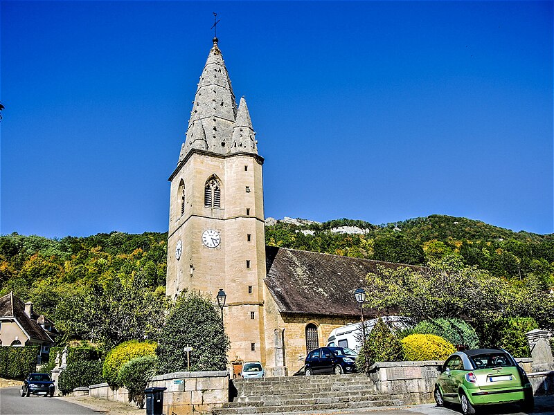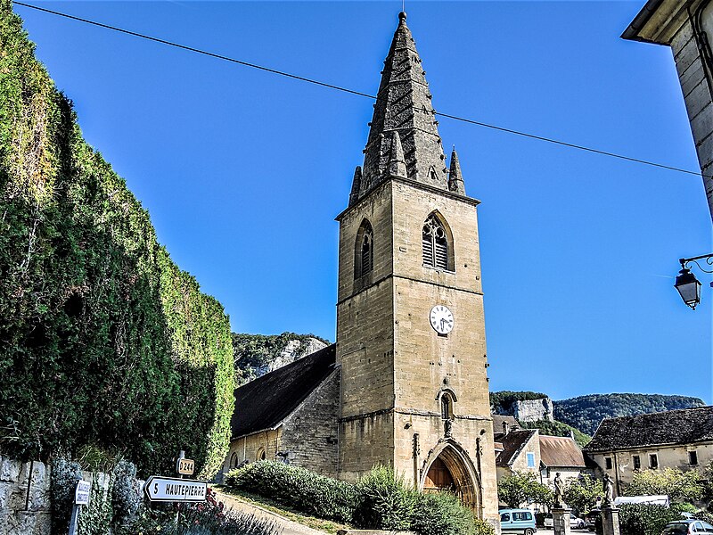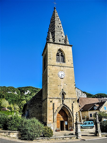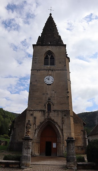 L'église paroissiale Saint-Laurent se situe à Mouthier-Haute-Pierre, dans le Doubs, et est dédiée à Laurent de Rome. Édifiée en 1390 à la limite du cimetière du prieuré, elle remplace une église antérieure dont la date de construction est inconnue. Une première phase d'agrandissement, commencée en 1512 par le maçon Claude d'Usié et attestée par une inscription sur le linteau de la porte sud, s'achève en 1521. Une seconde campagne de travaux débute en 1542 avec la construction du chœur ; la tour-clocher est quant à elle achevée en 1581. En 1747, les fenêtres gothiques de la nef sont détruites et un même toit couvre dorénavant la nef et les bas-côtés. Des marques de tâcheron subsistent sur la façade antérieure et sur la face latérale sud de la sacristie. L'édifice a été inscrit au titre des monuments historiques le 8 juin 1926 et restauré en 1957. L'église dépend de la paroisse d'Ornans, dite paroisse de la Haute Vallée de la Loue, rattachée au diocèse de Besançon.