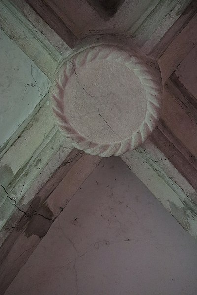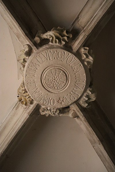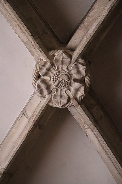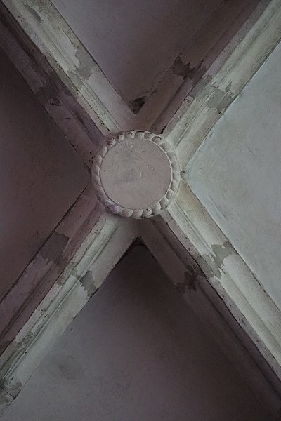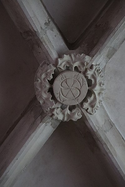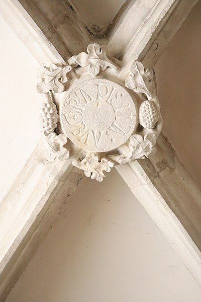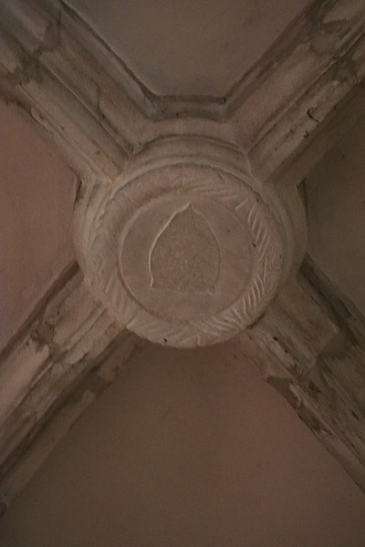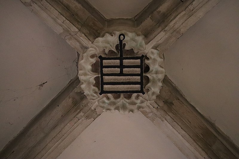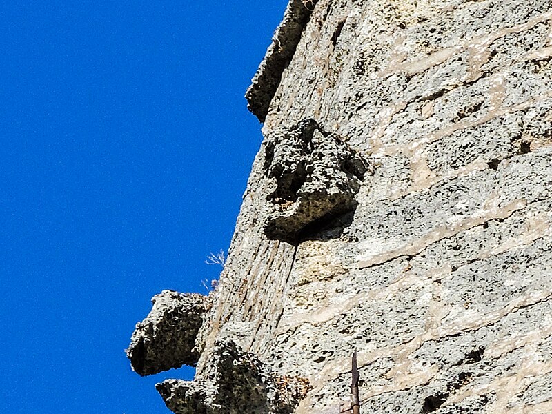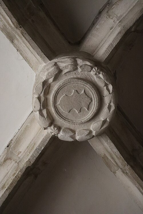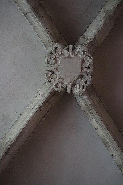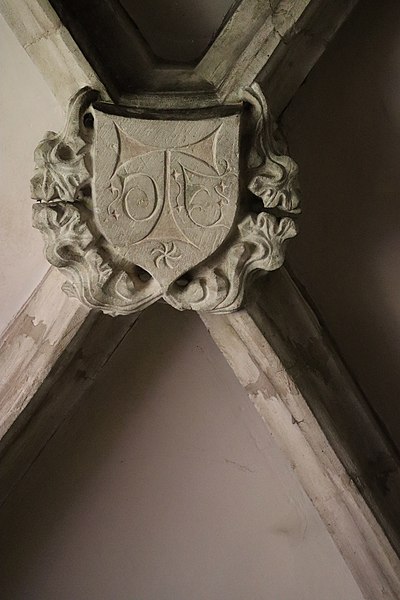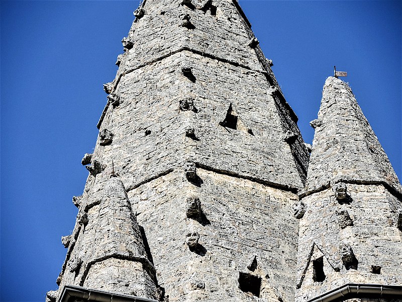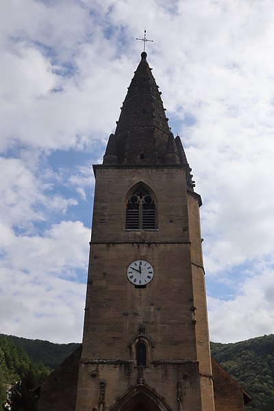 La tour-clocher, dont la flèche est en pierre tuf de la région, culmine à 43 mètres ; elle est ornée de têtes sculptées et coiffée de quatre clochetons, chaque face présentant des baies en tiers-point divisées par un meneau en deux lancettes. La nef est voûtée d'ogives gothiques.
