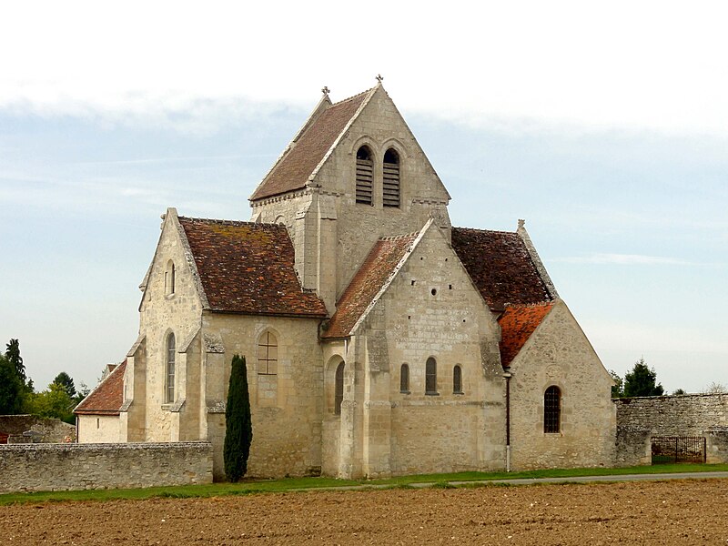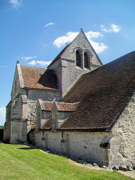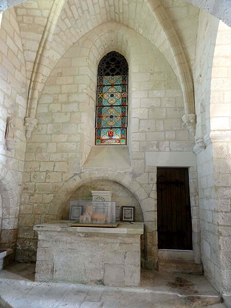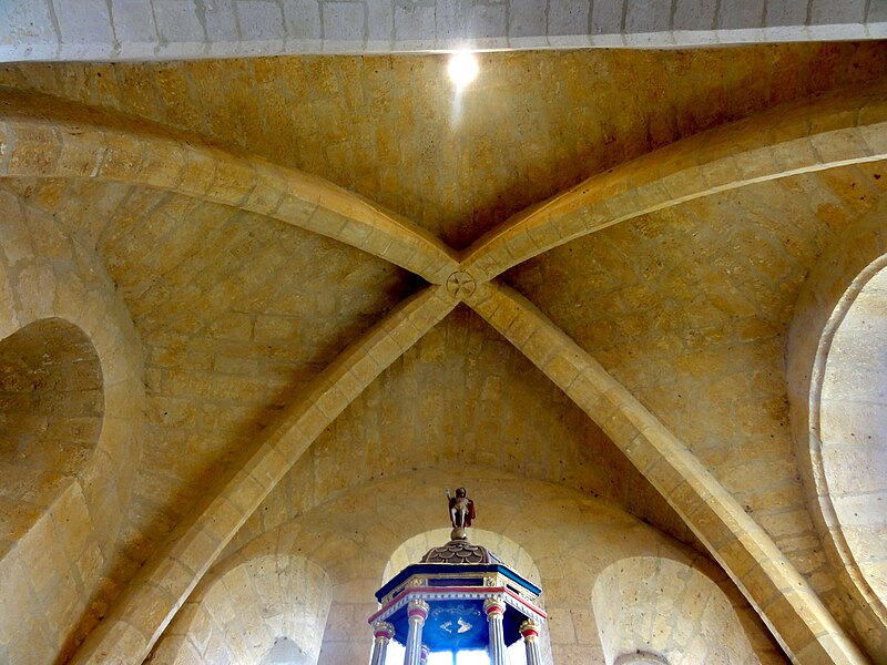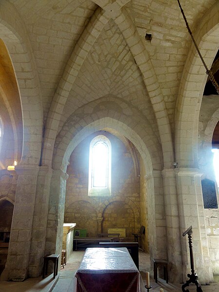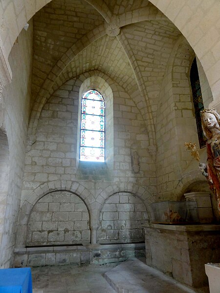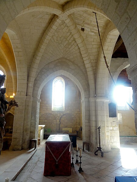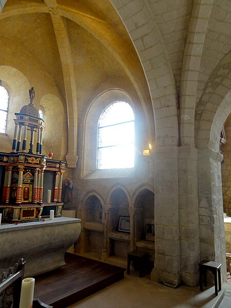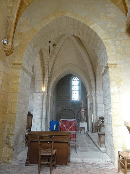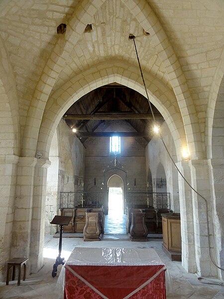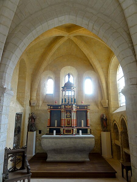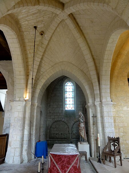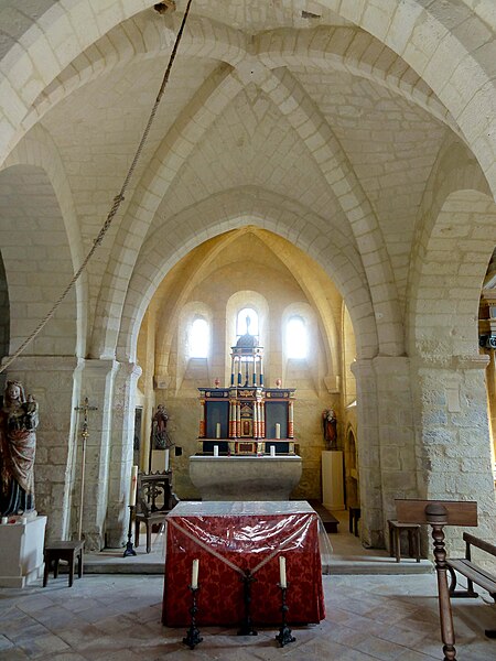 La base du clocher et l’abside forment le chœur proprement dit ; l’arc triomphal vers la nef est à simple rouleau et laisse apparaître une fenêtre primitive du clocher. Les ogives du chœur, d’un profil simple et assez massif, retombent sur des tailloirs au profil archaïque ; ces voûtes d’ogives, dépourvues de formerets et fortement bombées, appartiennent au petit groupe d’expérimentations anciennes de la voûte d’ogives dans la région. La clé de voûte de l’abside porte une simple croix de Malte en bas‑relief et l’éclairage du chœur associe une fenêtre romane au nord et un triplet au chevet, la grande baie sud ayant été repercée postérieurement.